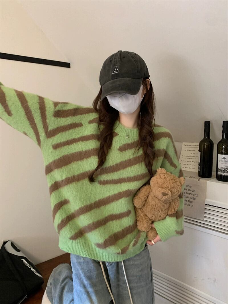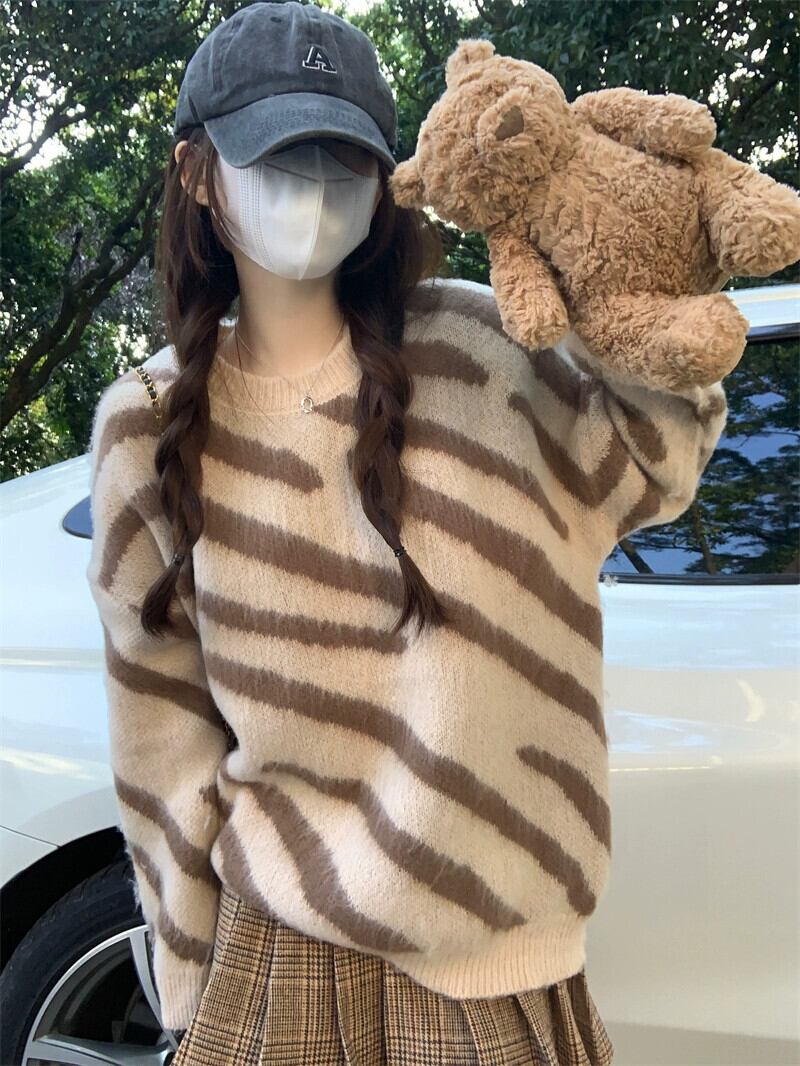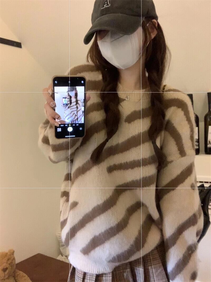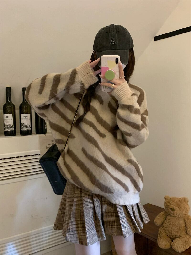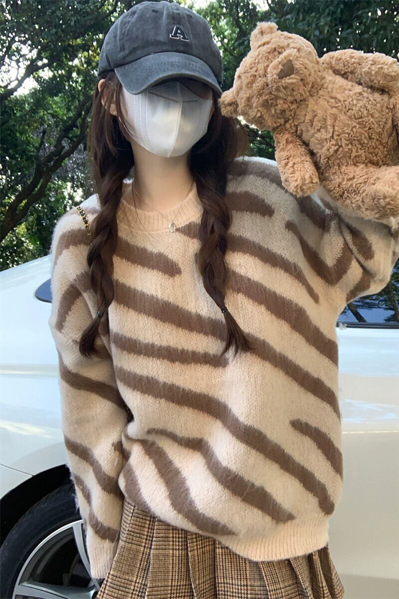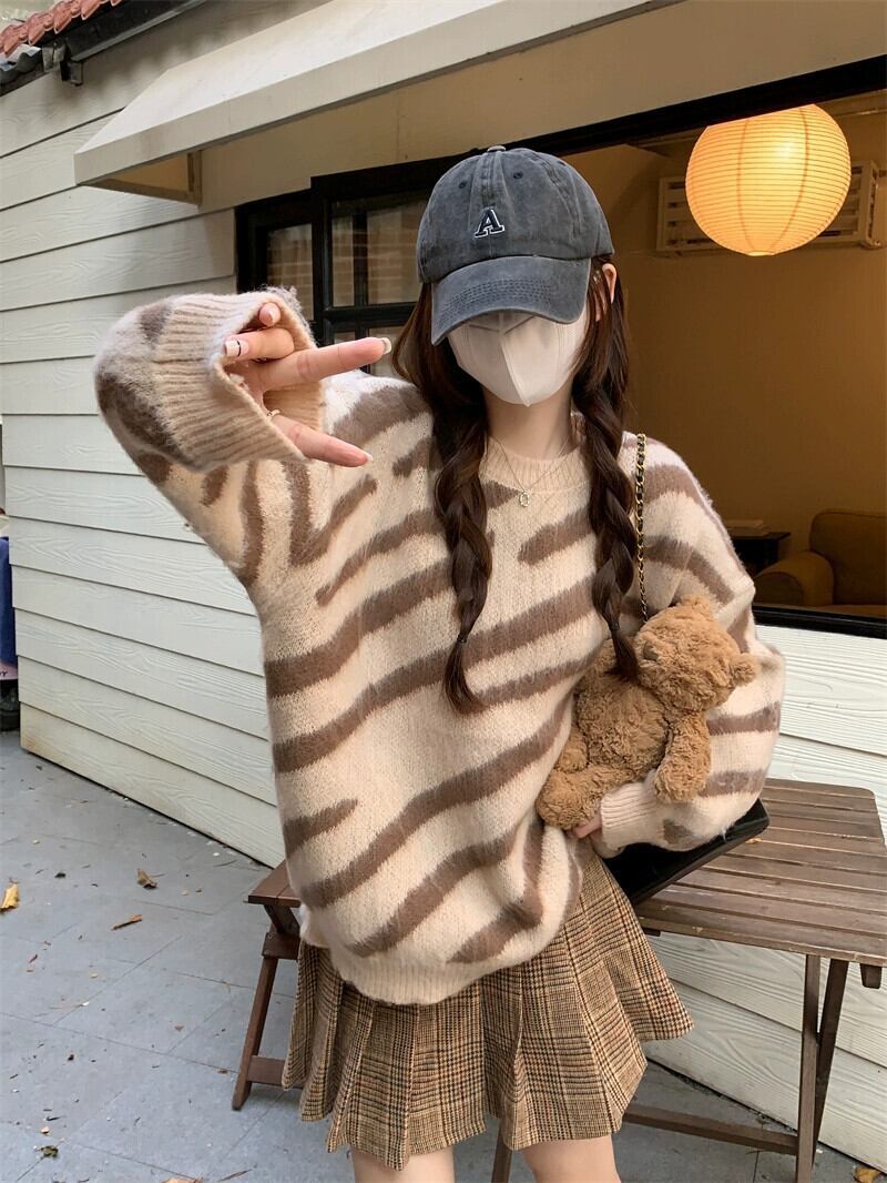怠惰なスタイルのソフトワックスゼブラストライプセーター女性の秋と冬のレトロなルーズアウターウェアミッドレングス肥厚長袖セーター ロング オータム 秋物 ウィンター 冬物 7460062097123961 | framboise21