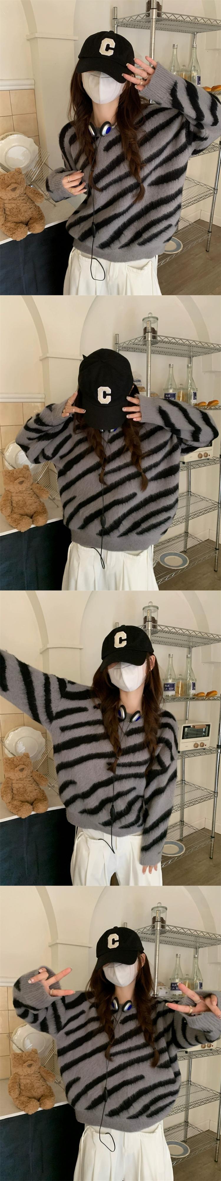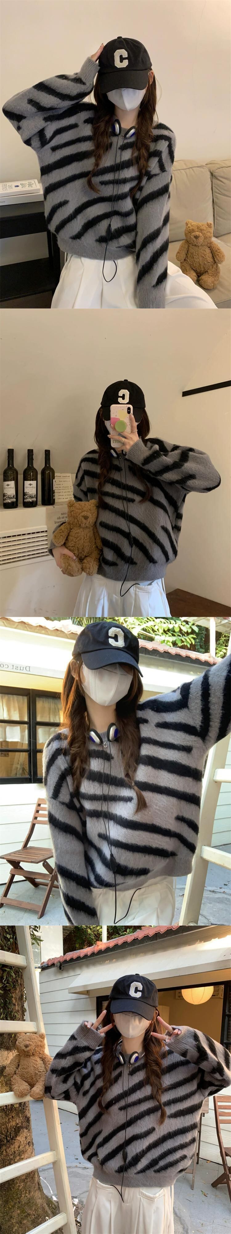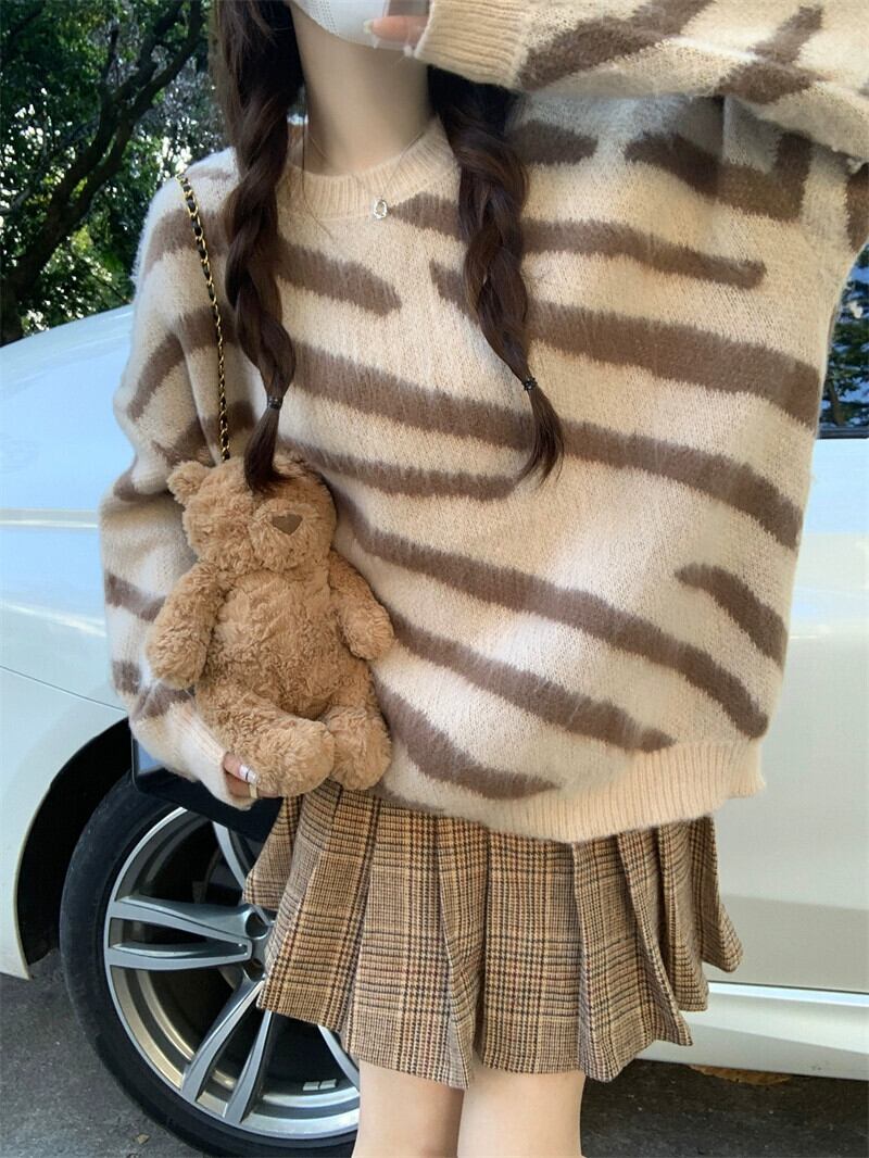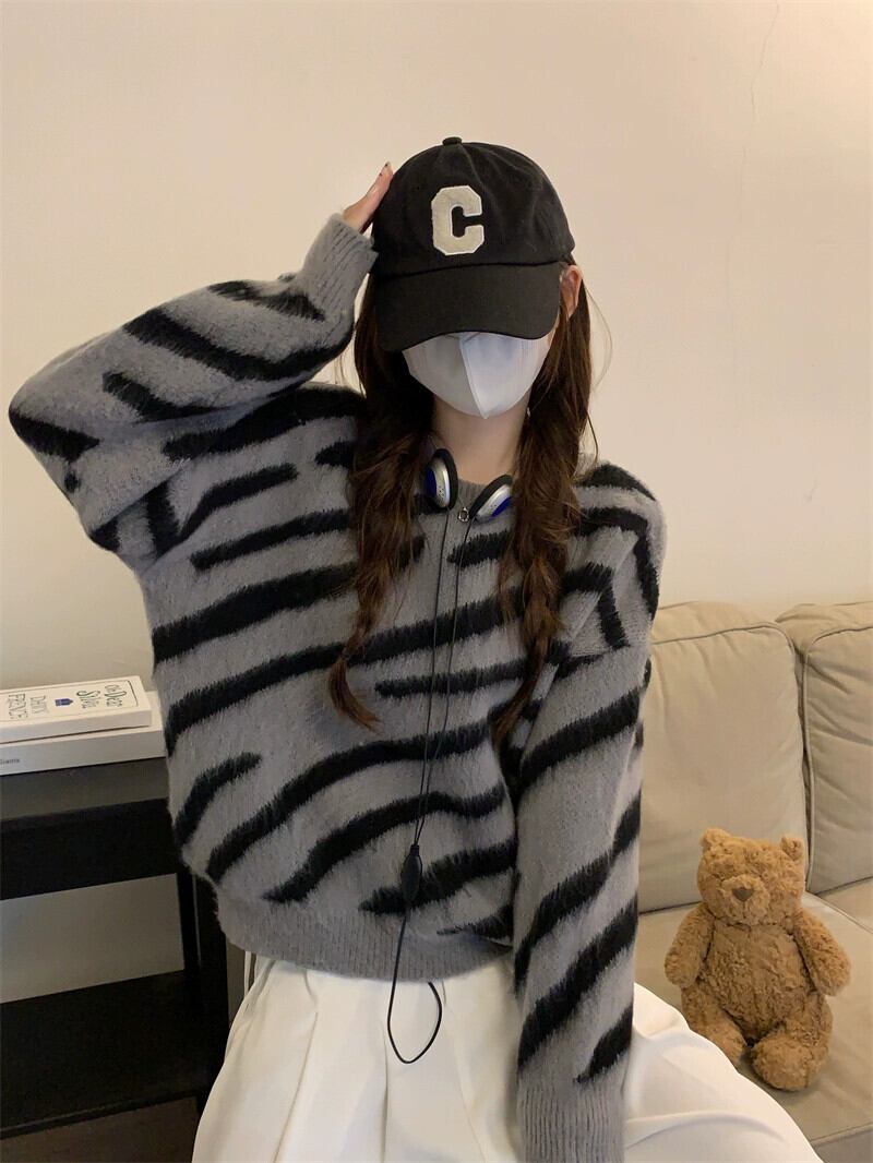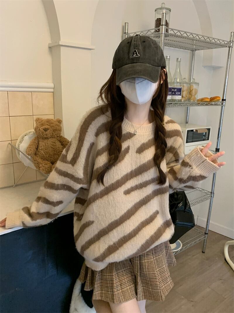 怠惰なスタイルのソフトワックスゼブラストライプセーター女性の秋と冬のレトロなルーズアウターウェアミッドレングス肥厚長袖セーター ロング オータム 秋物 ウィンター 冬物 7460062097123961 | framboise21
