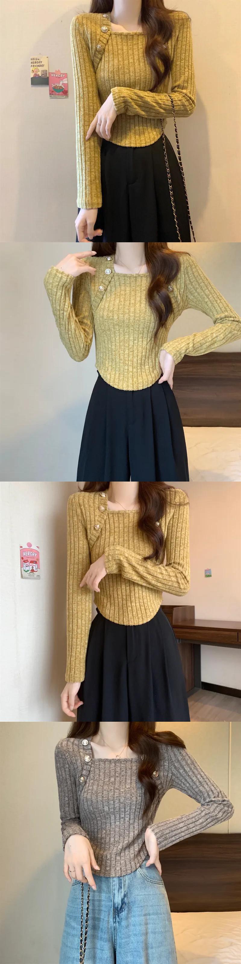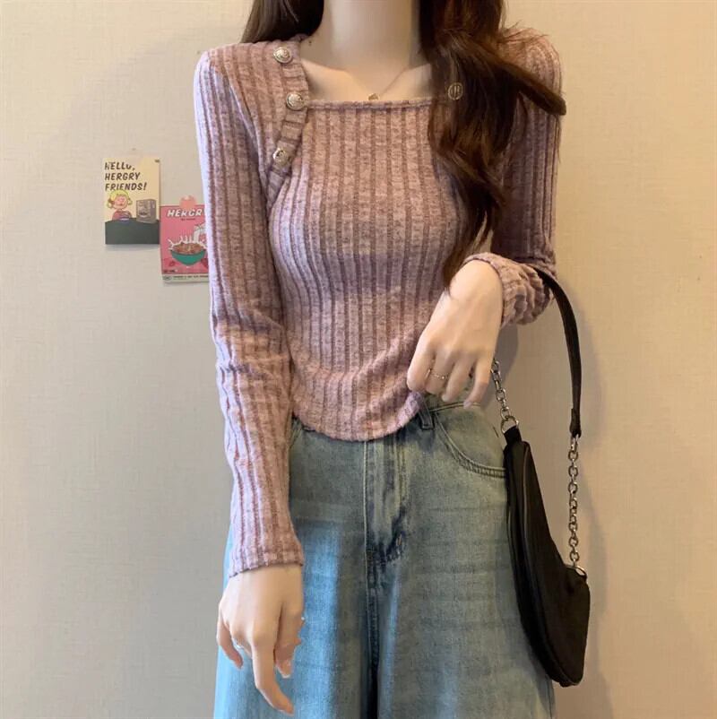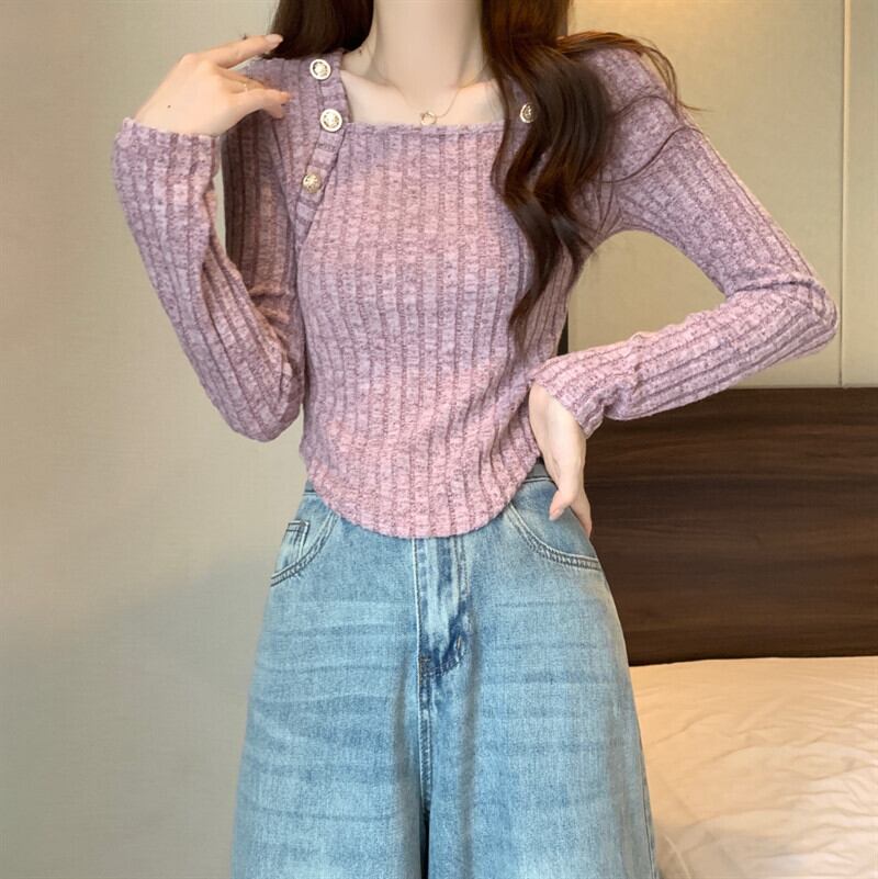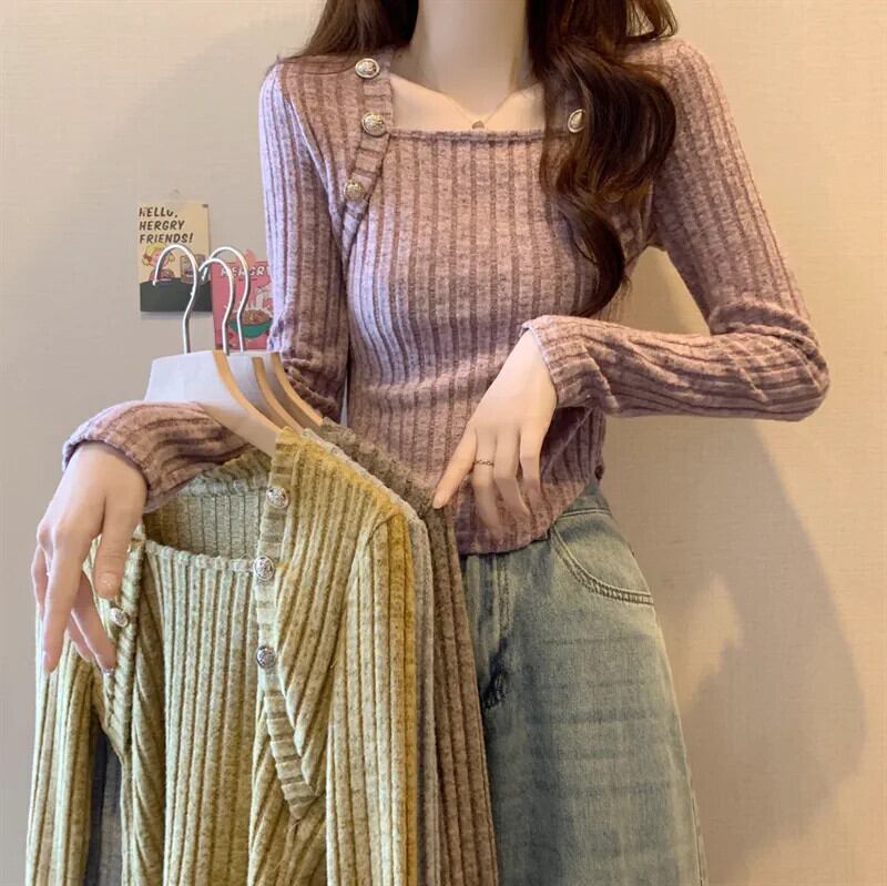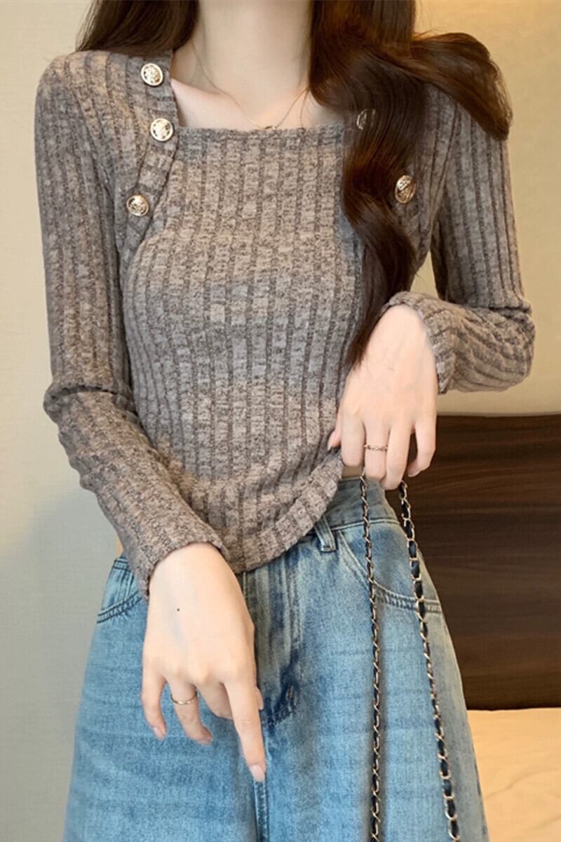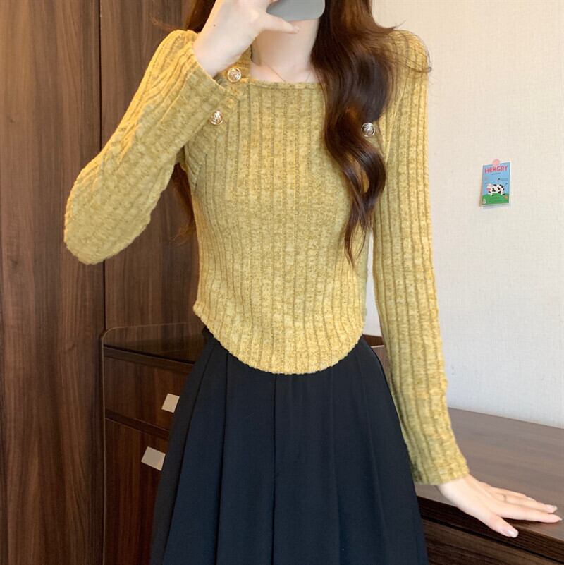 秋と冬の茶色のショートボトムシャツ女性、フェイクツーピーススクエアネックセーター、スリムフィット、長袖ニットトップ ロング オータム 秋物 ウィンター 冬物 スクウェア 74600606954450 | framboise21