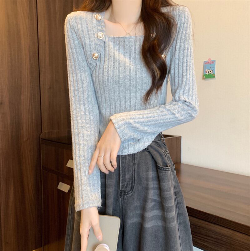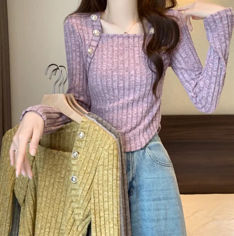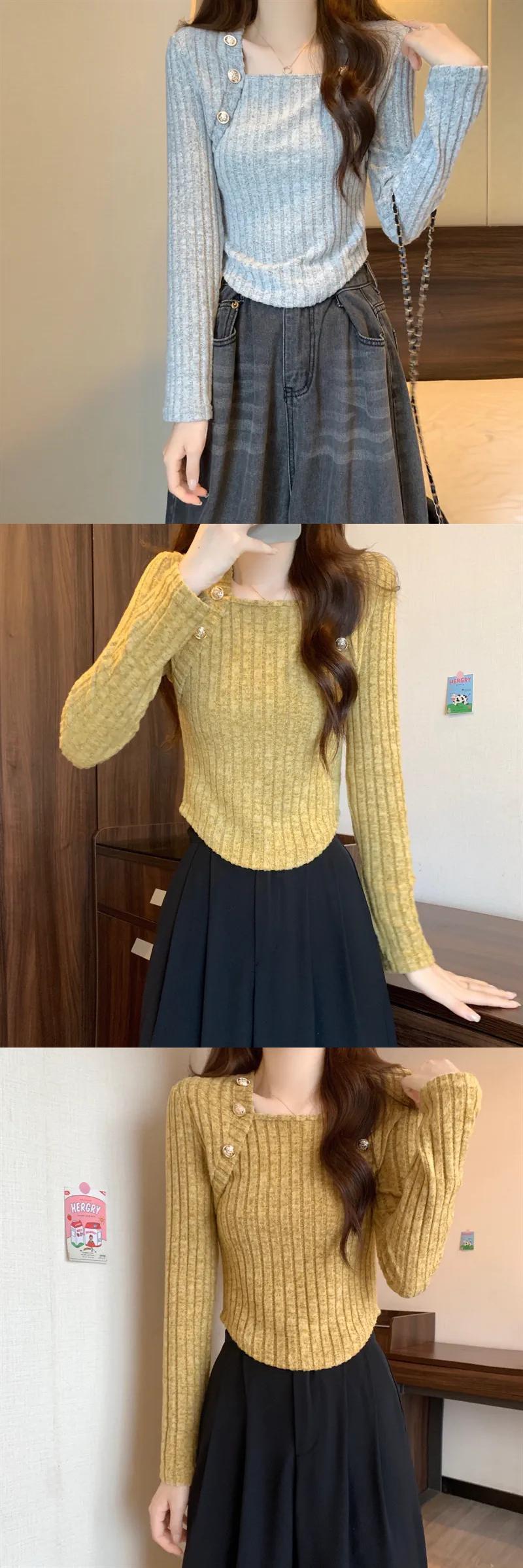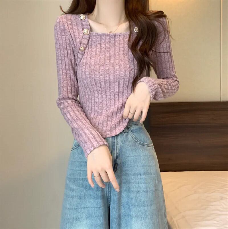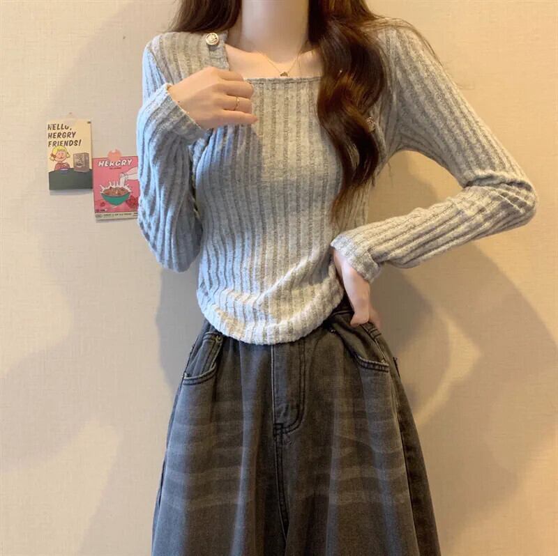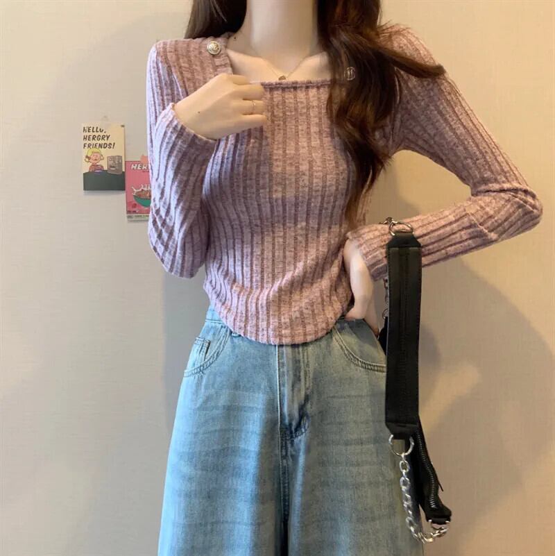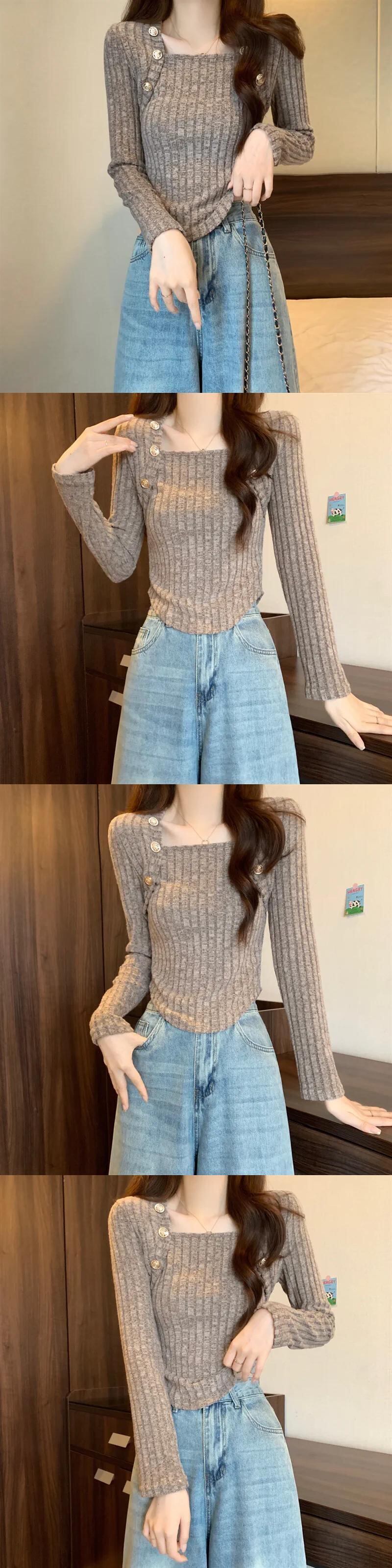 秋と冬の茶色のショートボトムシャツ女性、フェイクツーピーススクエアネックセーター、スリムフィット、長袖ニットトップ ロング オータム 秋物 ウィンター 冬物 スクウェア 74600606954450 | framboise21