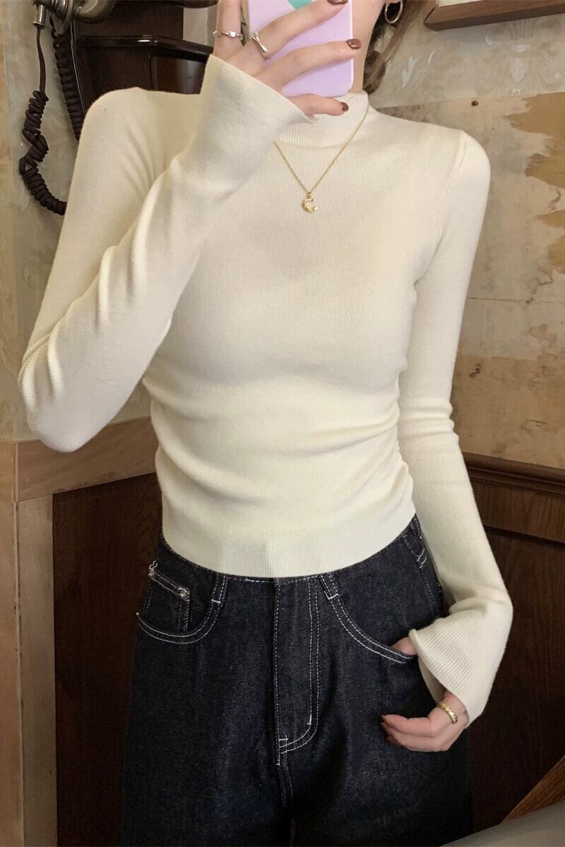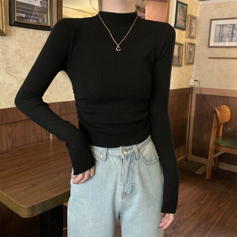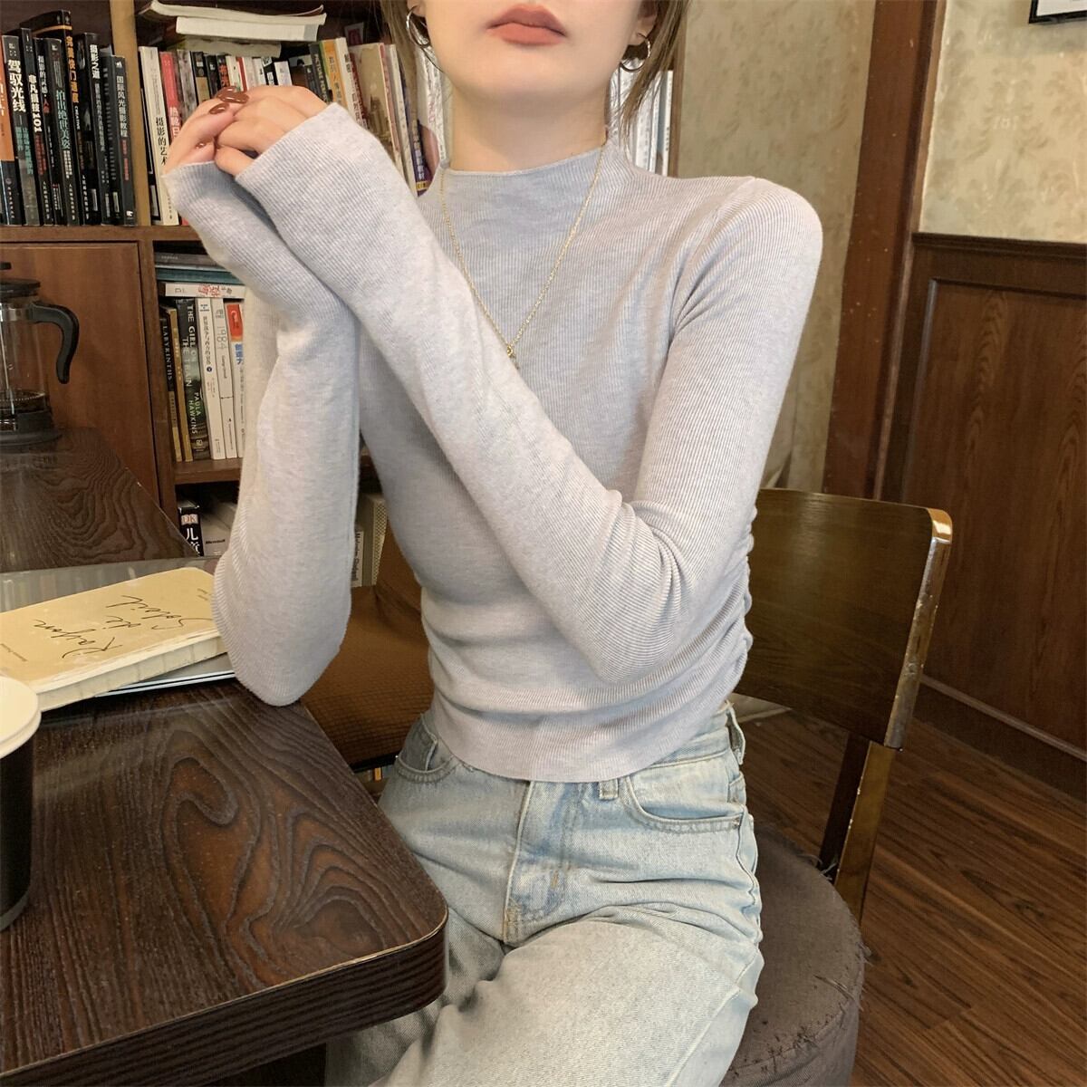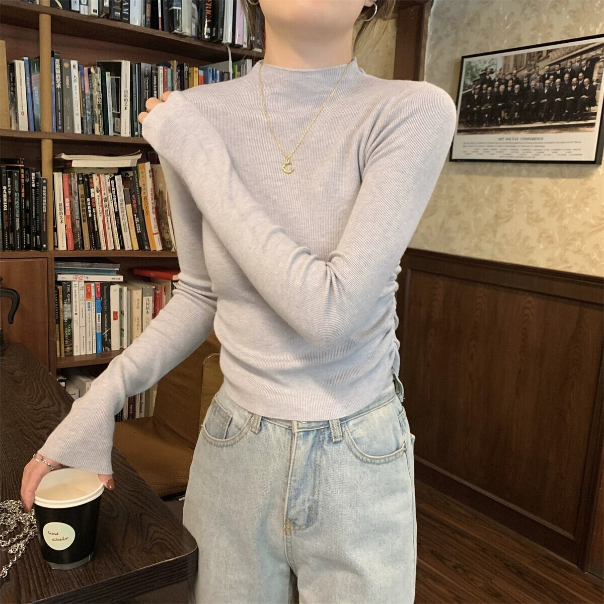 ハーフタートルネックニットボトムセーターレディース、秋冬スタイル、スリムフィット、不規則なプリーツプルオーバー長袖セーター ロング オータム 秋物 ウィンター 冬物 7460087795108666 | framboise21