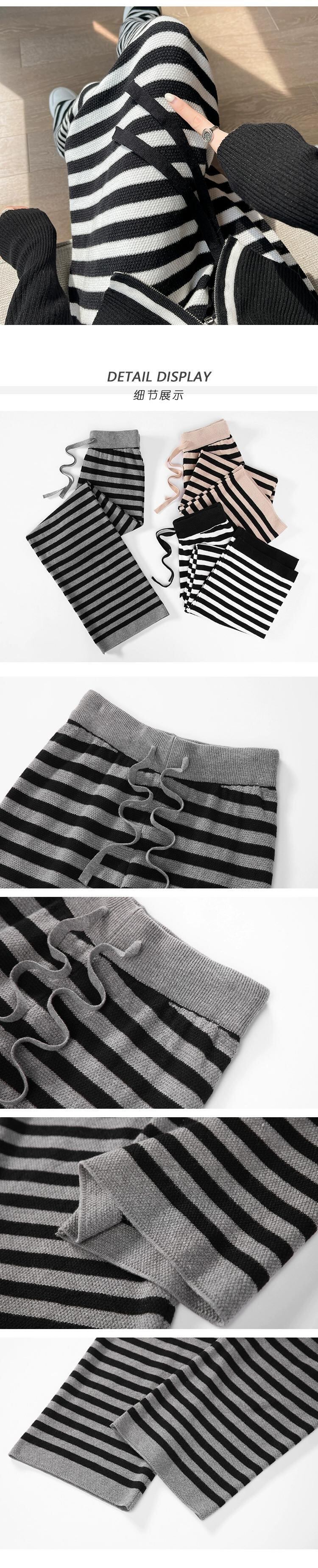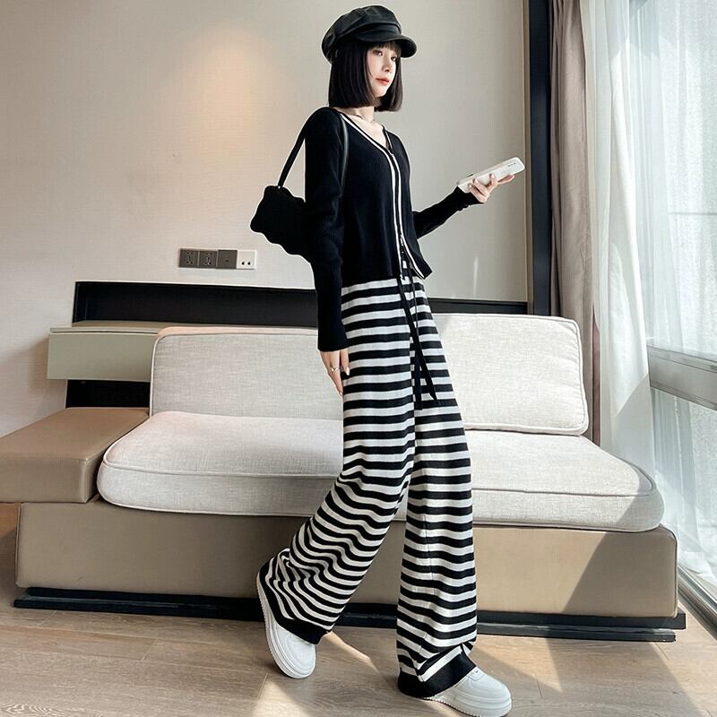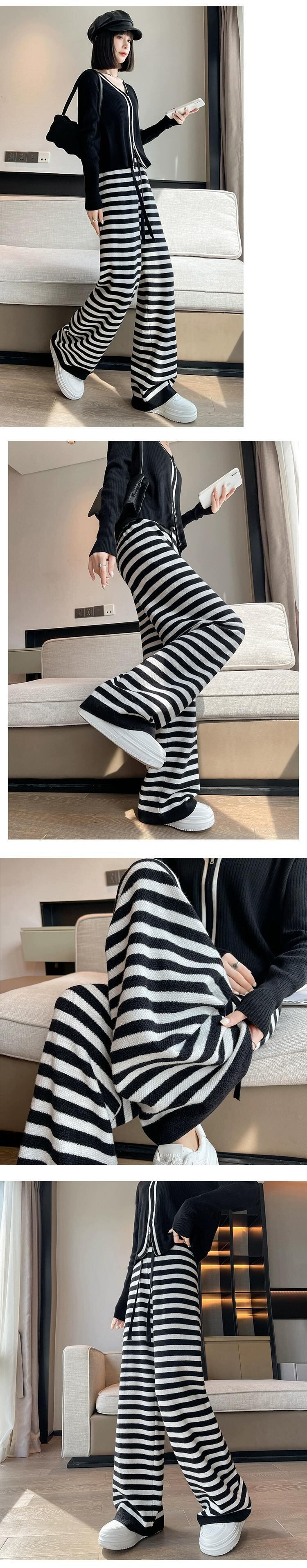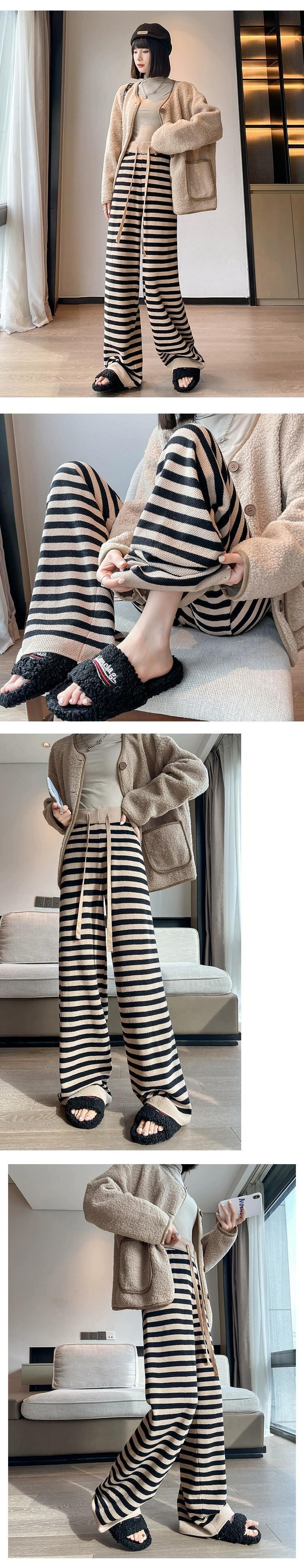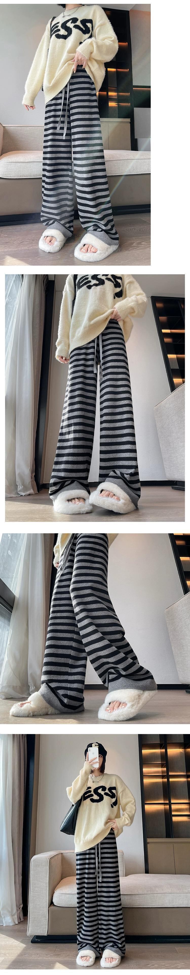 ストライプニットワイドレッグパンツレディース、秋冬ハイウエストもち米パンツ、ルーズ、スリム、多用途フロアレングスストレートカジュアルパンツ オータム 秋物 ウィンター 冬物 746009266163510 | framboise21