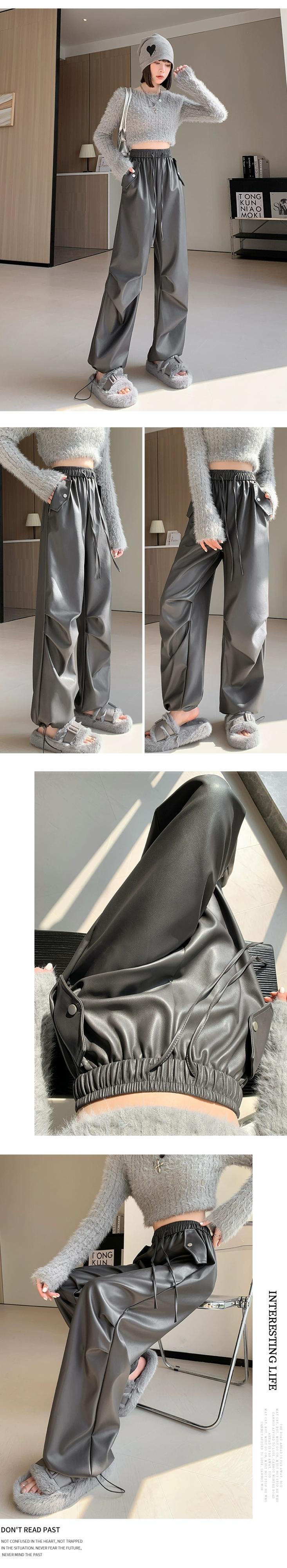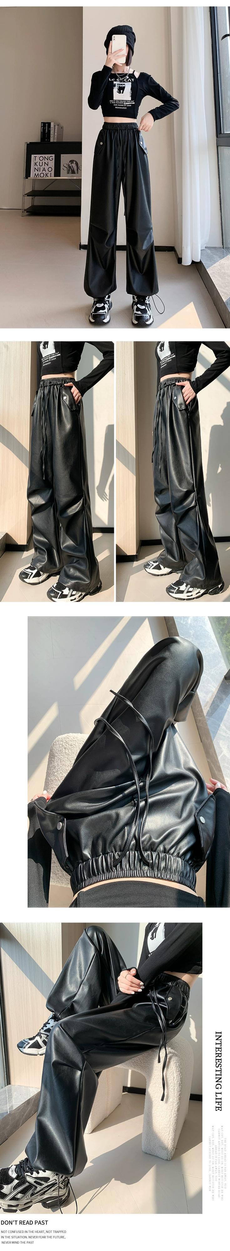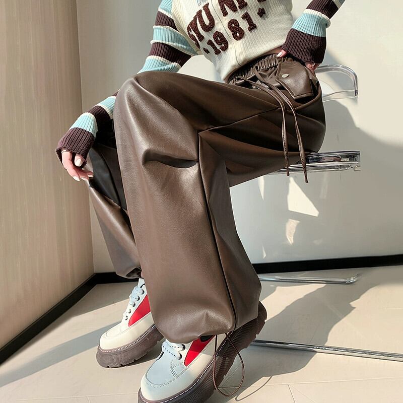 コーヒー色のPUレザーパンツ、ワイドレッグパンツレディース、秋冬ハイエンドアメリカンスタイルレギンスオーバーオール、ハイウエストストレートカジュアルパンツ レッド オータム 秋物 ウィンター 冬物 7460030700683175 | framboise21