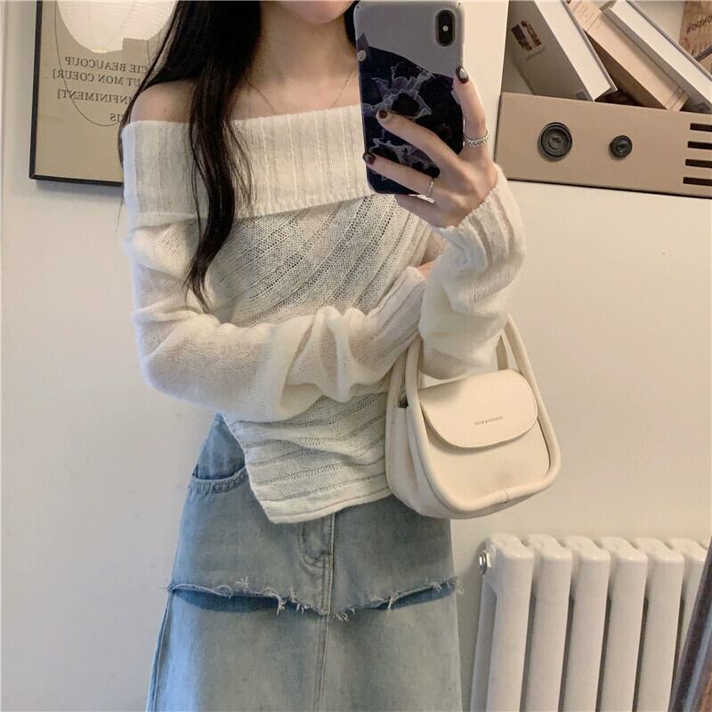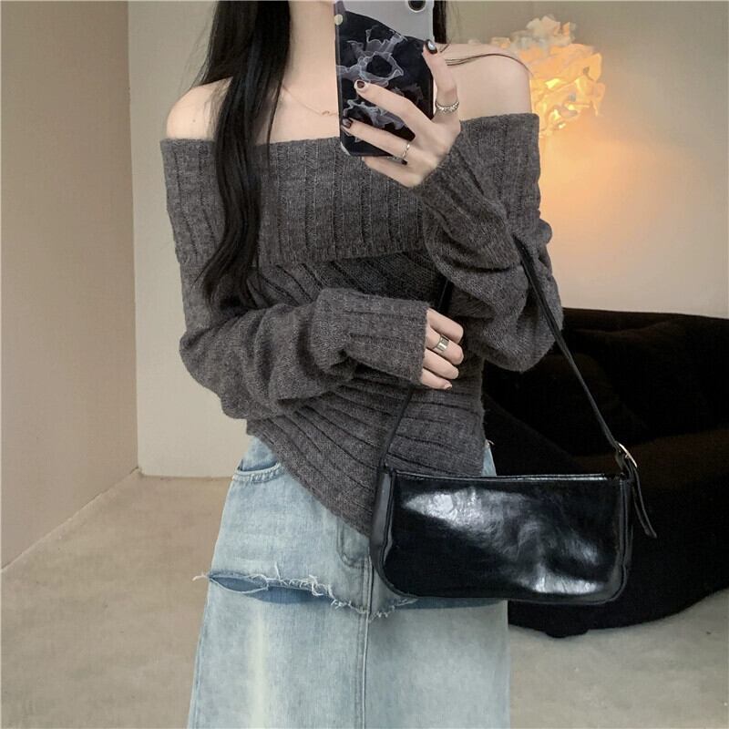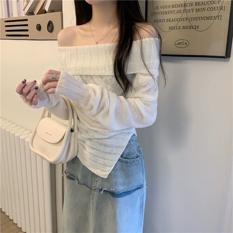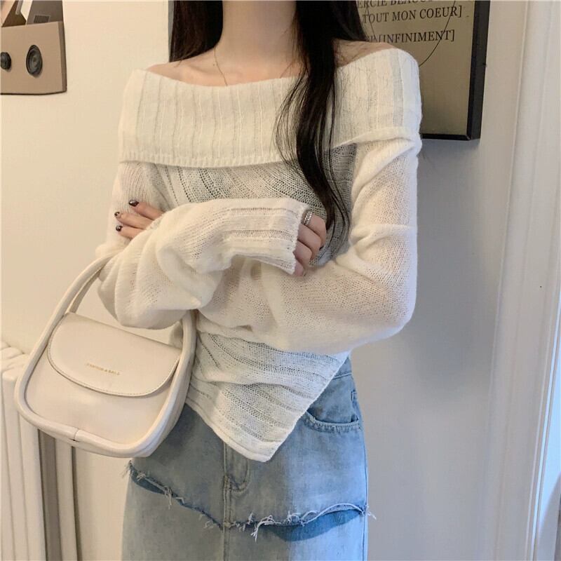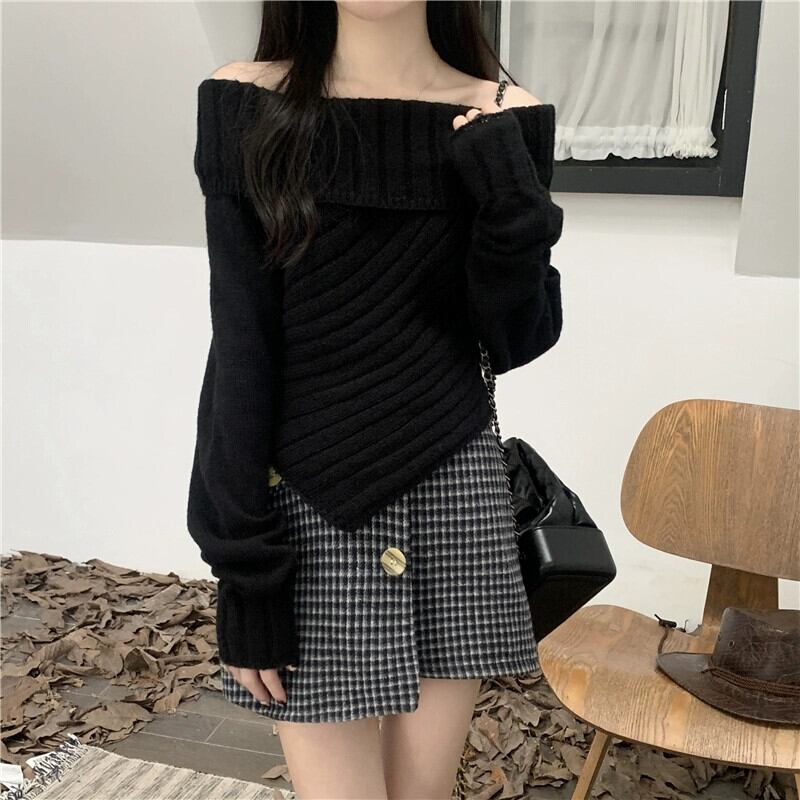 不規則なワンショルダーショートセーターレディース、秋冬スタイル、レトロなデザイン、スリムフィット、オフショルダー長袖セーター ロング オータム 秋物 ウィンター 冬物 7460079080431134 | framboise21