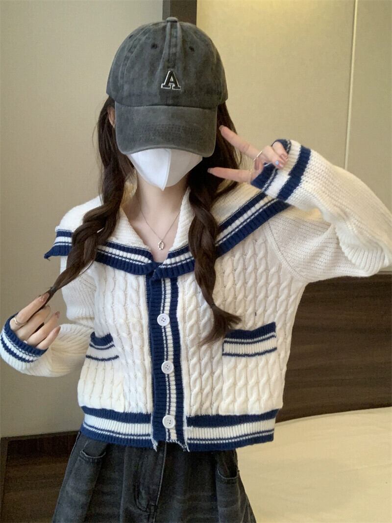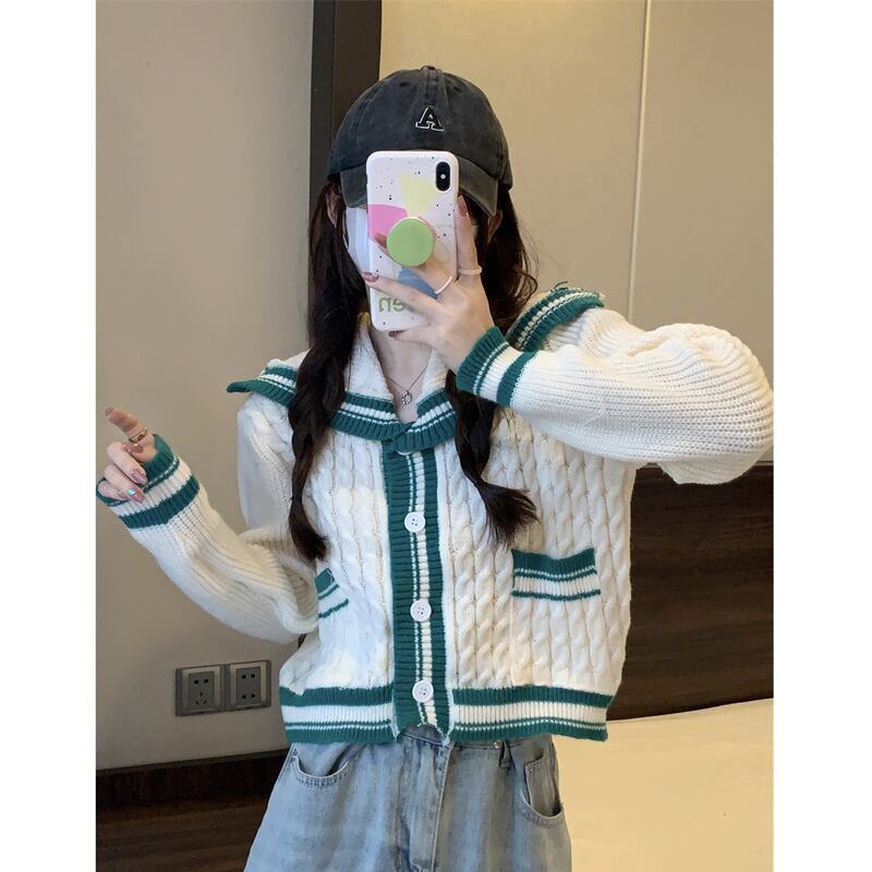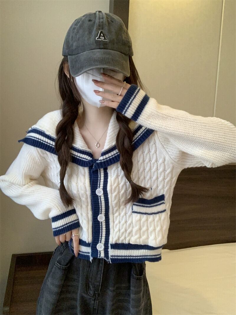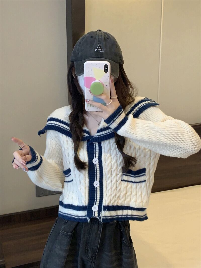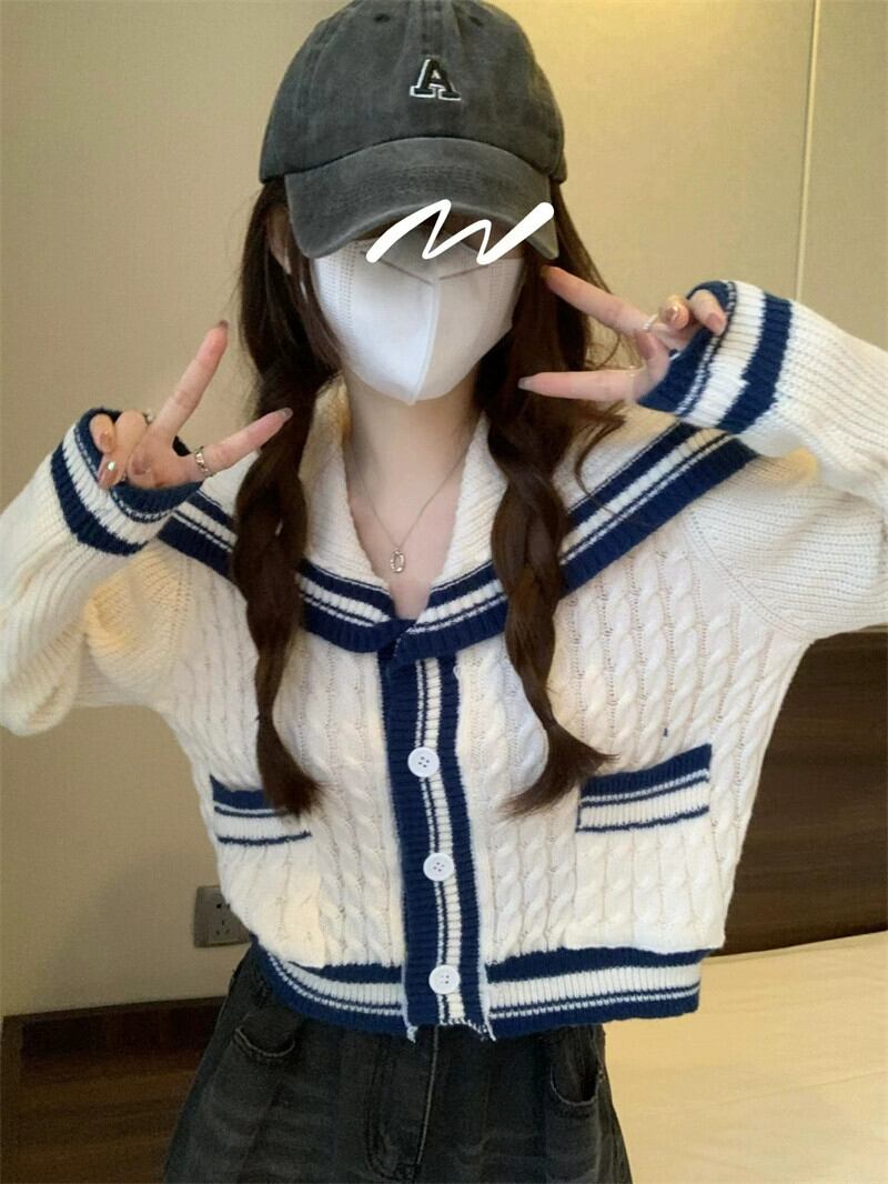 ネイビーカラーセーターカーディガンコート女性秋と冬 2023 新しいカレッジスタイルアウタールーズショートツイストニットウェア オータム 秋物 ウィンター 冬物 7460010872490746 | framboise21