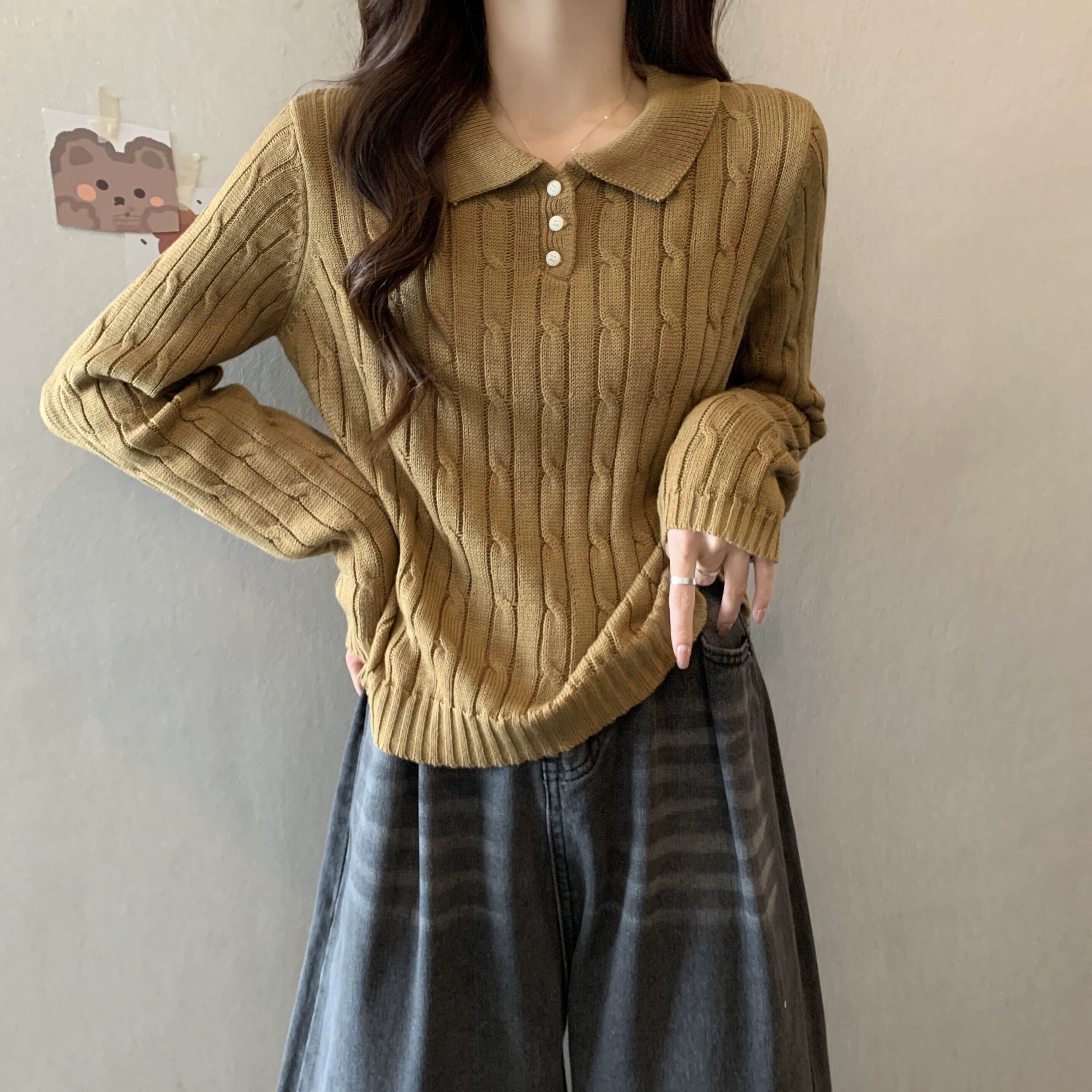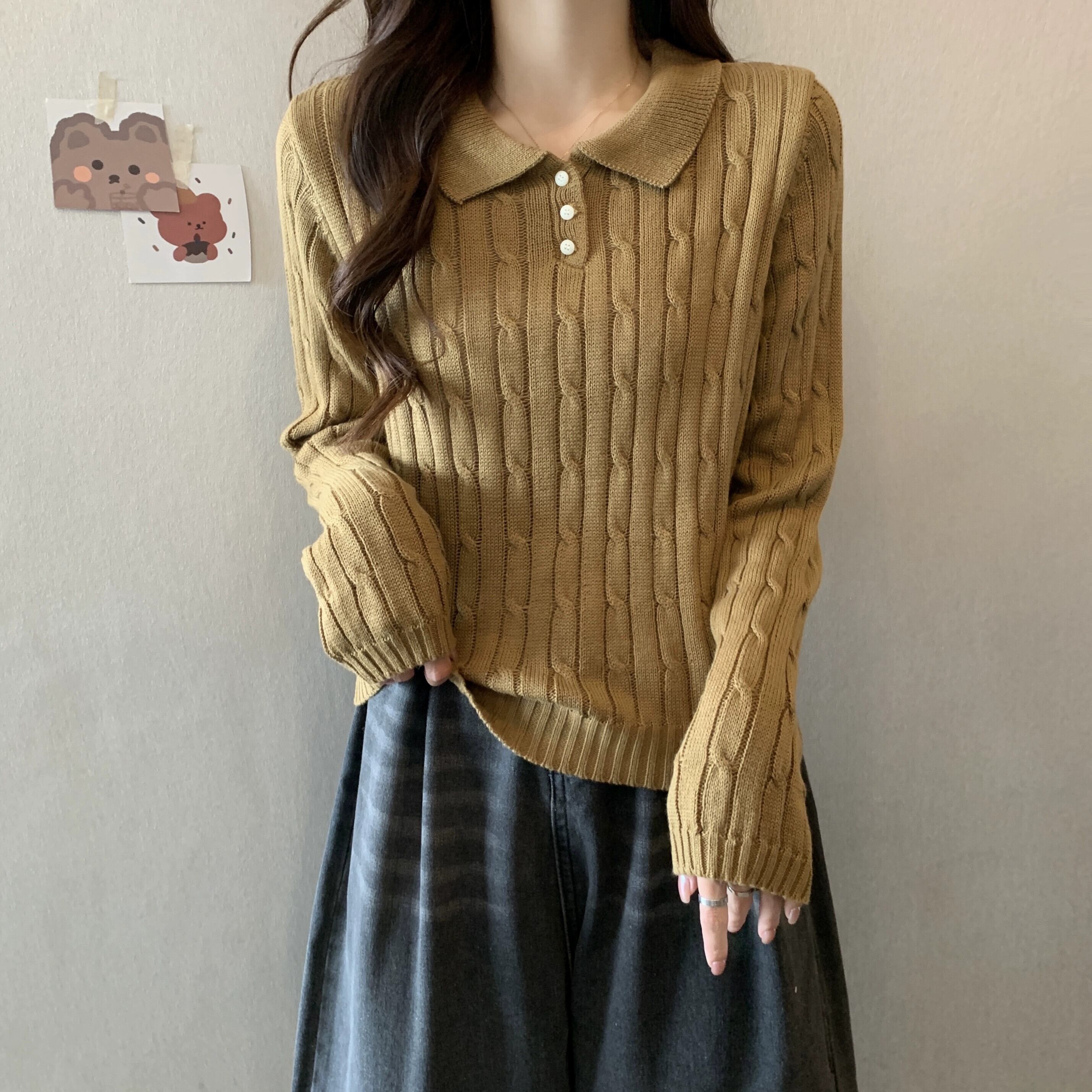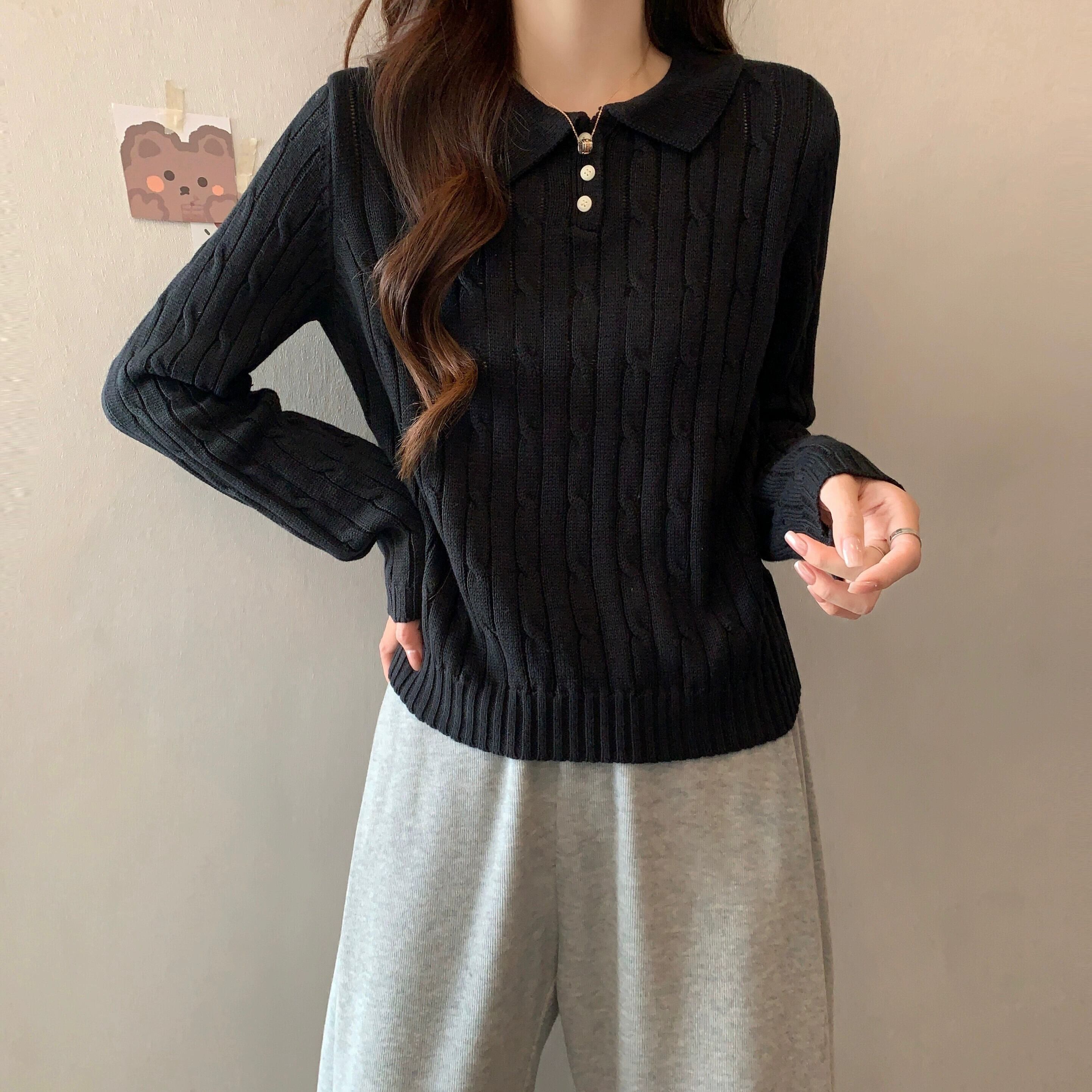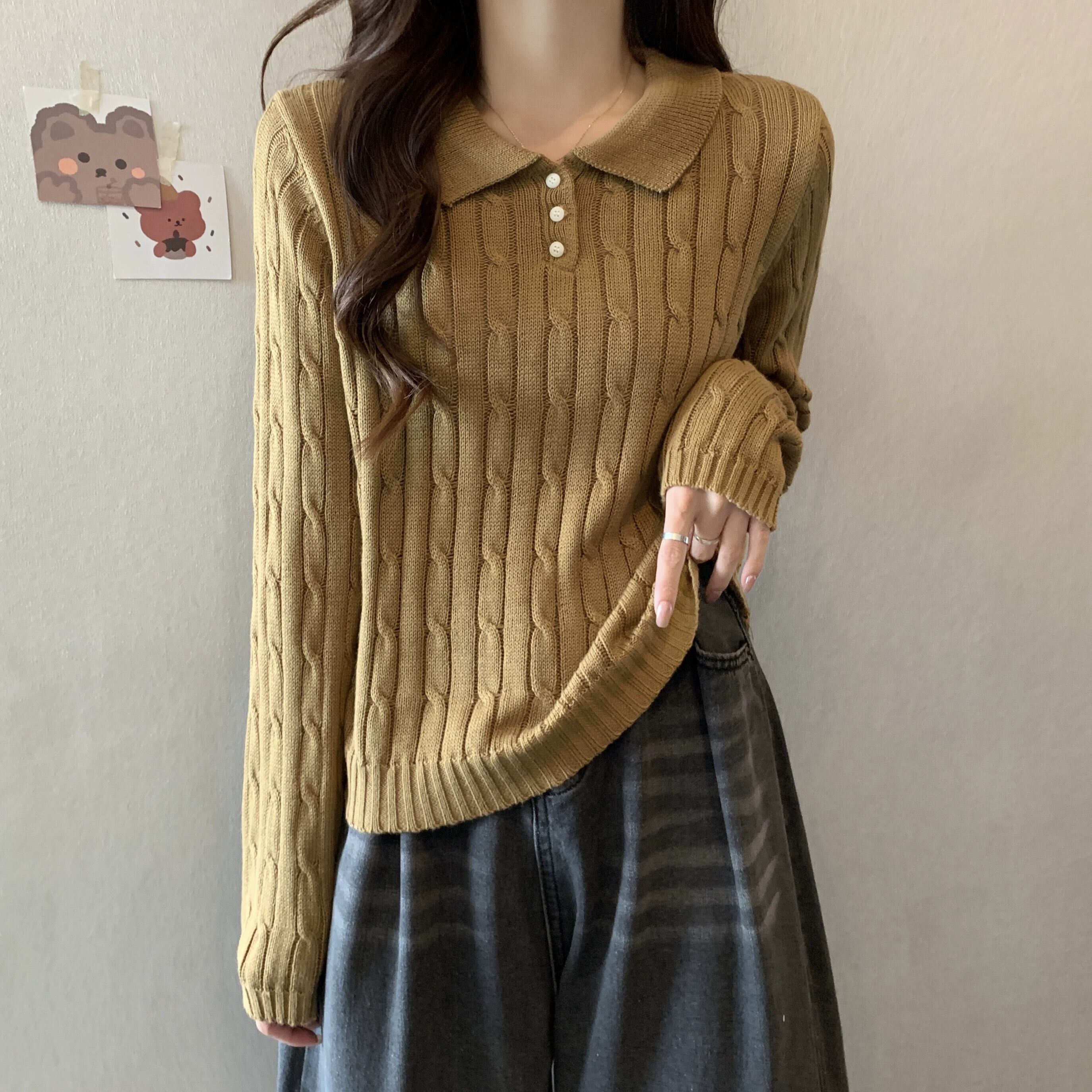 秋冬のソフトワックスプルオーバーツイストセーターレディース、レトロなデザイン、ゆったりとしたアウターウェア、厚みのあるポロカラー長袖セーター ロング オータム 秋物 ウィンター 冬物 7460061630964182 | framboise21