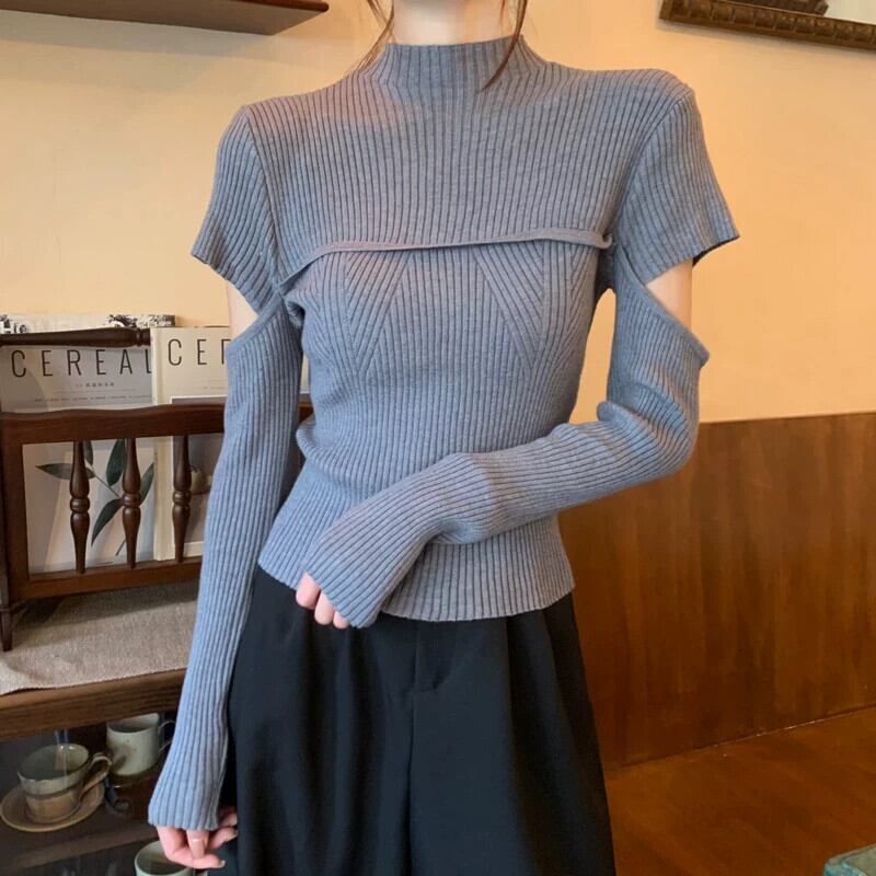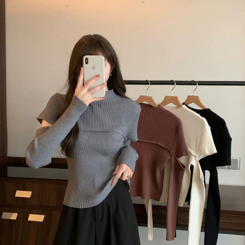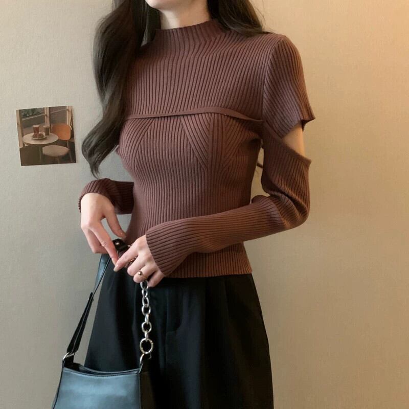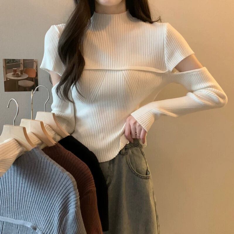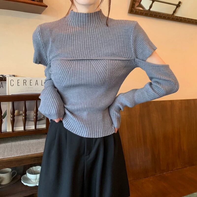 秋と冬のハーフタートルネックボトムシャツの女性、ファッショナブルでファッショナブル、スリムでスリム、中空の長袖ニットセーター付き ロング オータム 秋物 ウィンター 冬物 746003638842386 | framboise21