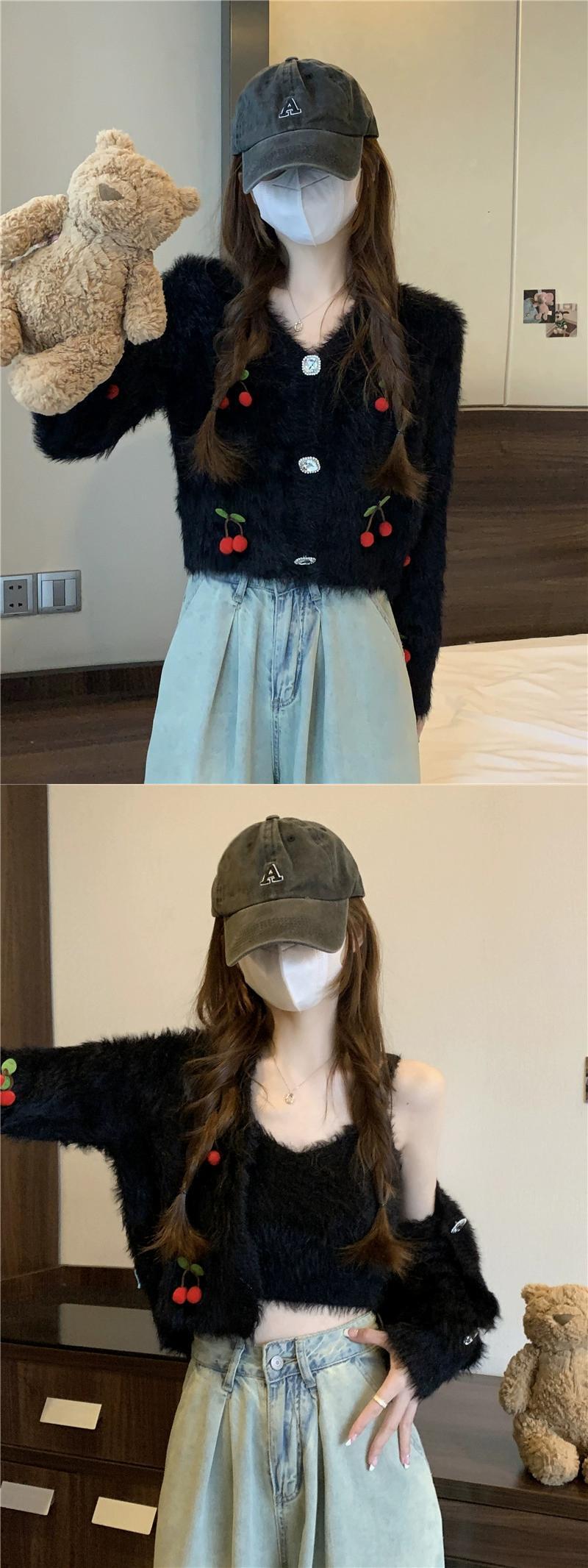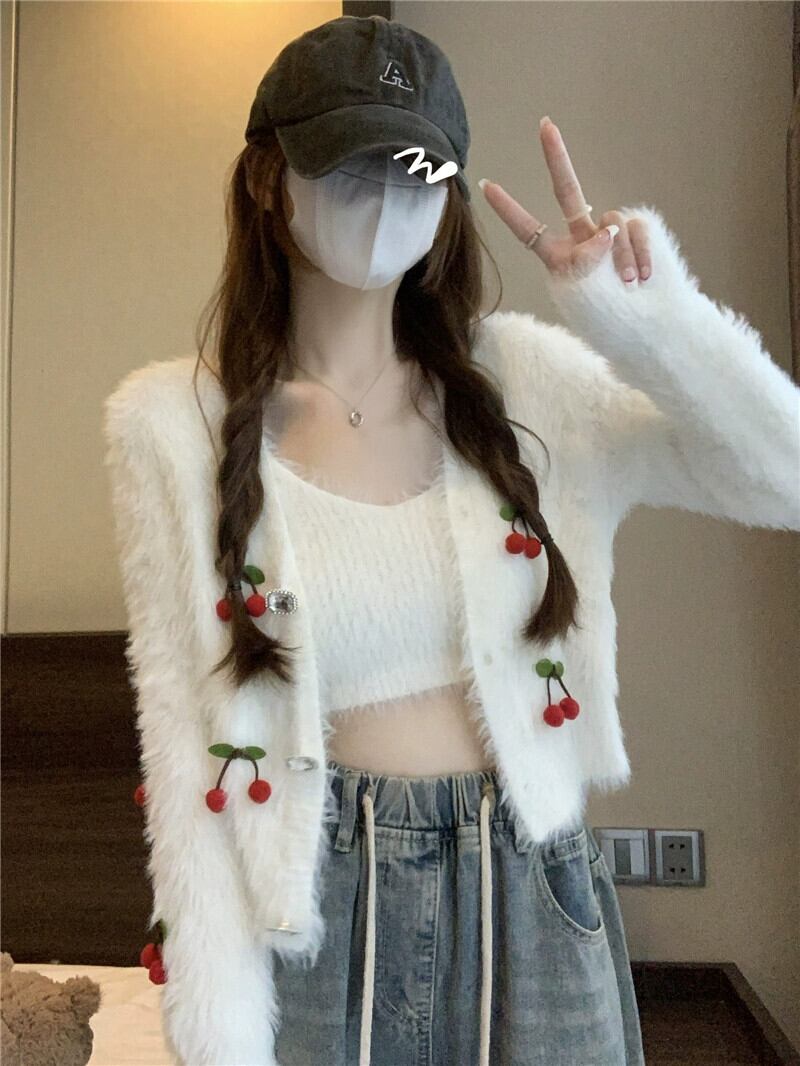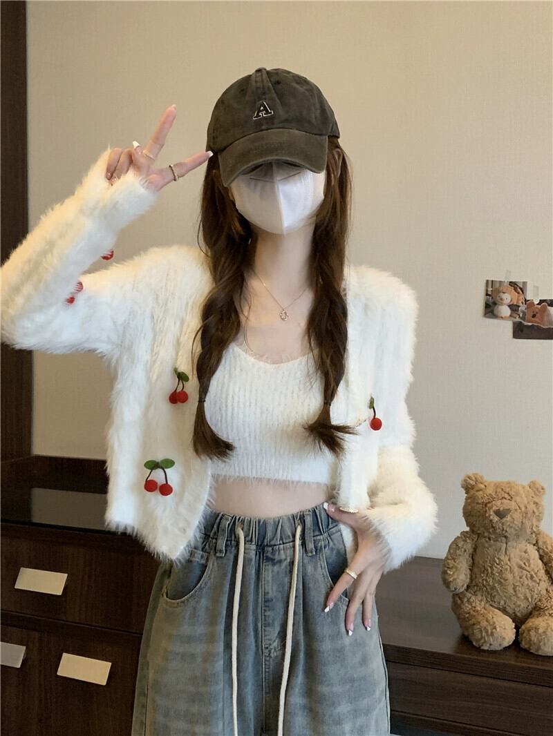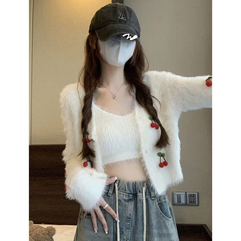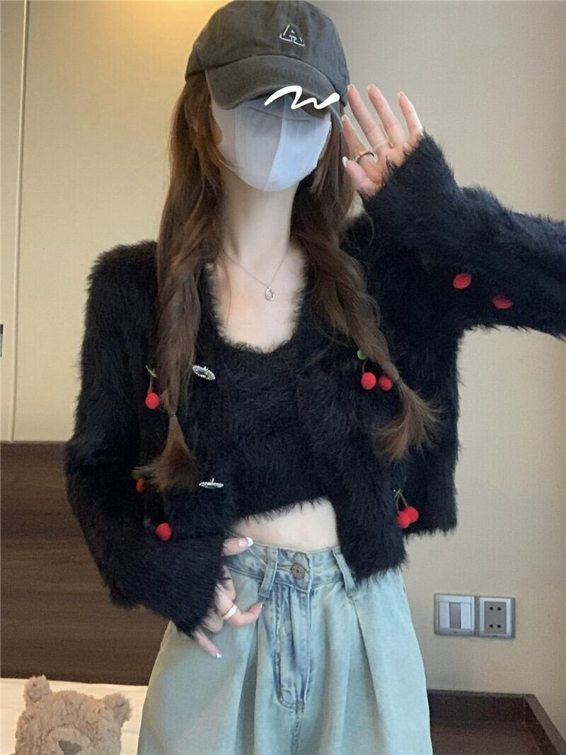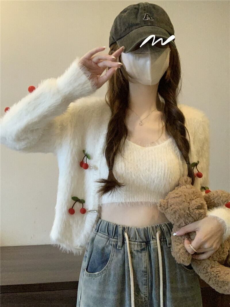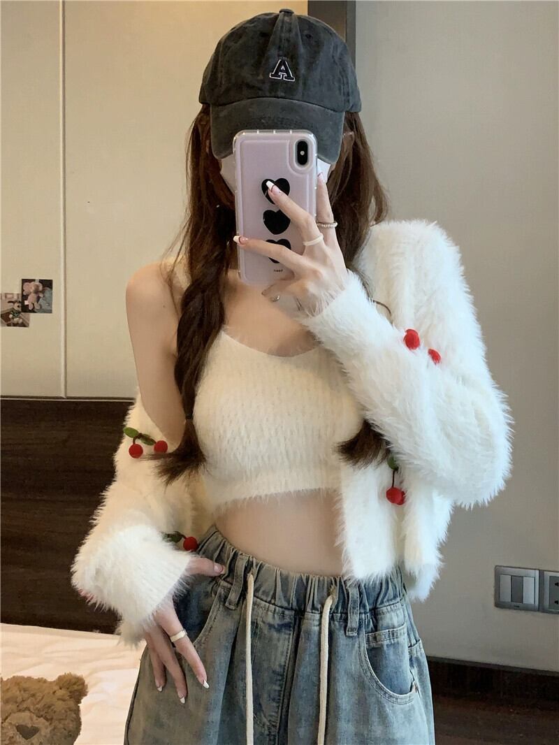 模造ミンクベルベットカーディガンセータージャケット女性秋と冬のファッションルーズアウターショートニットキャミソール 2 点セット オータム 秋物 ウィンター 冬物 7460022588293515 | framboise21