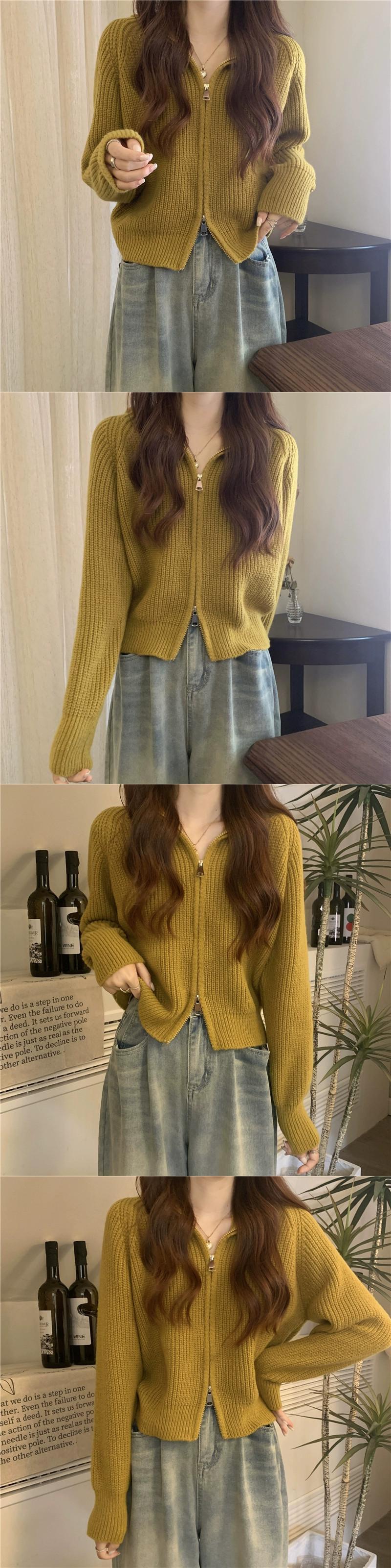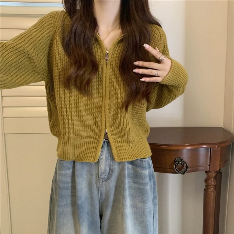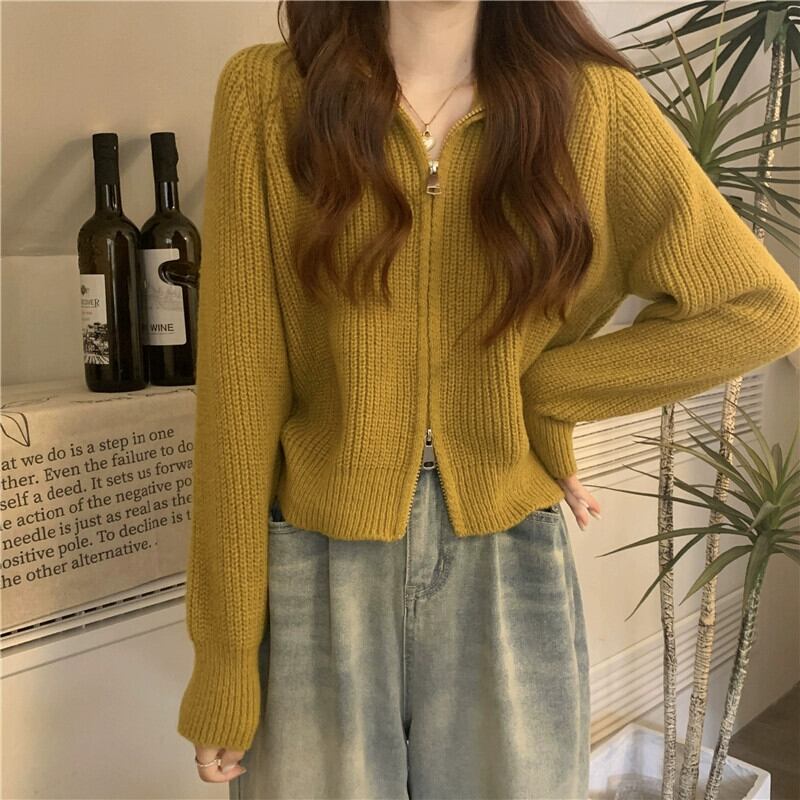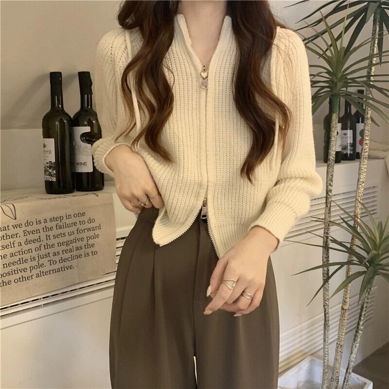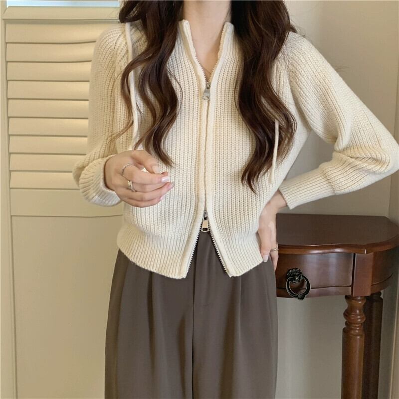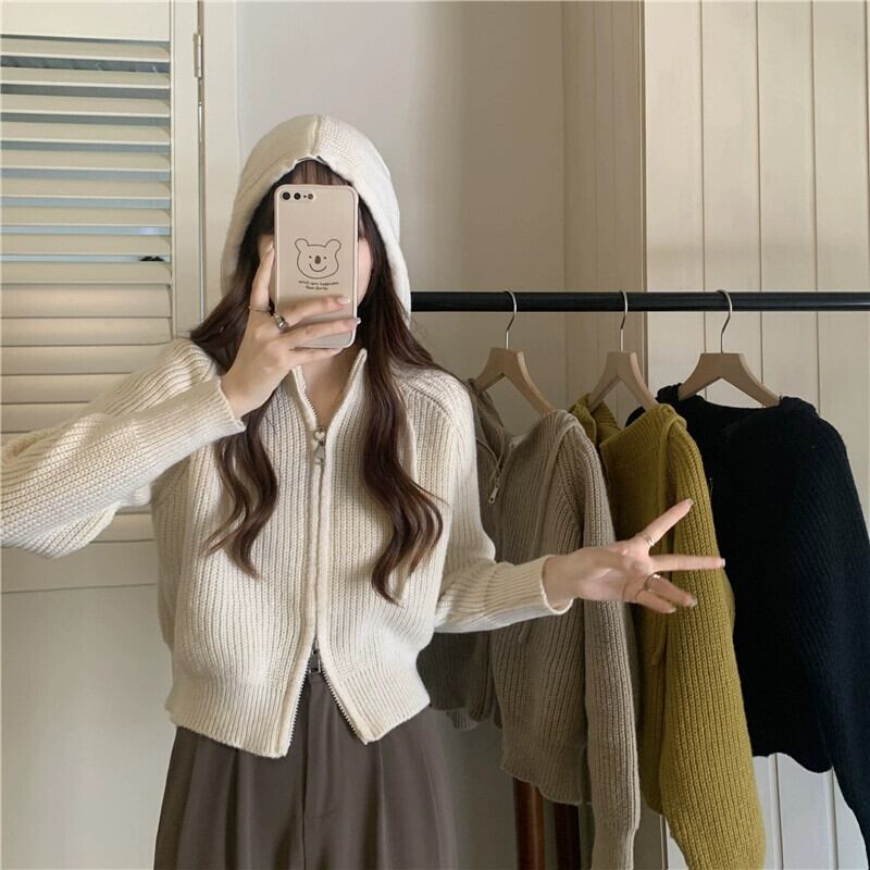 秋と冬のダブルジッパーフード付きセータージャケットの女性、ルーズ、スリム、怠惰なスタイル、ショート長袖ニットカーディガン ロング オータム 秋物 ウィンター 冬物 7460028711377143 | framboise21