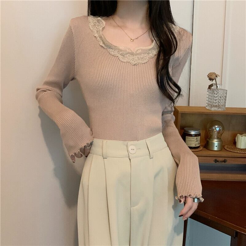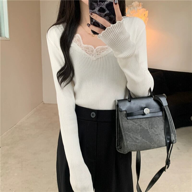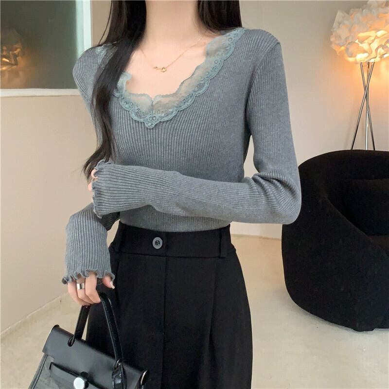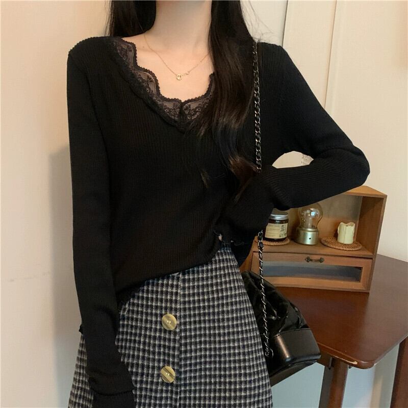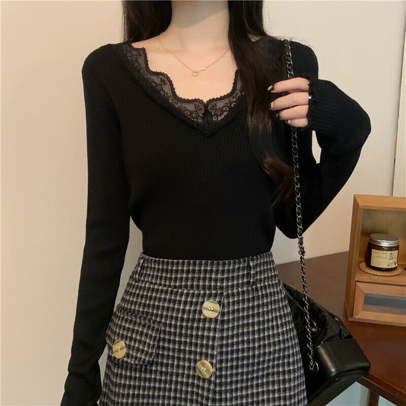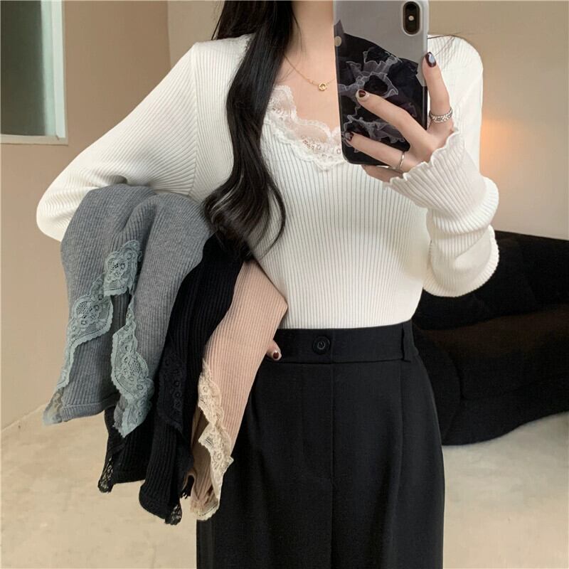 秋冬のスプライスレースVネックボトリングシャツ女性、ウエスタンスタイルスリムフィットインナーショートファングエッジ長袖ニットセーター ロング オータム 秋物 ウィンター 冬物 7460015544279721 | framboise21