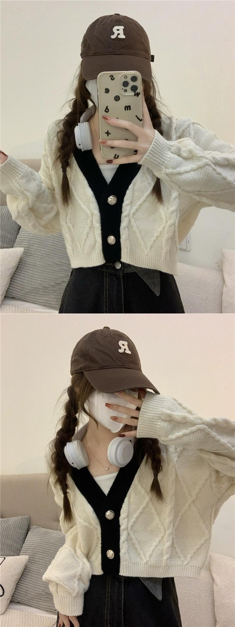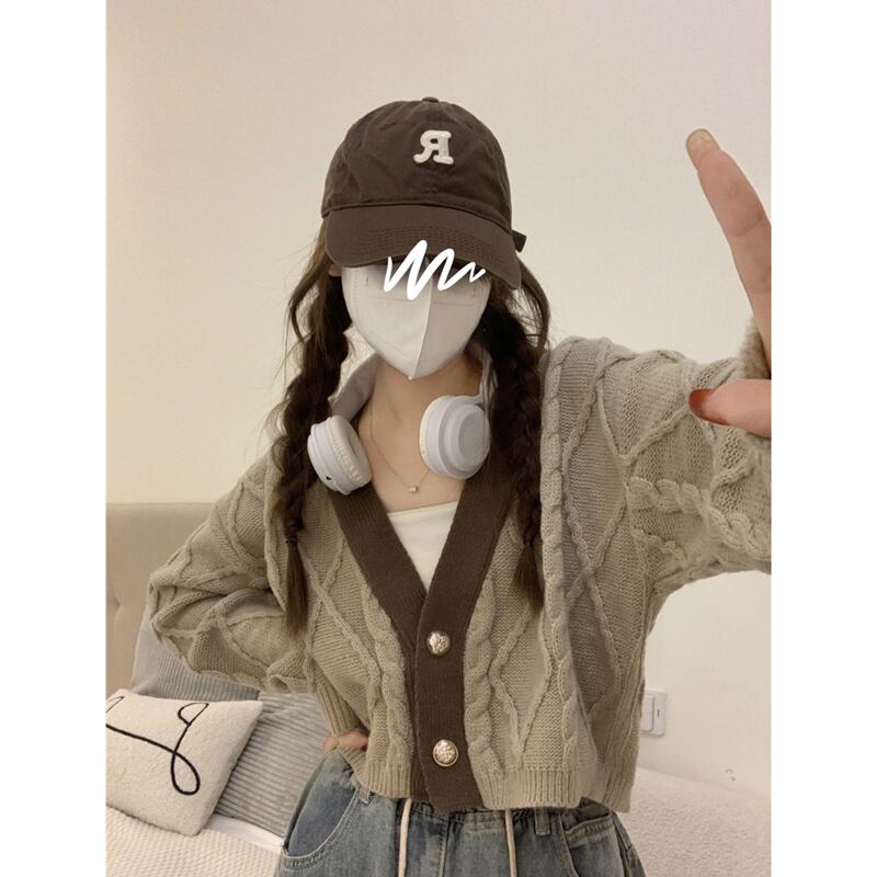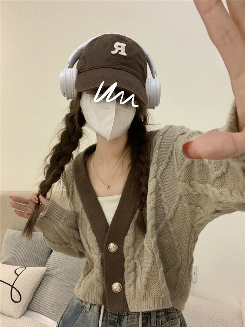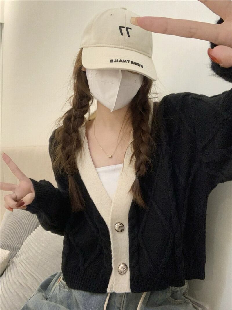小さなショートツイストセータージャケット女性の秋と冬のレトロなルーズアウターウェア怠惰なカラーブロックvネックニットカーディガン オータム 秋物 ウィンター 冬物 7460099296231607 | framboise21