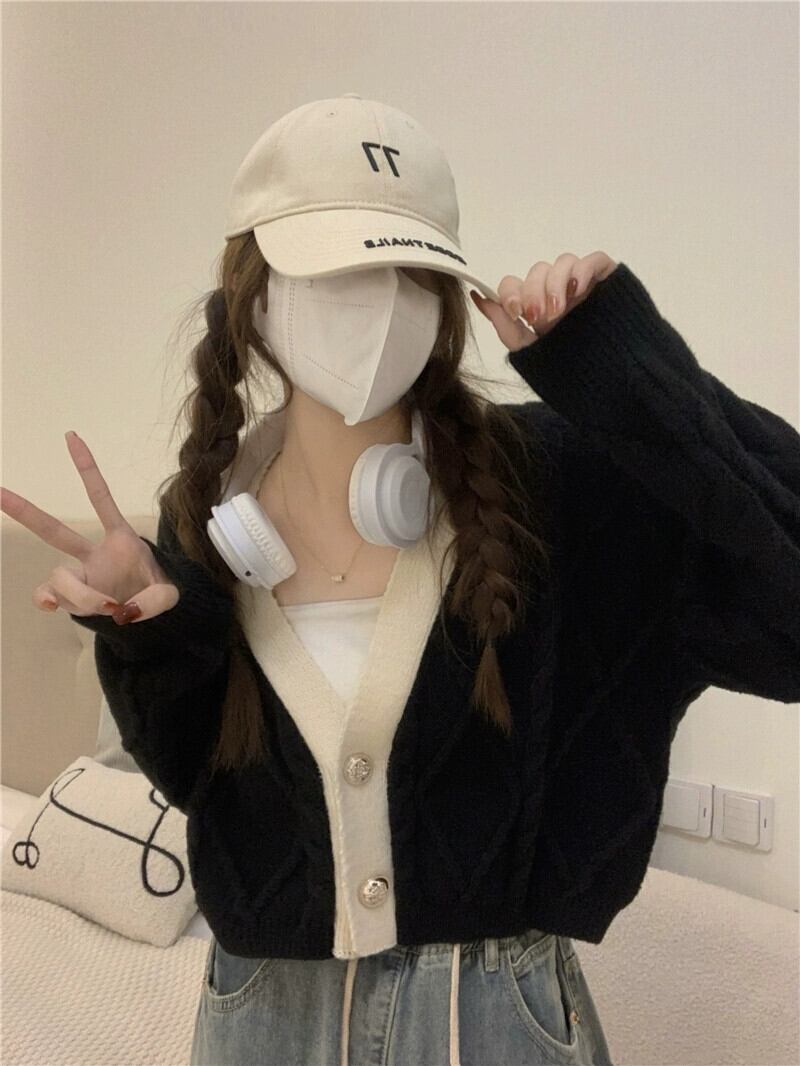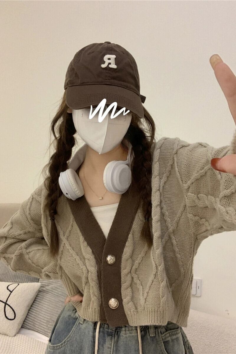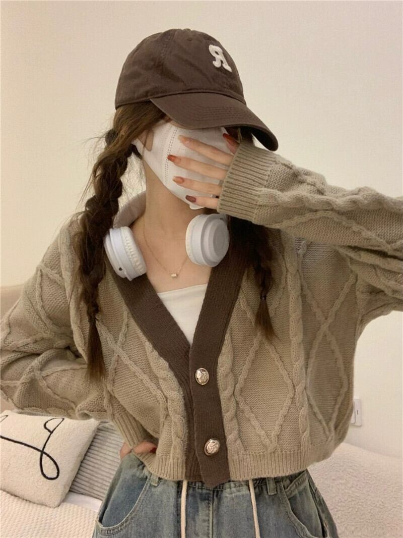 小さなショートツイストセータージャケット女性の秋と冬のレトロなルーズアウターウェア怠惰なカラーブロックvネックニットカーディガン オータム 秋物 ウィンター 冬物 7460099296231607 | framboise21