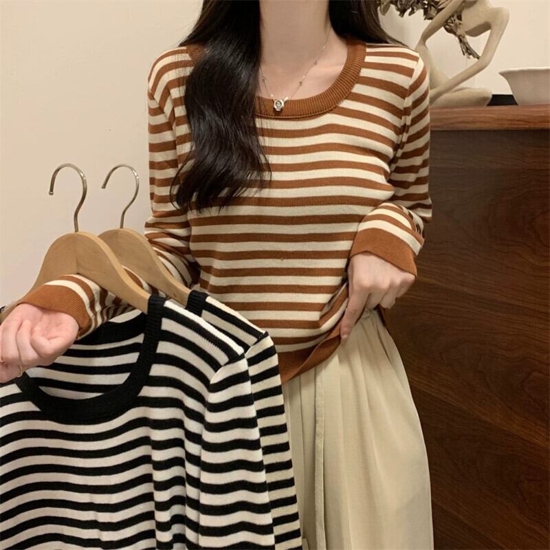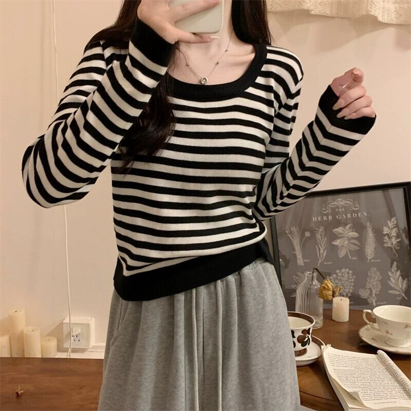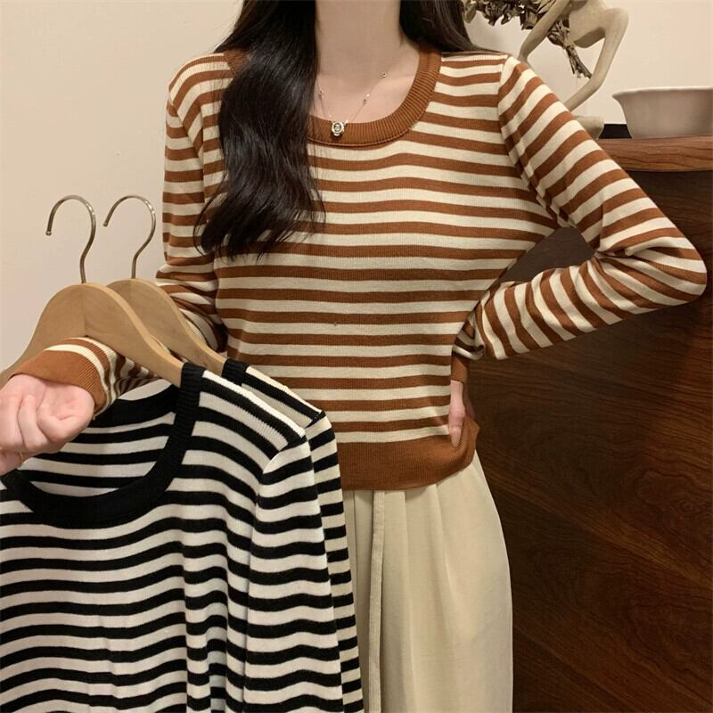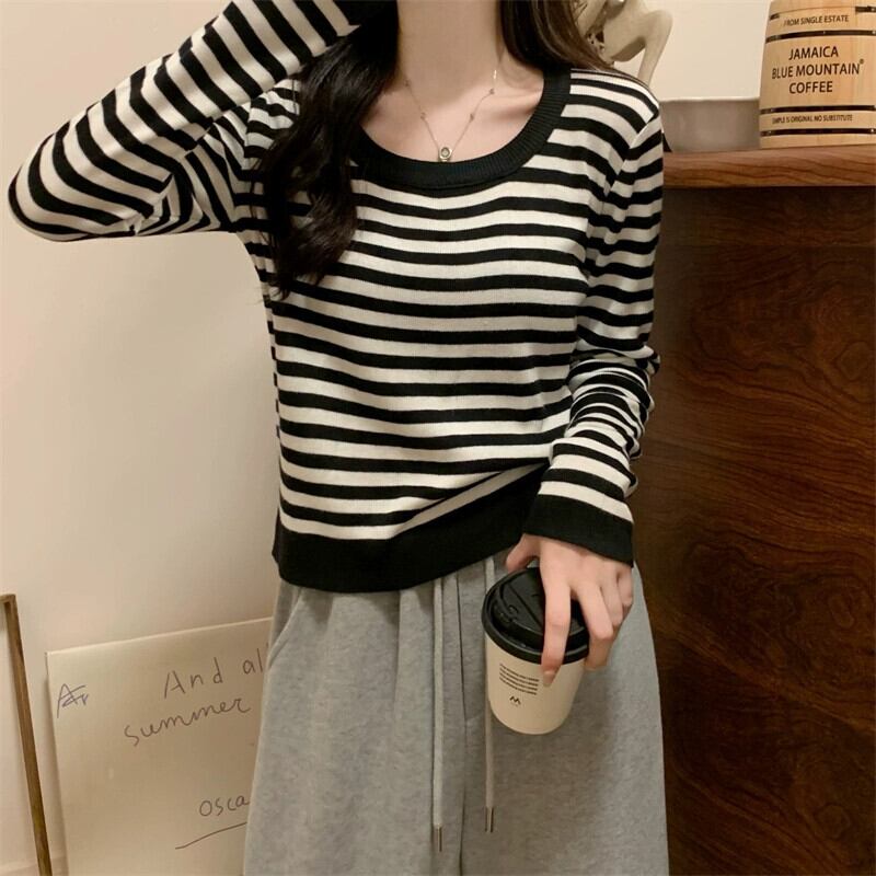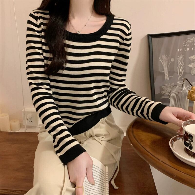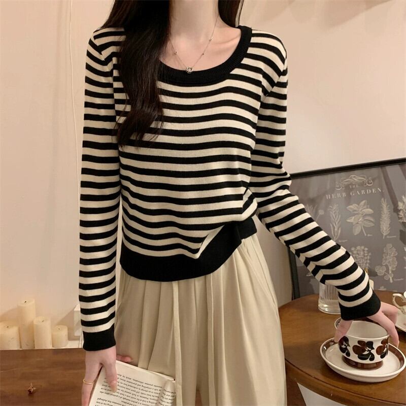 黒のストライプのボトリングシャツ 2023 新しい女性の秋と冬のフレンチスタイルのスリムフィットインナーニットショートセーター ブラック オータム 秋物 ウィンター 冬物 7460076896877993 | framboise21