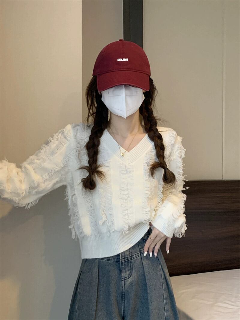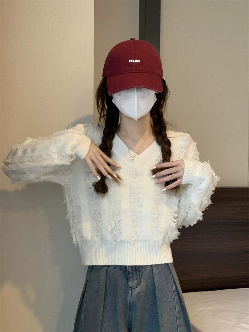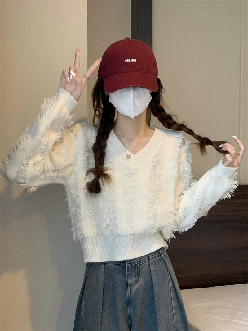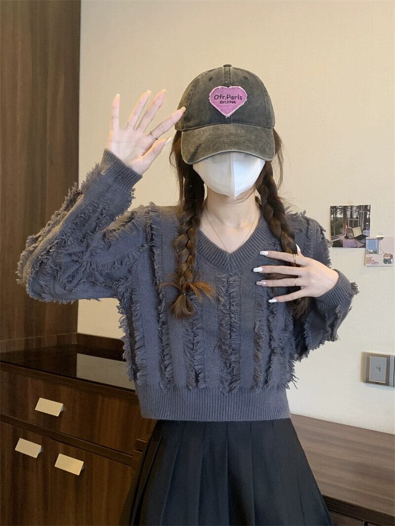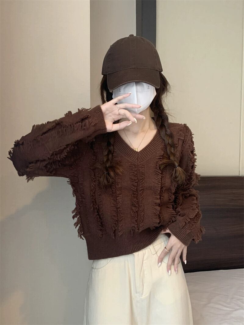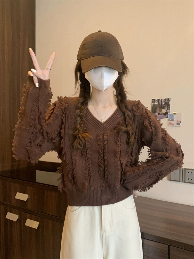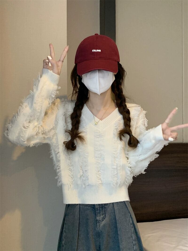 小さなショートテルセーターレディース秋冬レトロデザインルーズアウタープルオーバーVネック長袖セーター ロング オータム 秋物 ウィンター 冬物 7460018218701493 | framboise21
