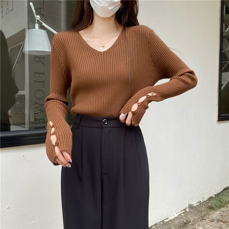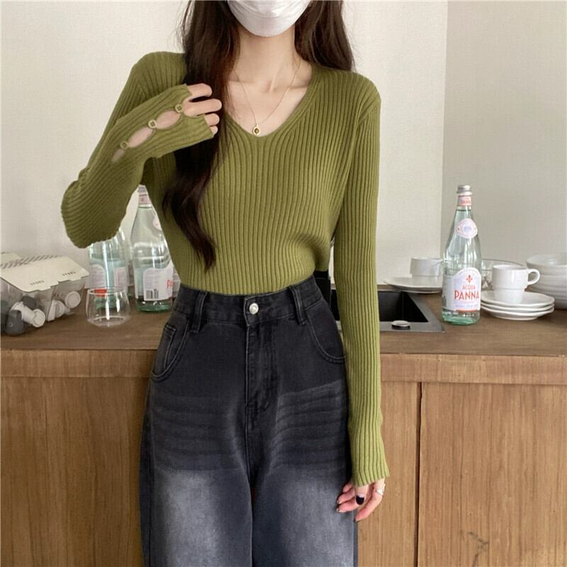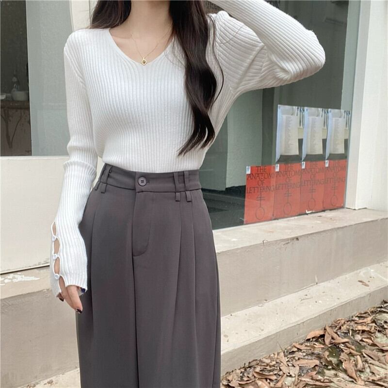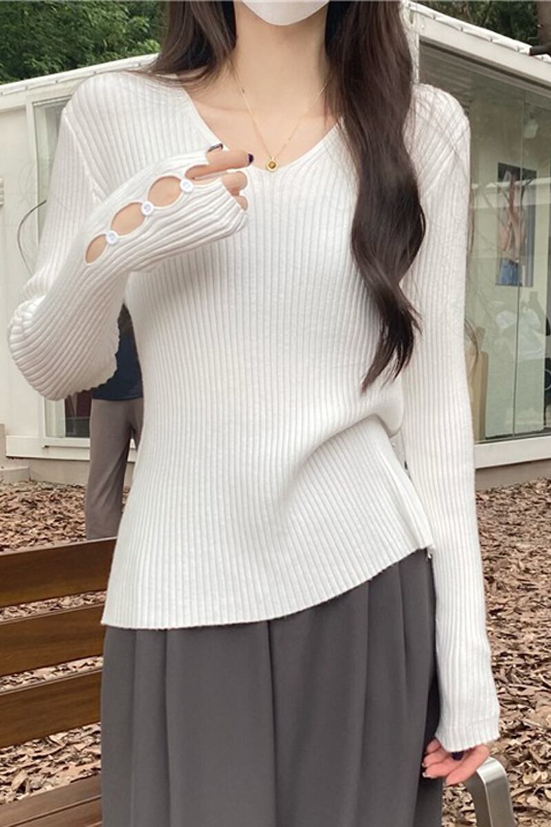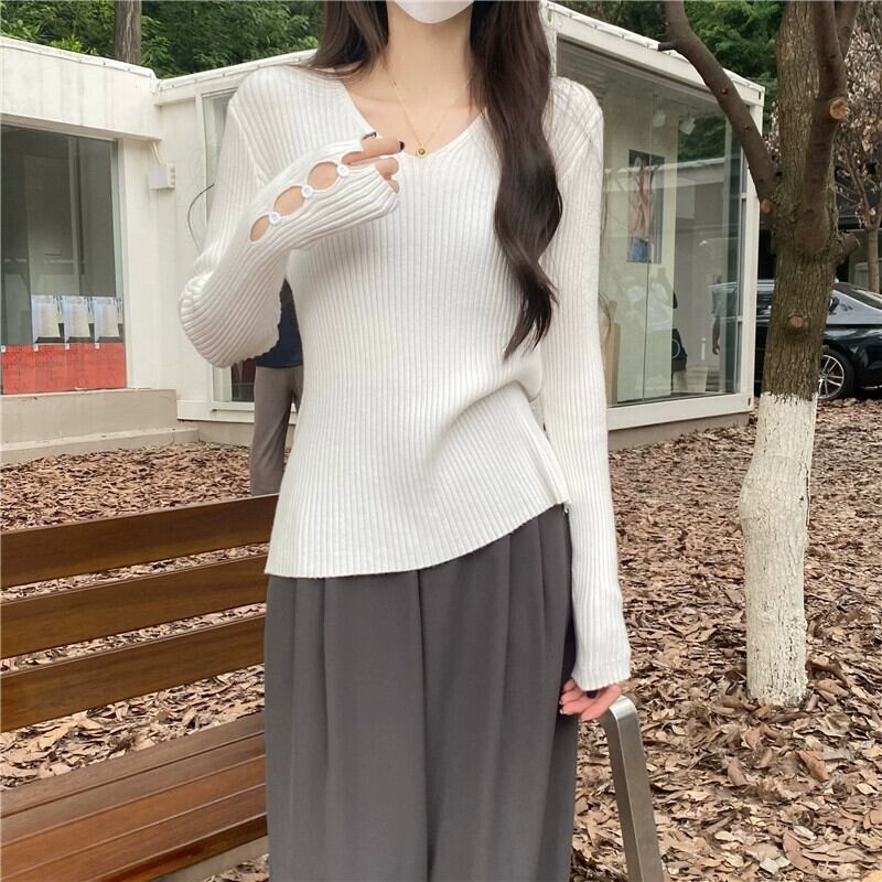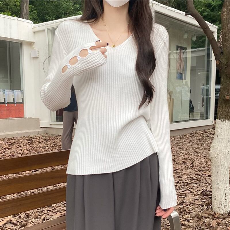 秋冬の白いショートVネックボトリングシャツ女性、ファッショナブルでスタイリッシュなインナースタイル、スリムフィット、中空長袖セーター ロング ホワイト オータム 秋物 ウィンター 冬物 7460025359613661 | framboise21