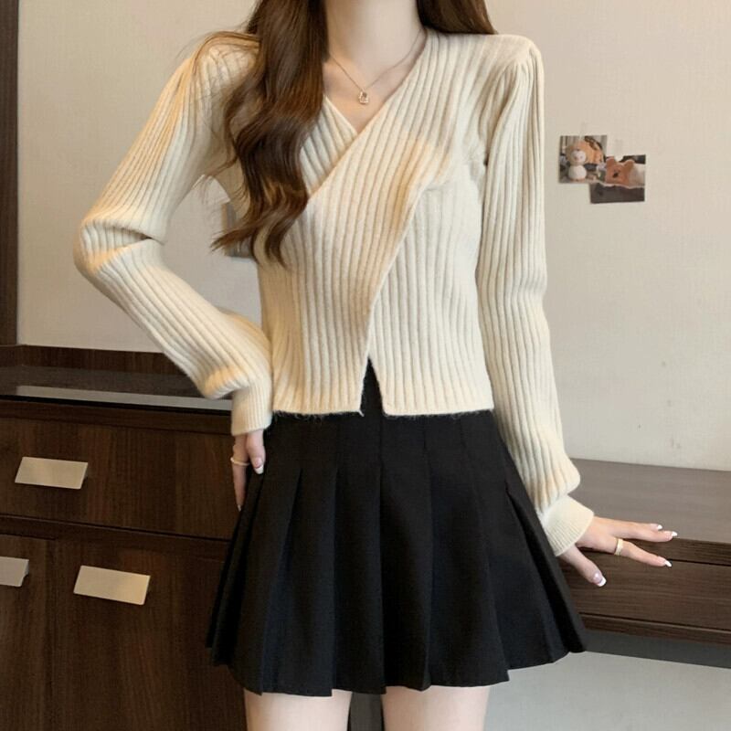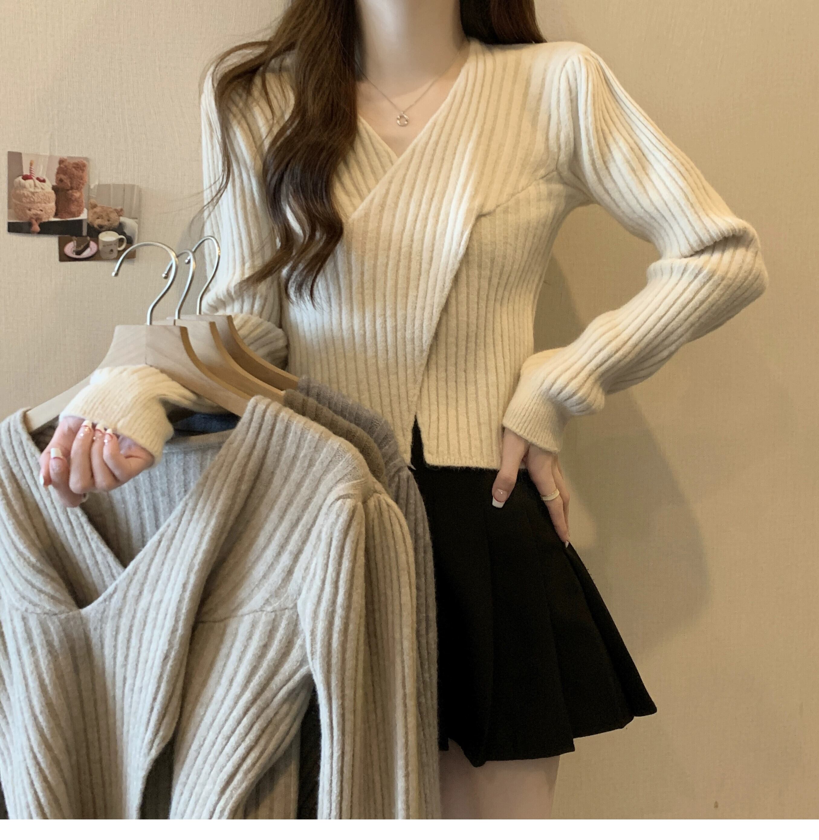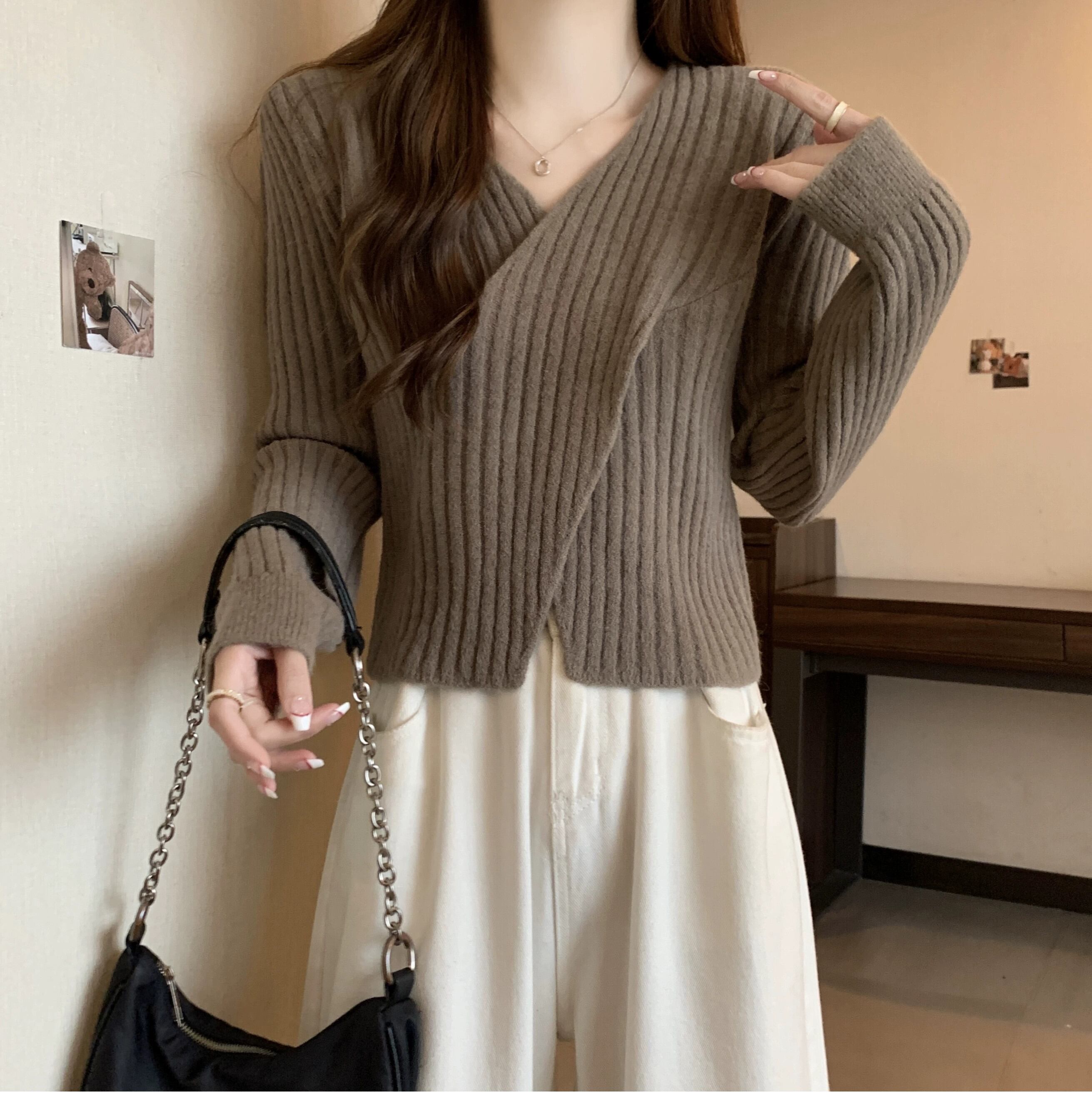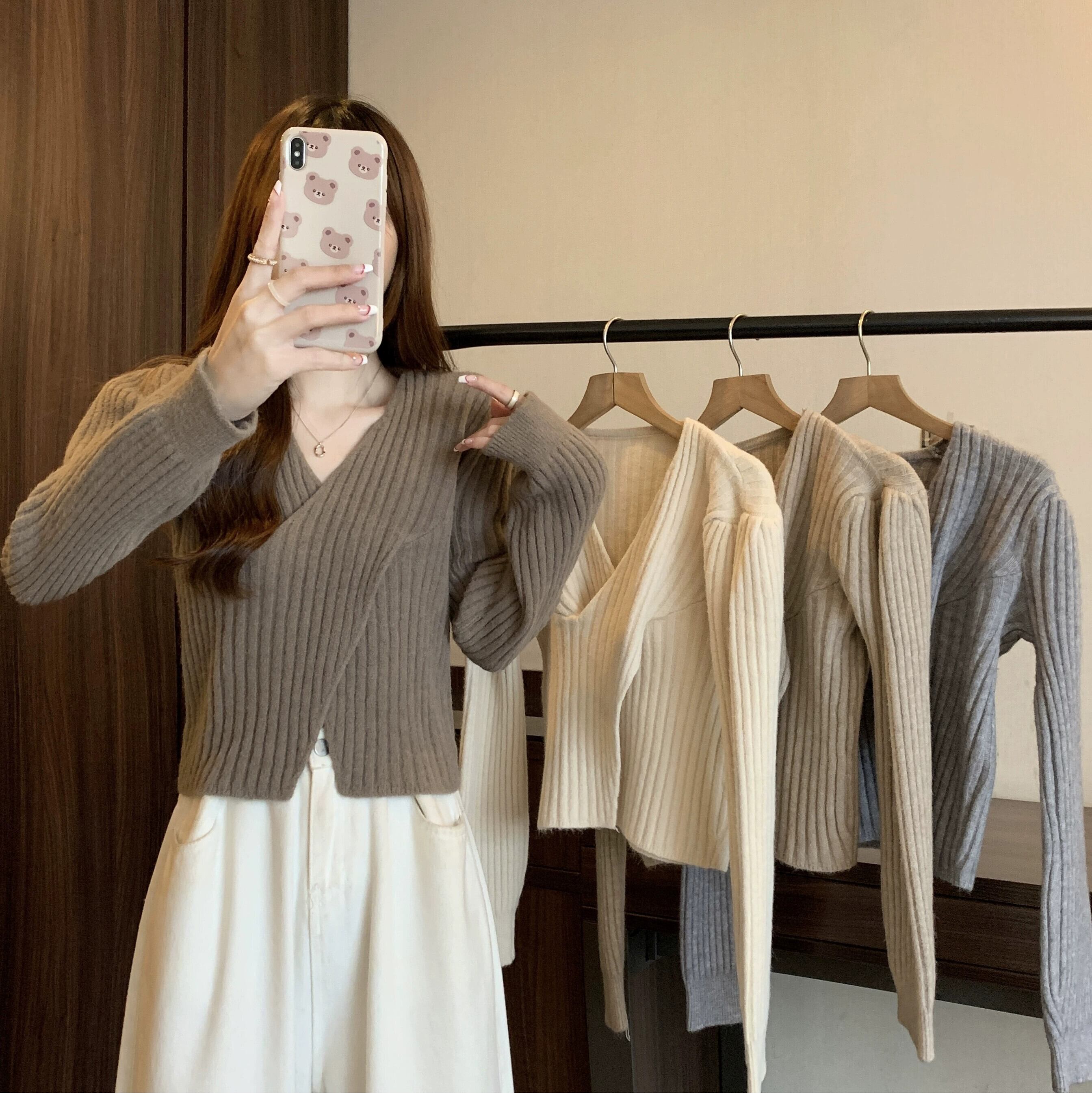 秋冬の不規則なクロスショート V ネックセーター女性、ルーズなデザインのアウターウェア、痩身、ソフトでワックス状の長袖セーター ロング オータム 秋物 ウィンター 冬物 Vネック 7460033892725320 | framboise21