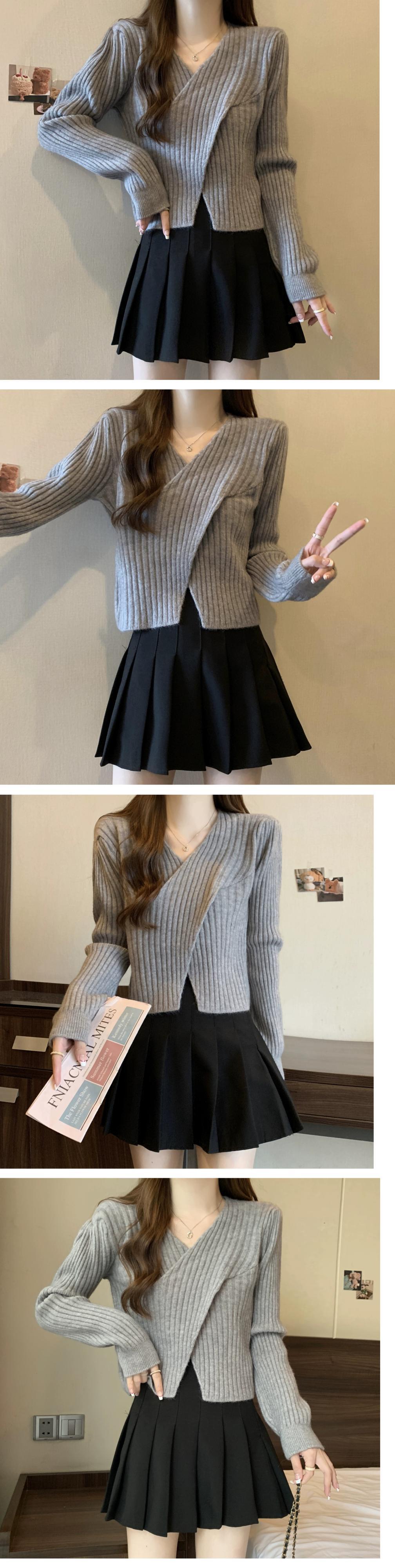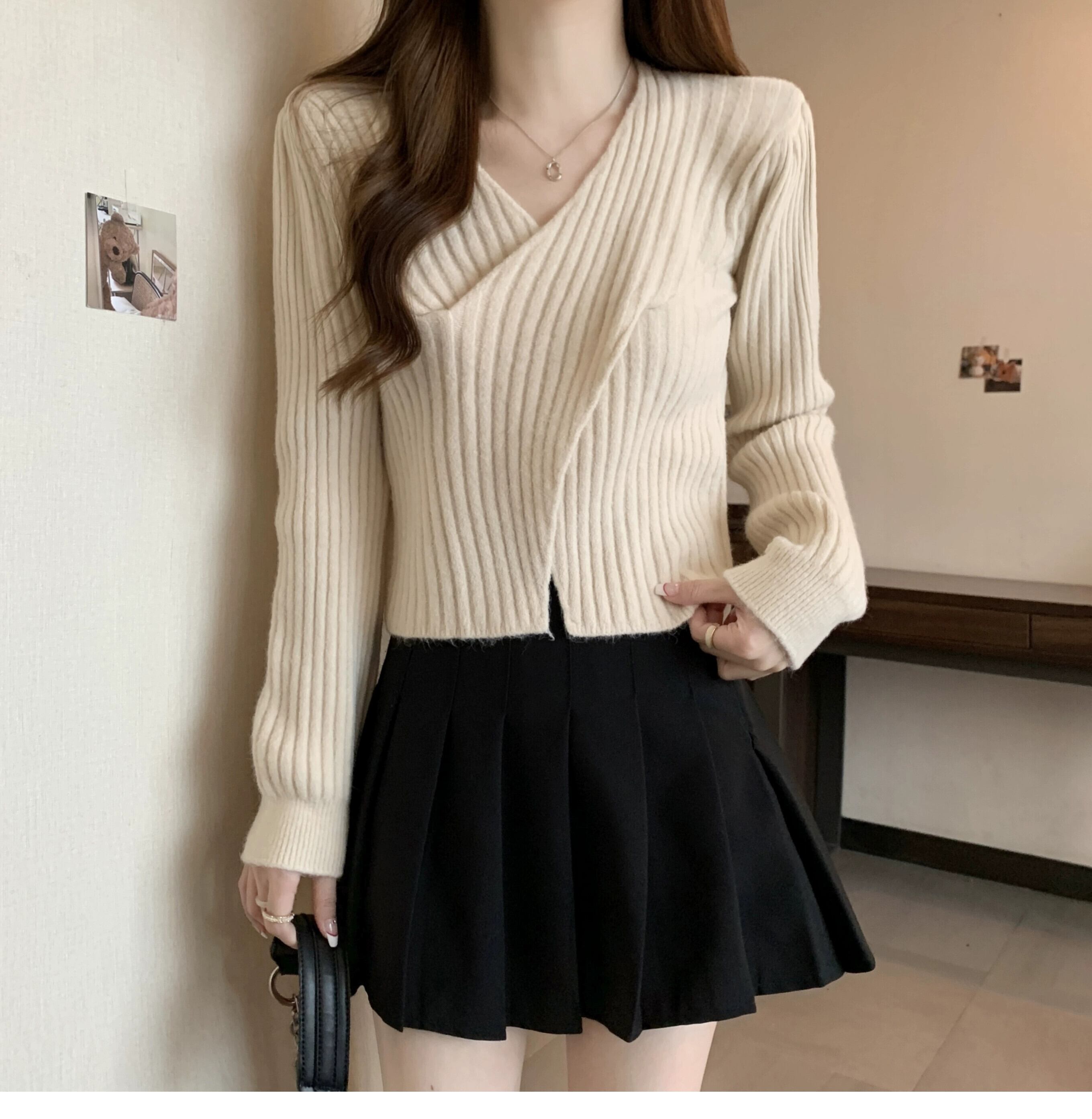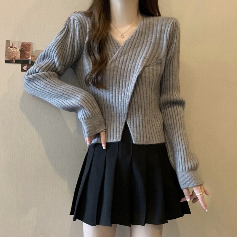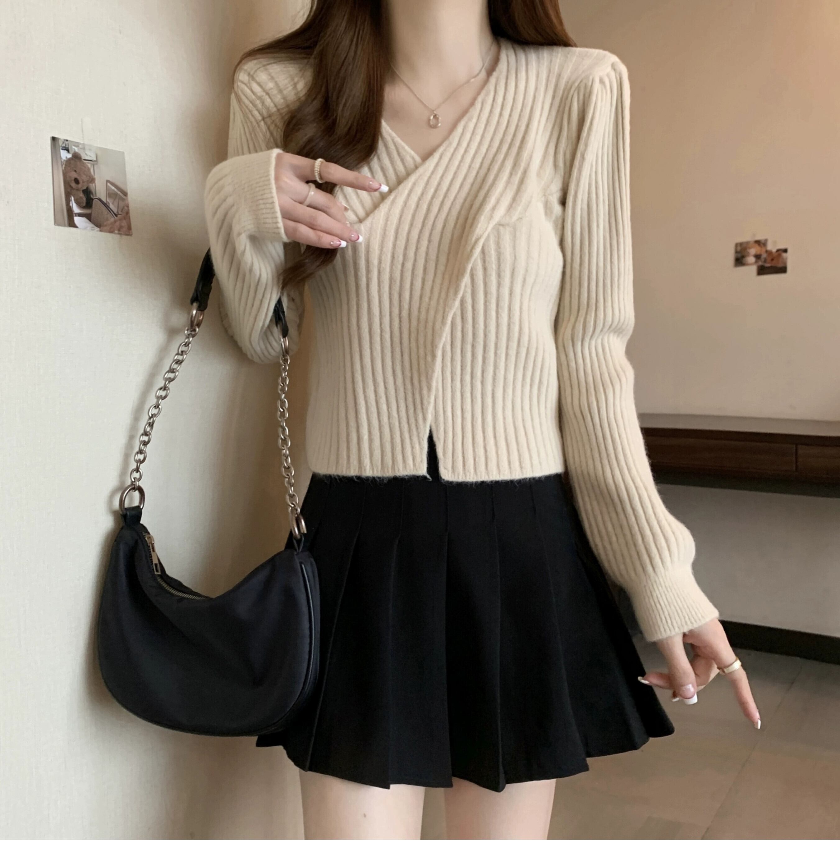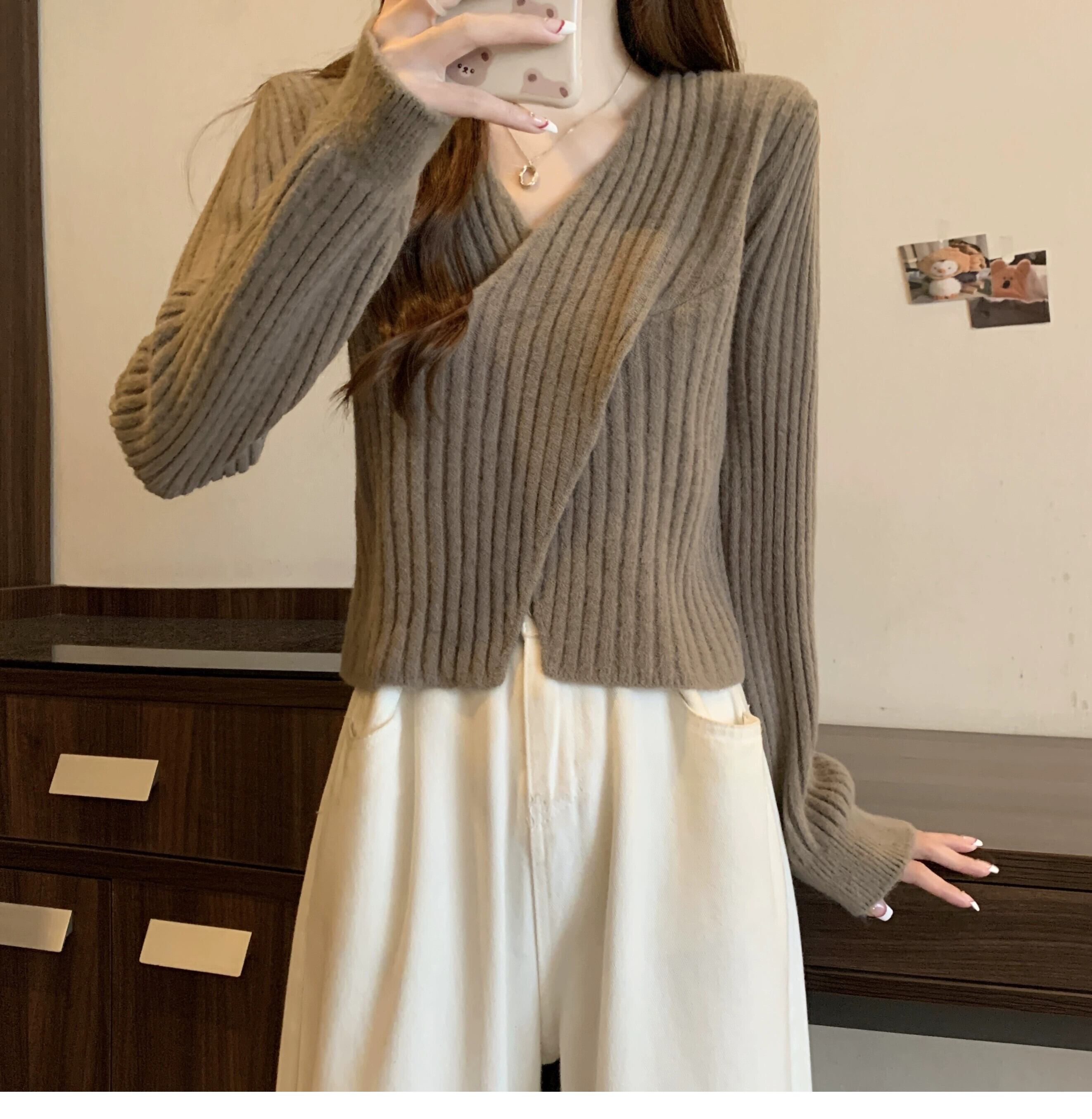 秋冬の不規則なクロスショート V ネックセーター女性、ルーズなデザインのアウターウェア、痩身、ソフトでワックス状の長袖セーター ロング オータム 秋物 ウィンター 冬物 Vネック 7460033892725320 | framboise21