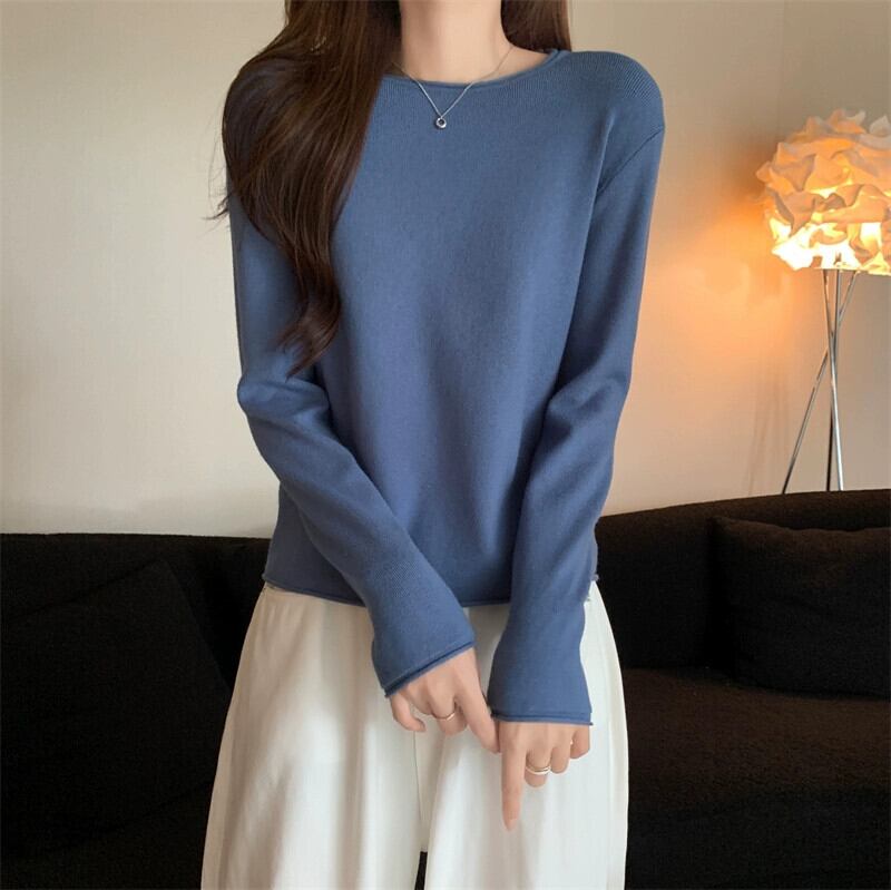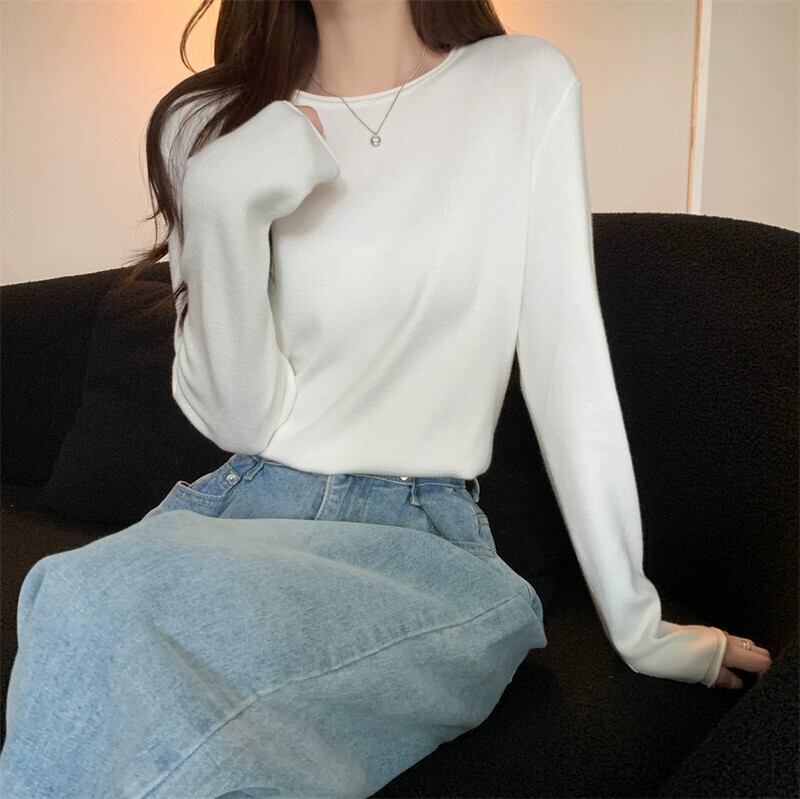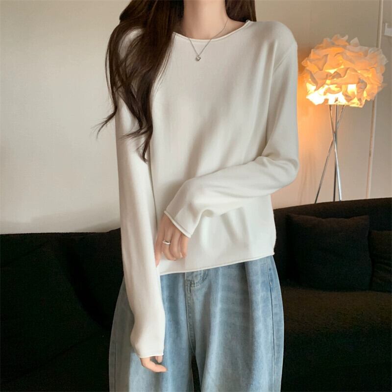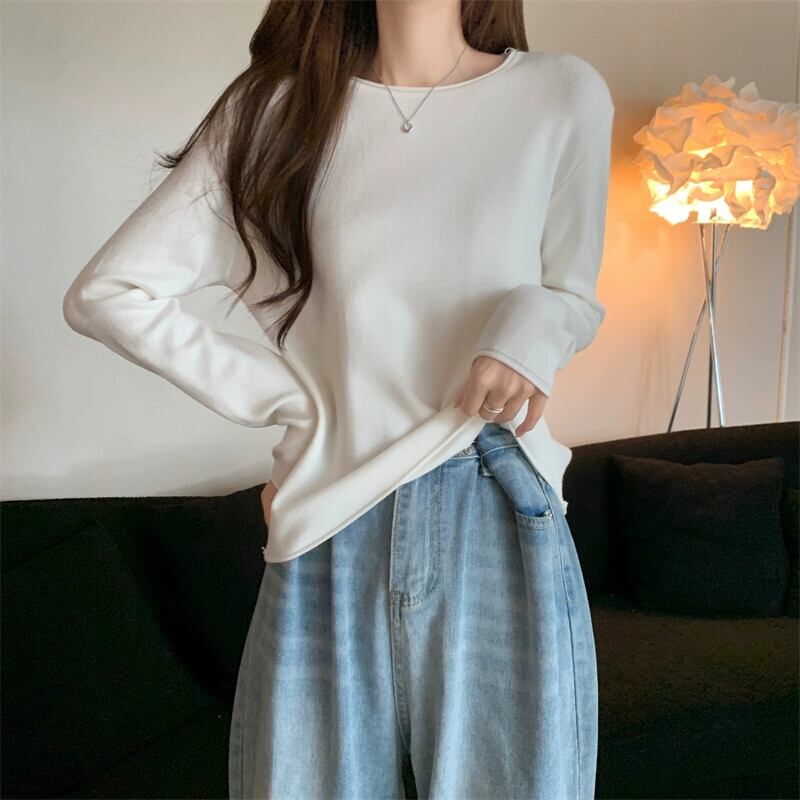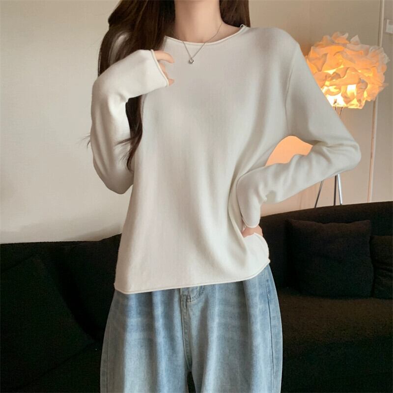 秋冬の白いショートインナーニットボトムセーターレディース、ファッショナブルなカーリング、スリムフィット、万能ラウンドネック長袖セーター ロング ホワイト オータム 秋物 ウィンター 冬物 Oネック 7460048809969480 | framboise21
