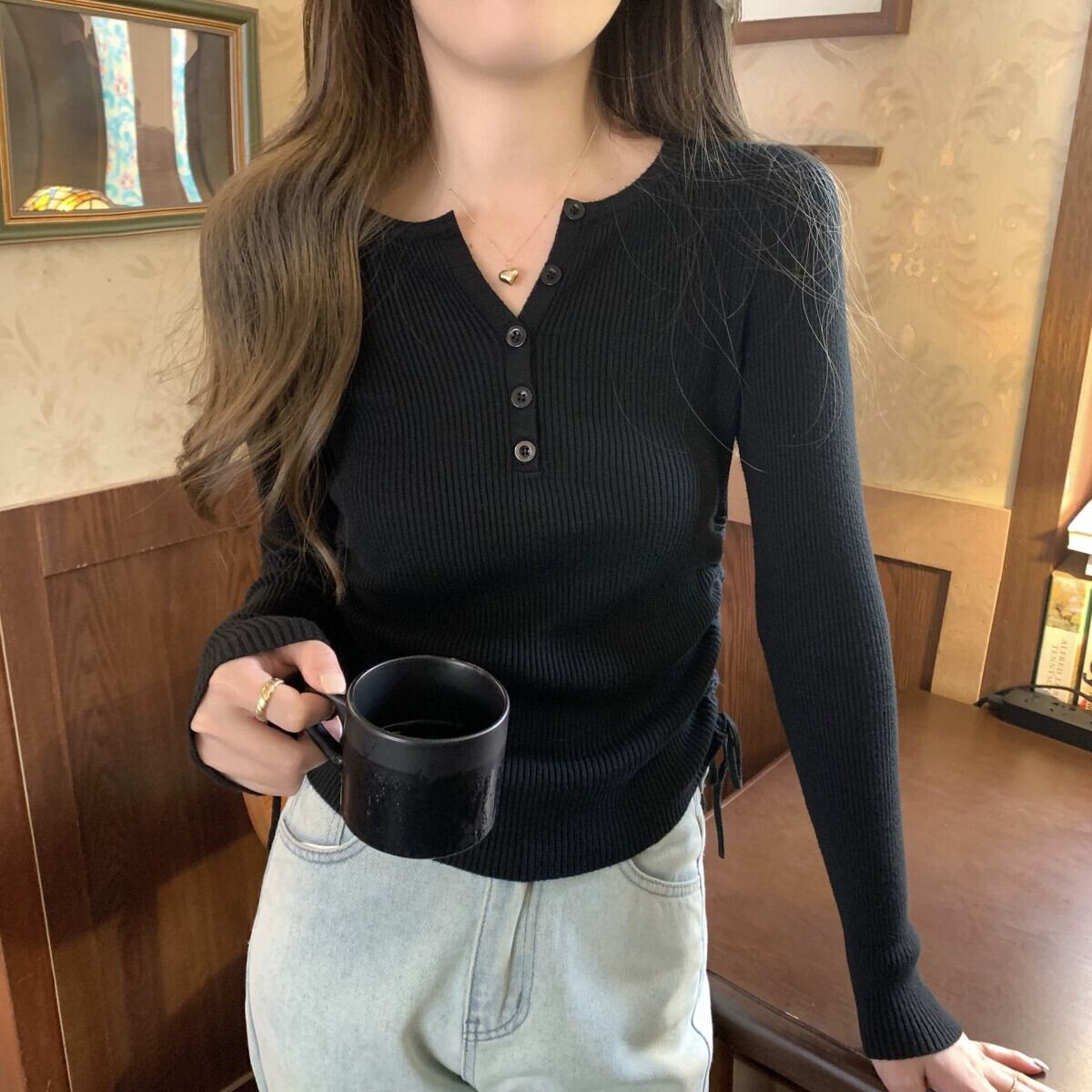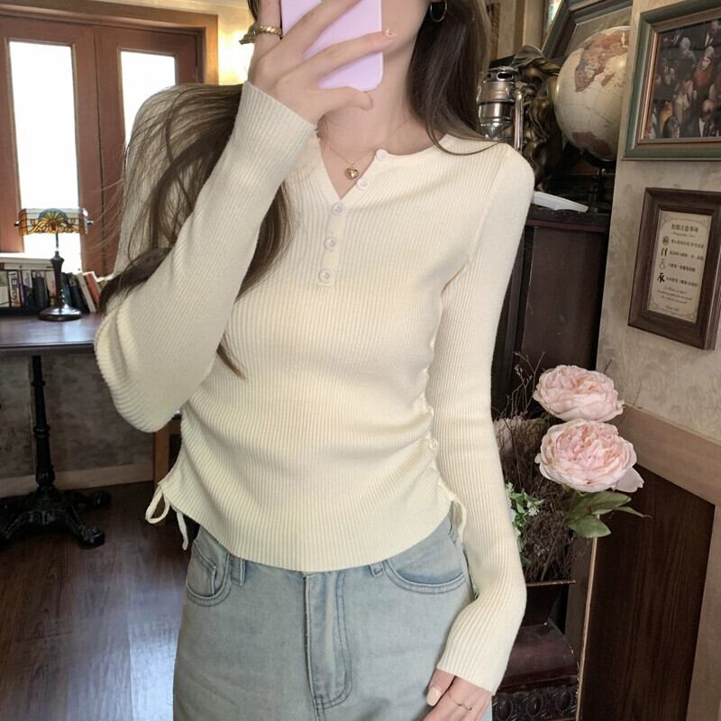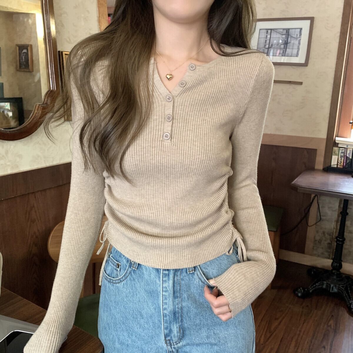 秋冬デザインのVネックニットボトムシャツレディース、ファッショナブルでウエスタンスタイルのインナーフィット、スリムセーター、長袖ショートトップ、アプリコット ロング オータム 秋物 ウィンター 冬物 7460036507712588 | framboise21