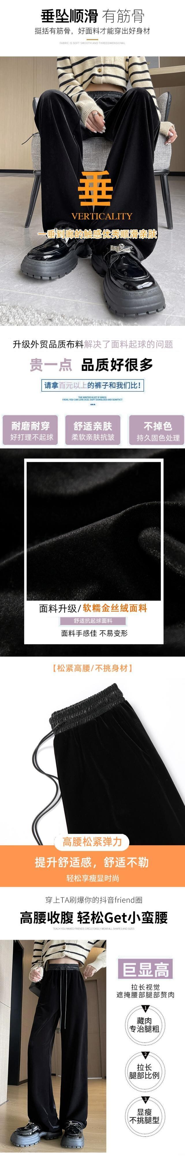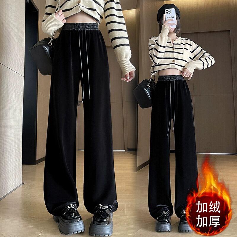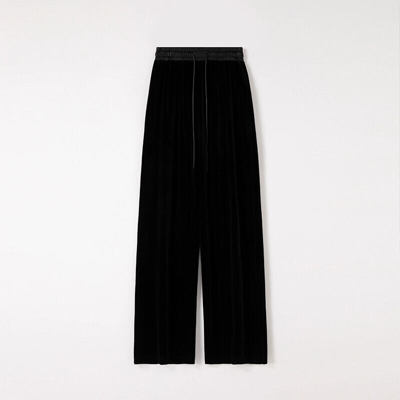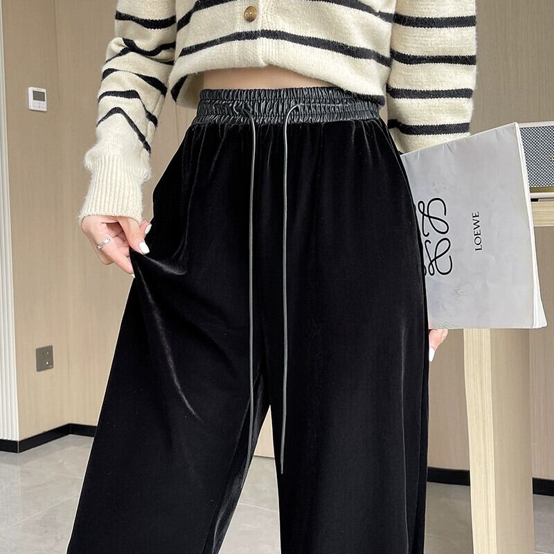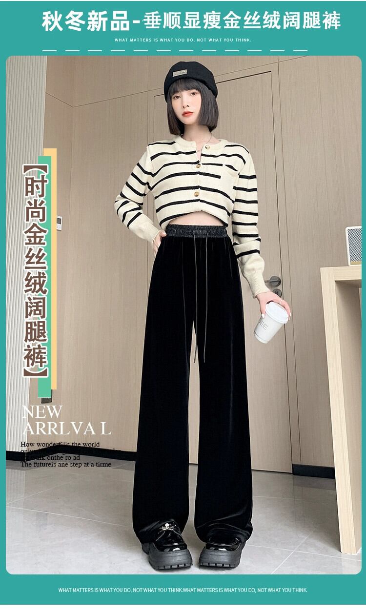 秋冬のナローゴールドベルベットワイドレッグパンツレディース、厚みのあるベルベットパンツ、ハイウエストドレープ、ストレートレッグフロアレングスカジュアルパンツレディース オータム 秋物 ウィンター 冬物 7460019637550765 | framboise21