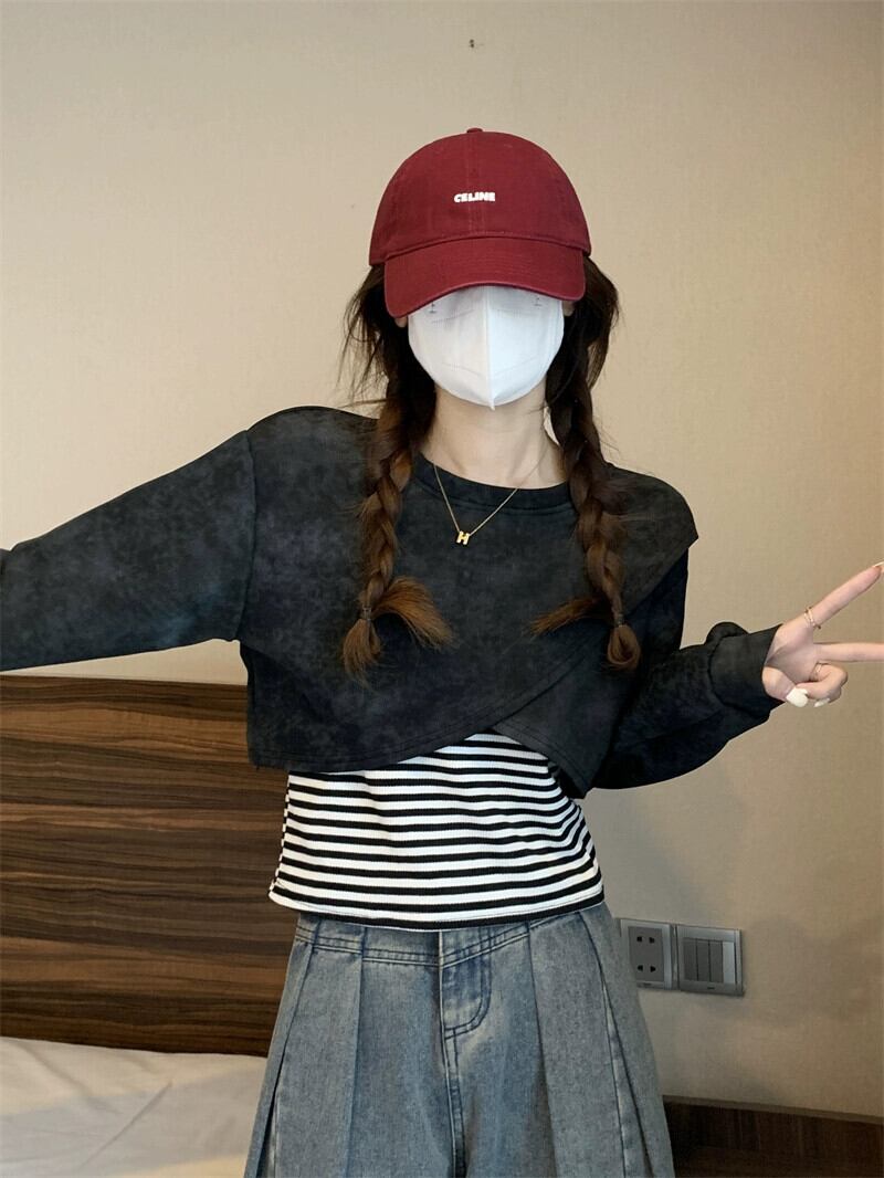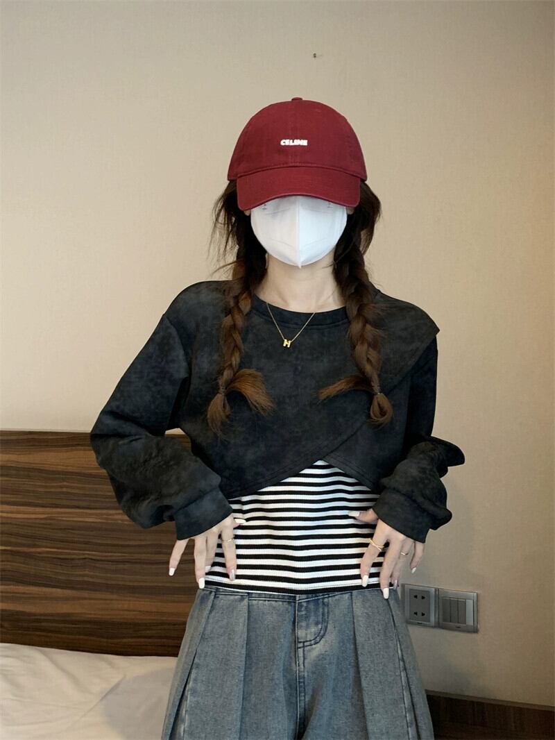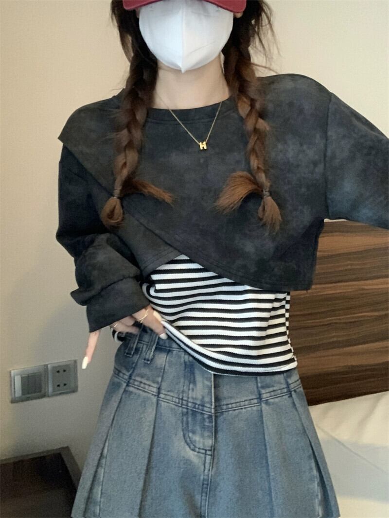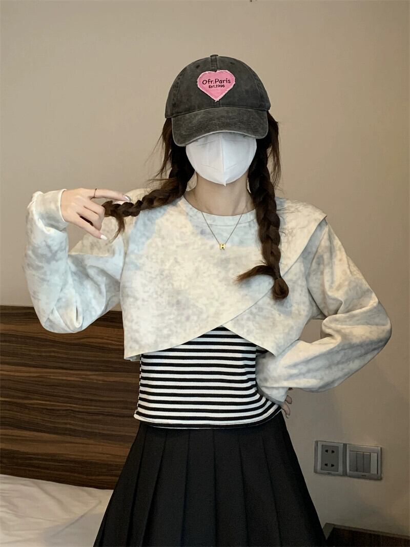 秋冬の不規則なショートスウェットシャツの女性。ゆったりとスリムに。万能なクロスプルオーバーの長袖トップス2点セット。 ロング オータム 秋物 ウィンター 冬物 7460011277548098 | framboise21