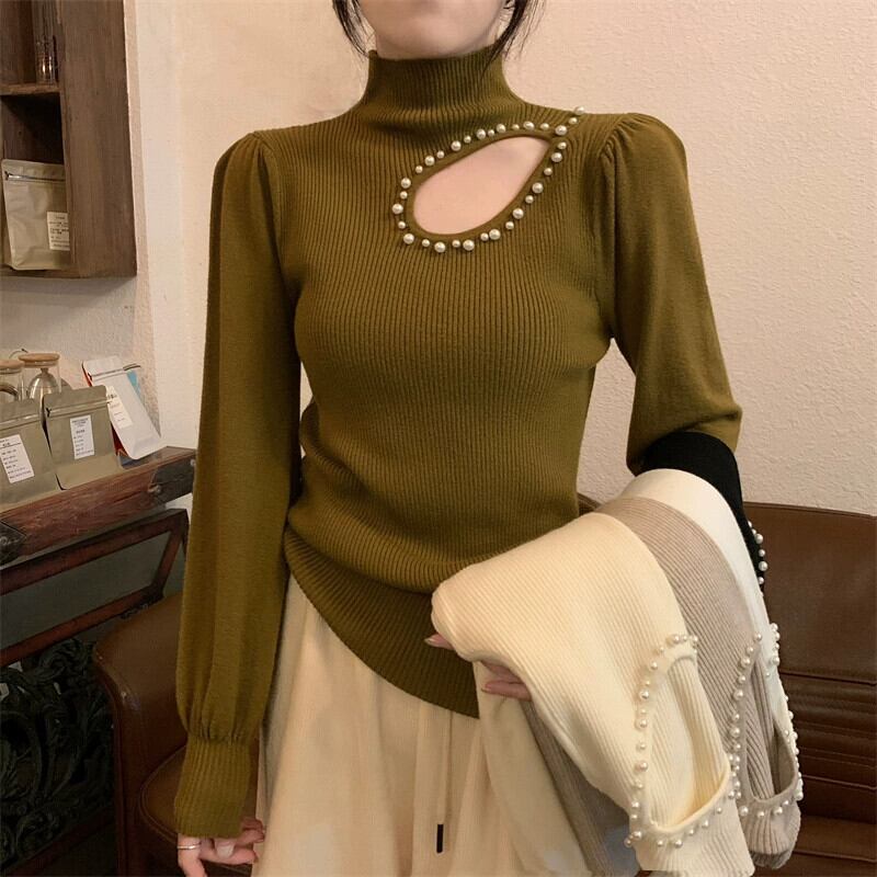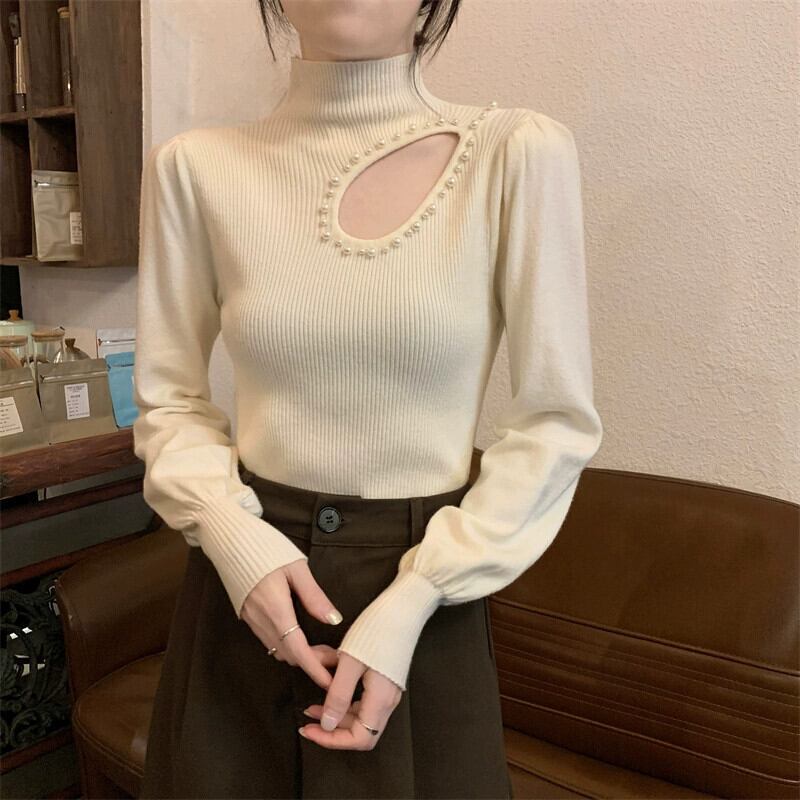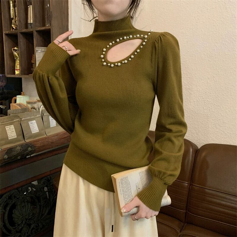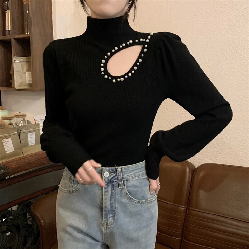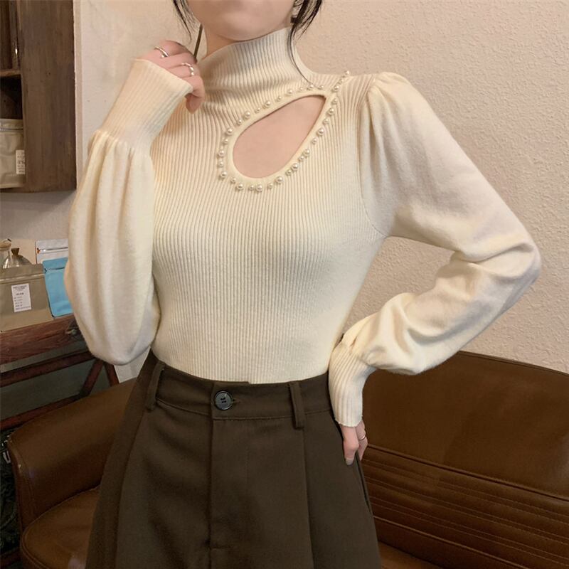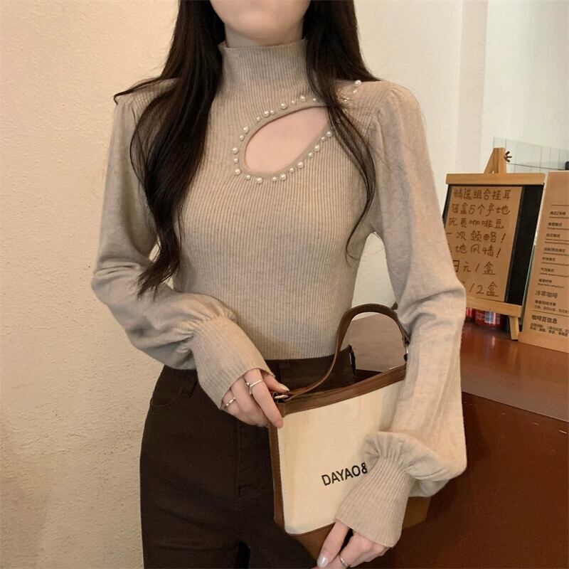 秋冬のパフスリーブ中空ニットボトムシャツレディース、ファッショナブルでスタイリッシュなインナーレイヤー、スリムフィット、ランタンスリーブタートルネックセーター オータム 秋物 ウィンター 冬物 7460077756570066 | framboise21