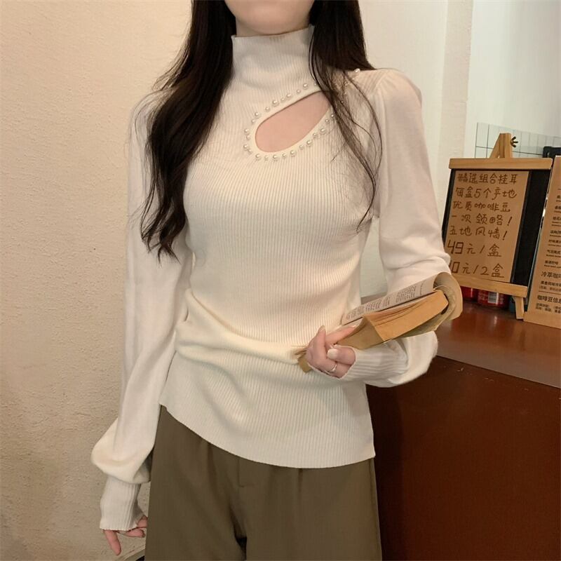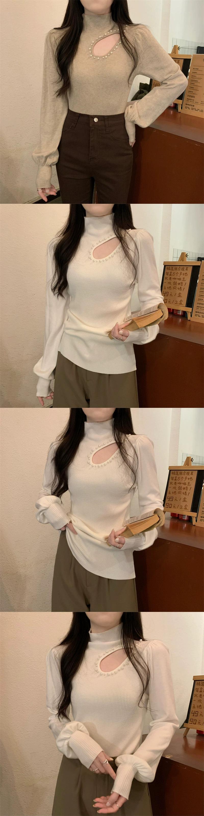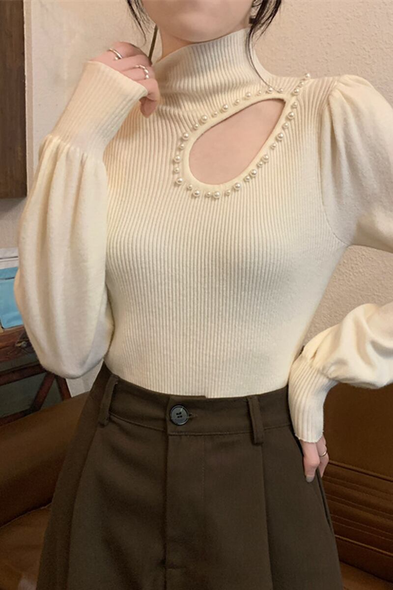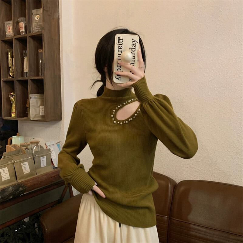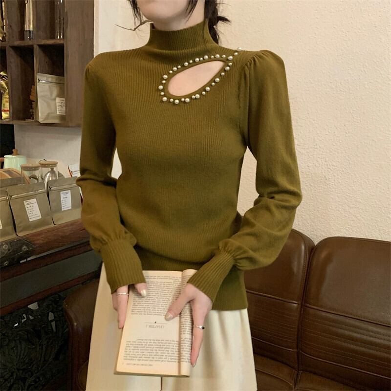 秋冬のパフスリーブ中空ニットボトムシャツレディース、ファッショナブルでスタイリッシュなインナーレイヤー、スリムフィット、ランタンスリーブタートルネックセーター オータム 秋物 ウィンター 冬物 7460077756570066 | framboise21