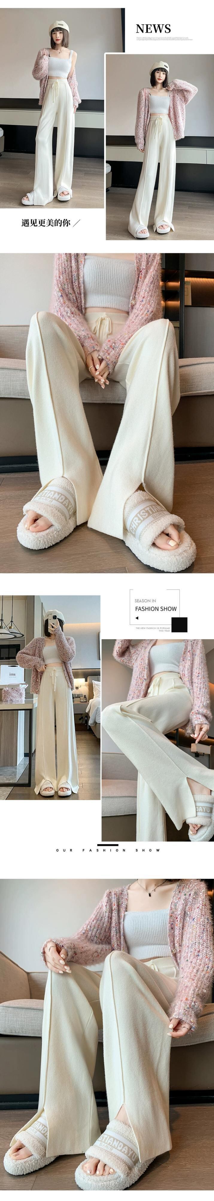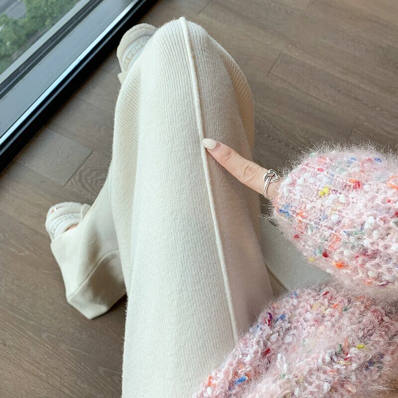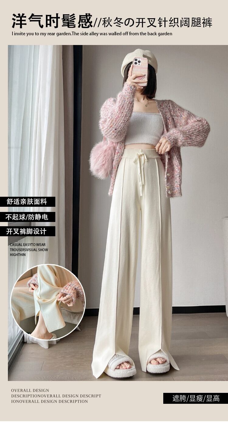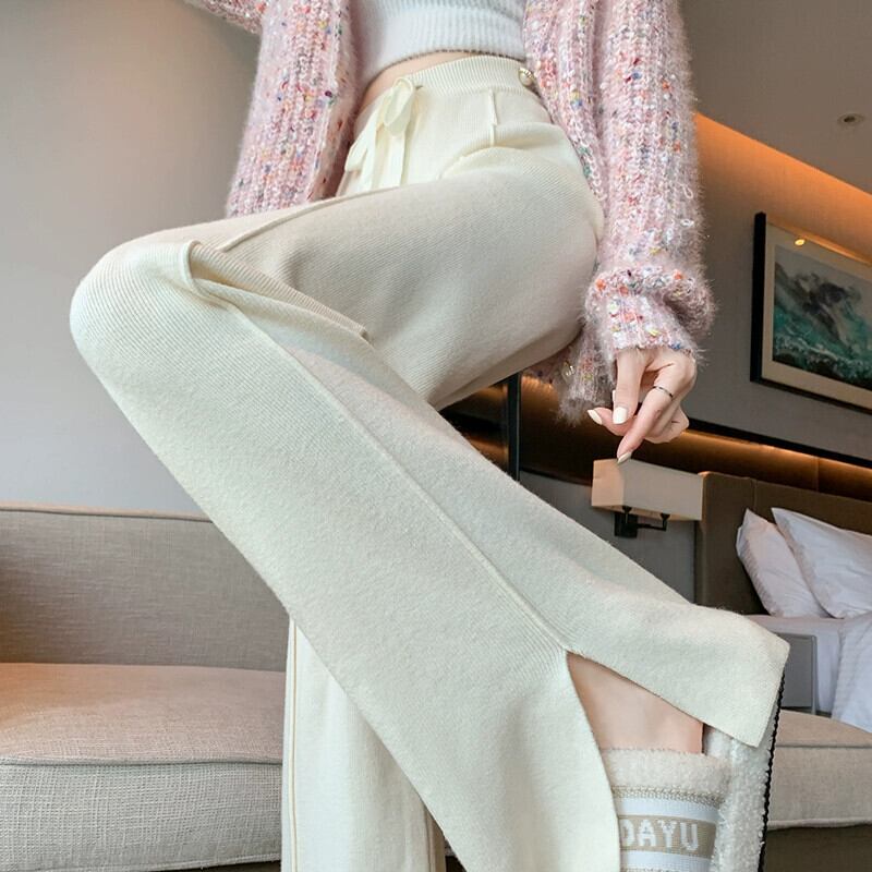 スリットニットワイドレッグパンツレディース、秋と冬のソフトでワックスのようなドレープパンツ、ハイウエスト、スリム、多用途のフロアレングスのストレートカジュアルパンツ オータム 秋物 ウィンター 冬物 7460047054251833 | framboise21