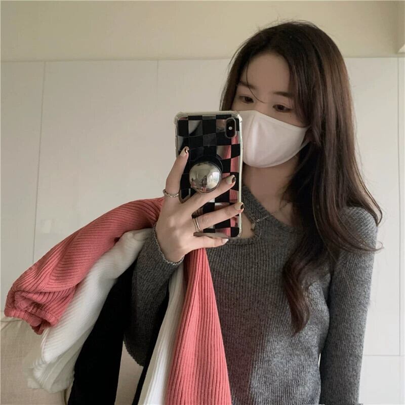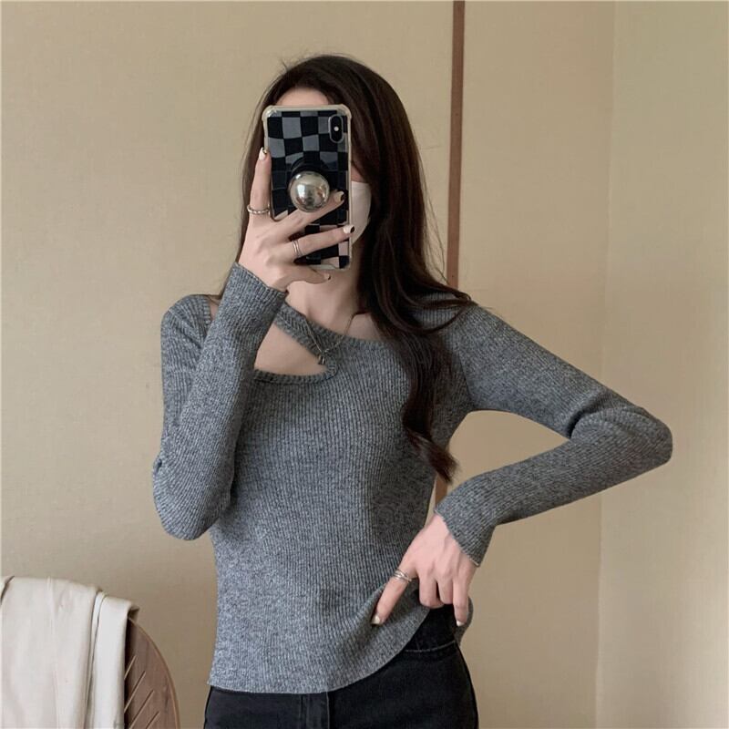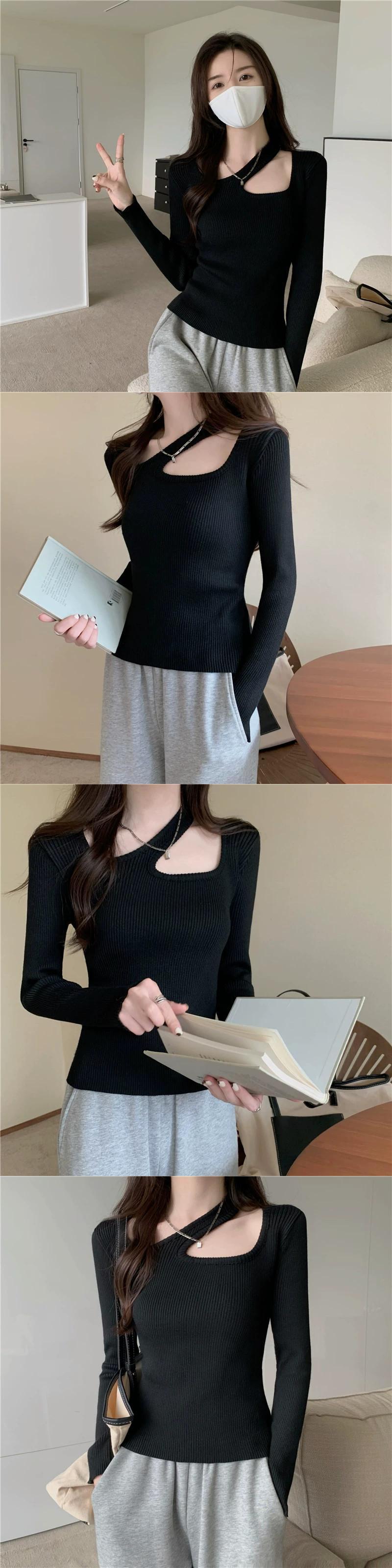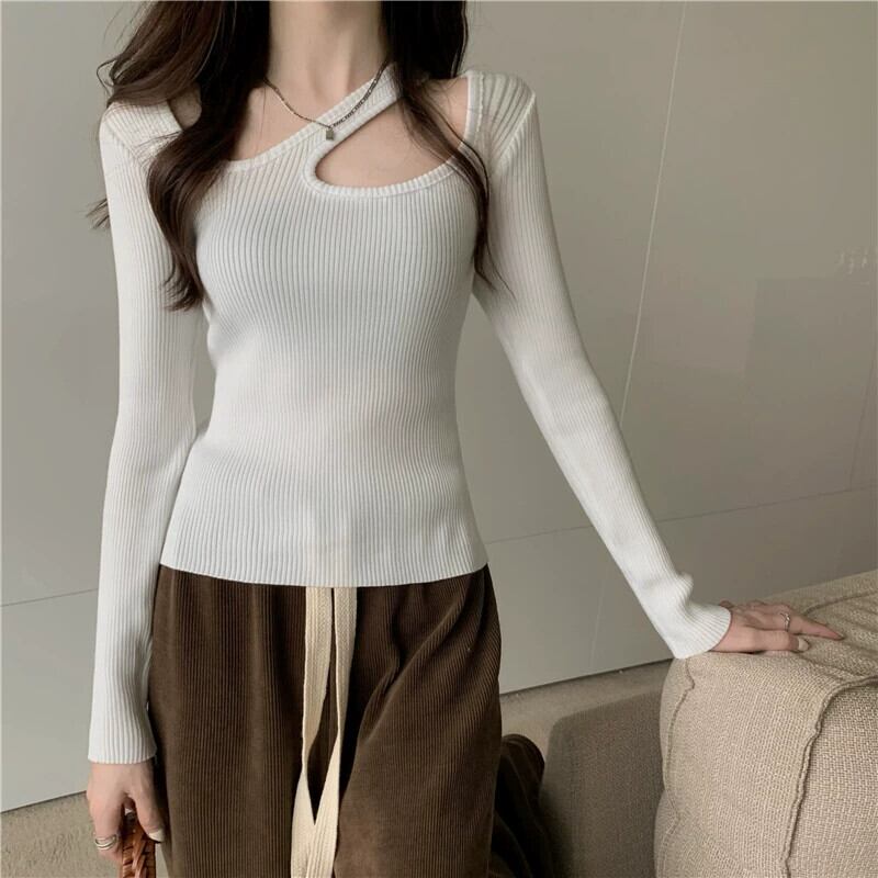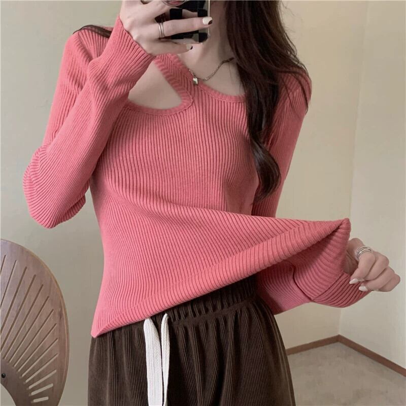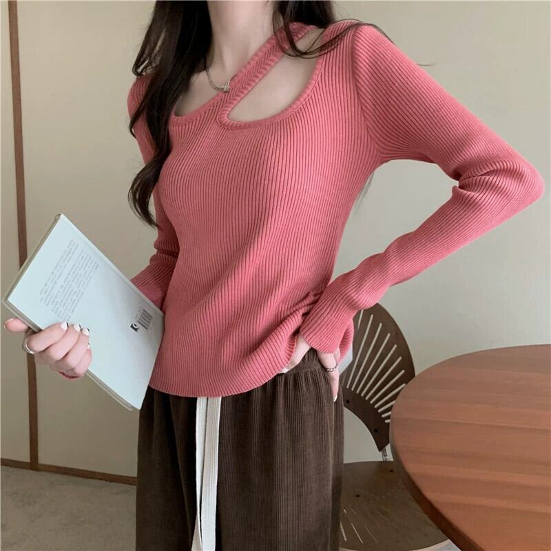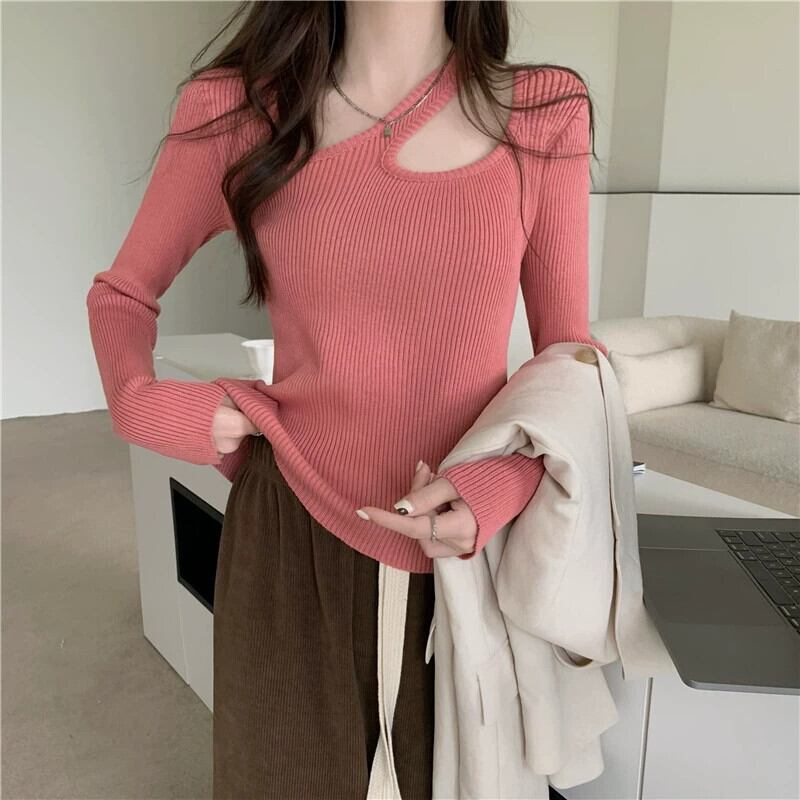 ピンクのニットボトムシャツの女性、秋冬スタイル、短い中空セーター、スリムフィット、斜めの襟、長袖トップ ショート ロング オータム 秋物 ウィンター 冬物 7460052322466837 | framboise21