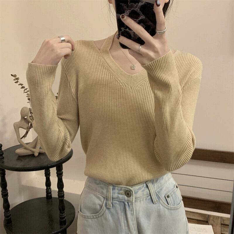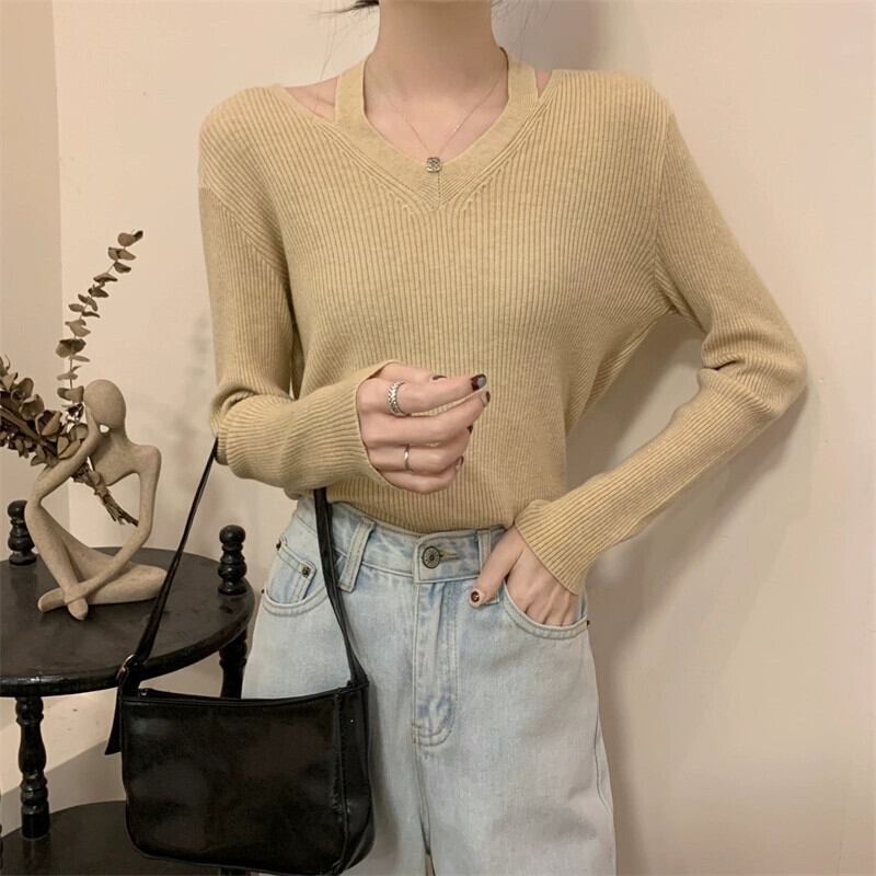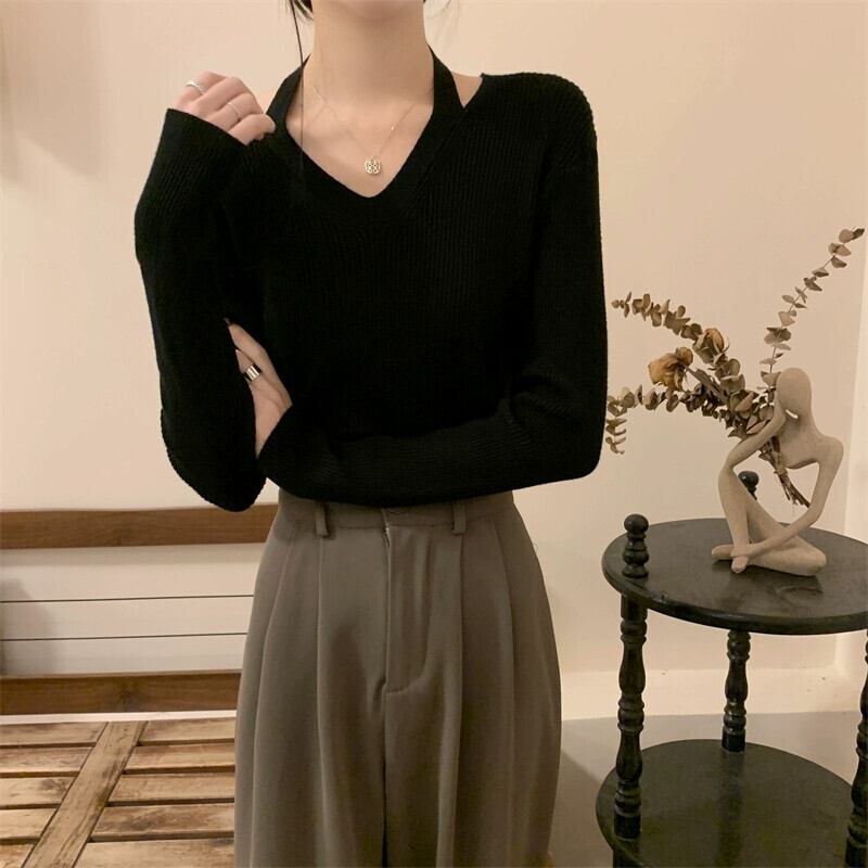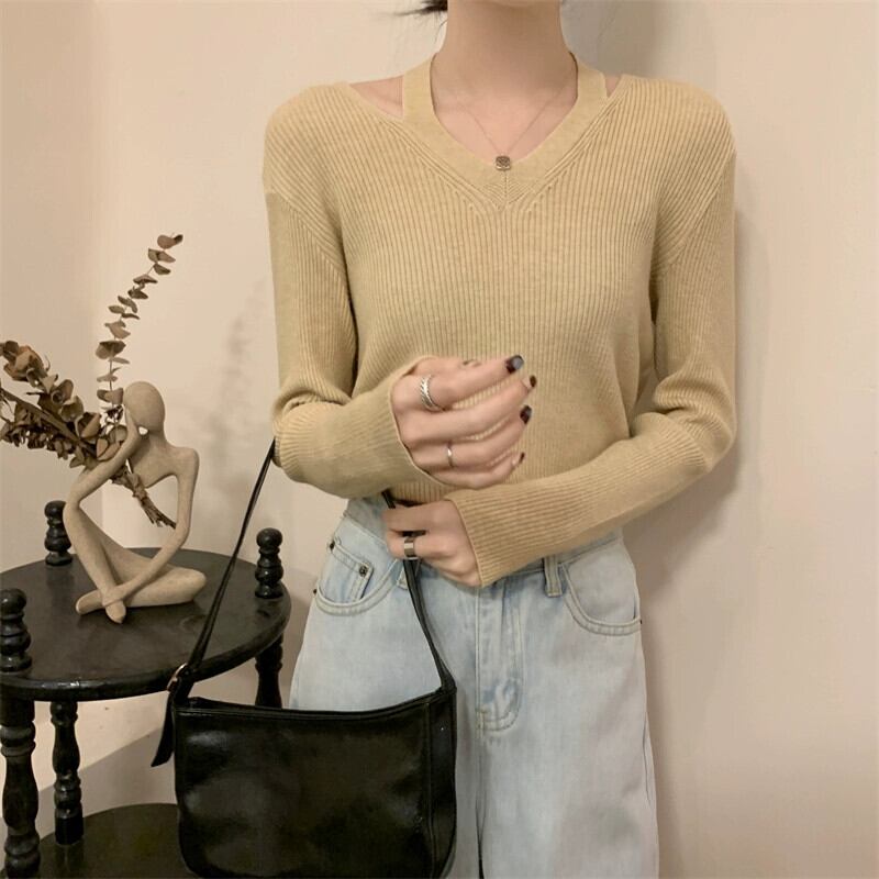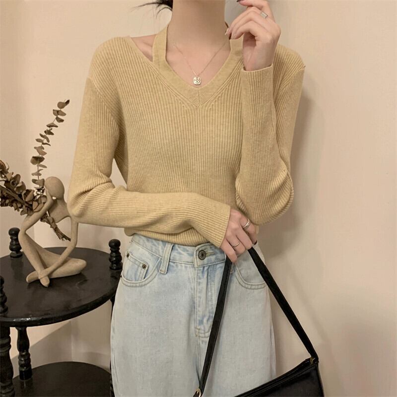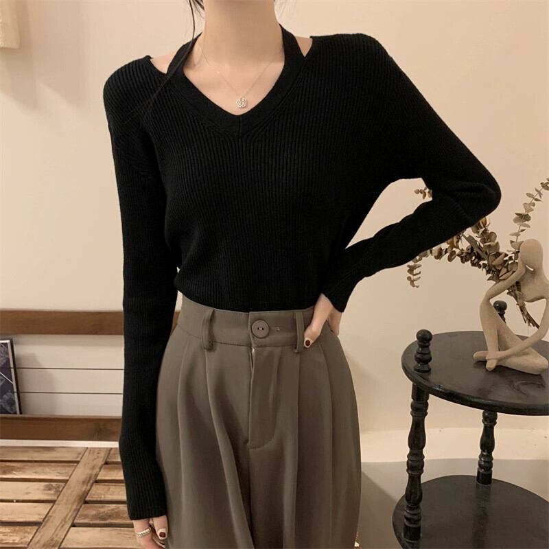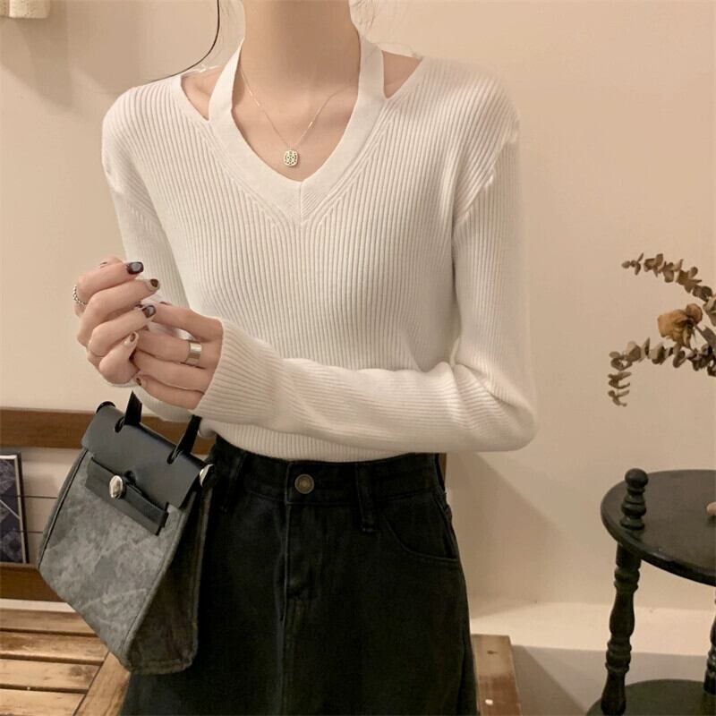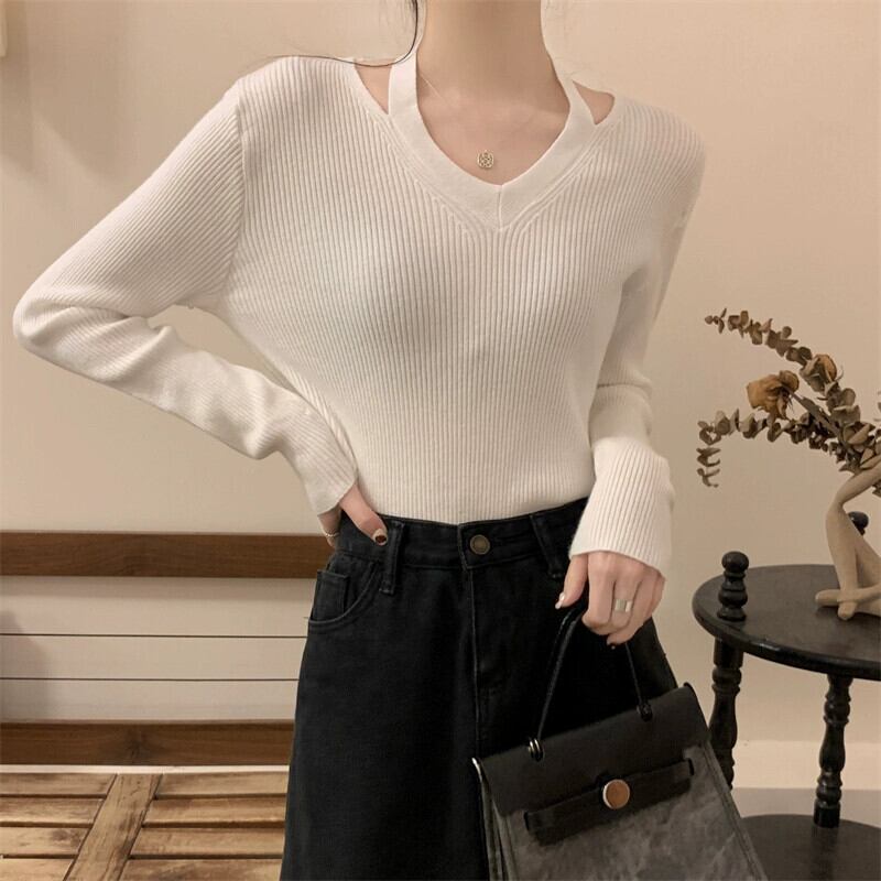 白いホルターネック V ネックボトリングシャツ 2023 新しい女性の秋と冬のファッショナブルでスリムフィットのショートニットセーター ホワイト オータム 秋物 ウィンター 冬物 Vネック 7460045338673272 | framboise21