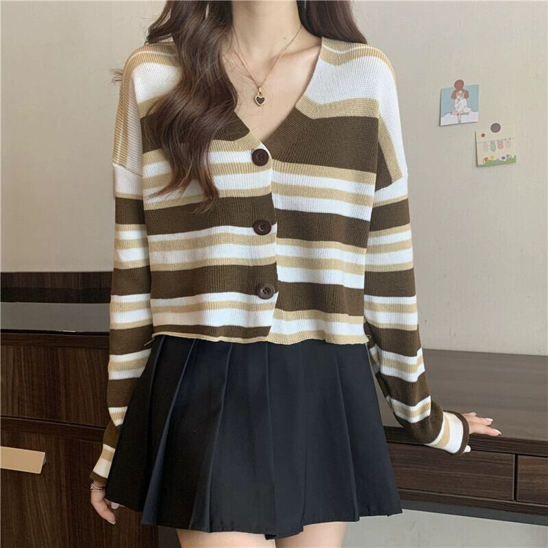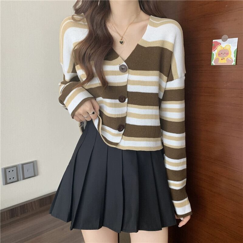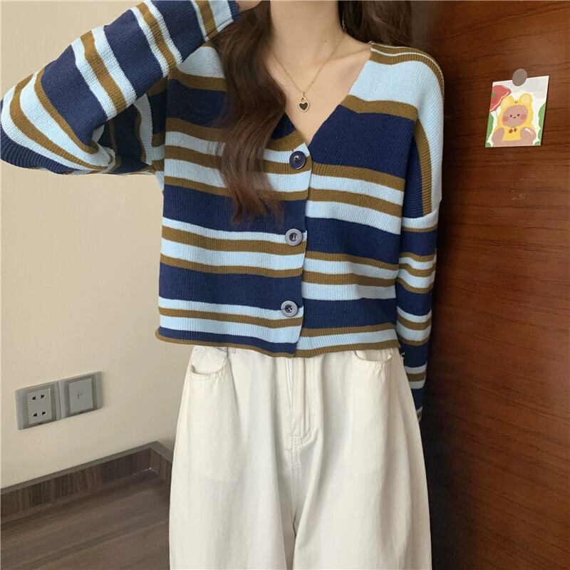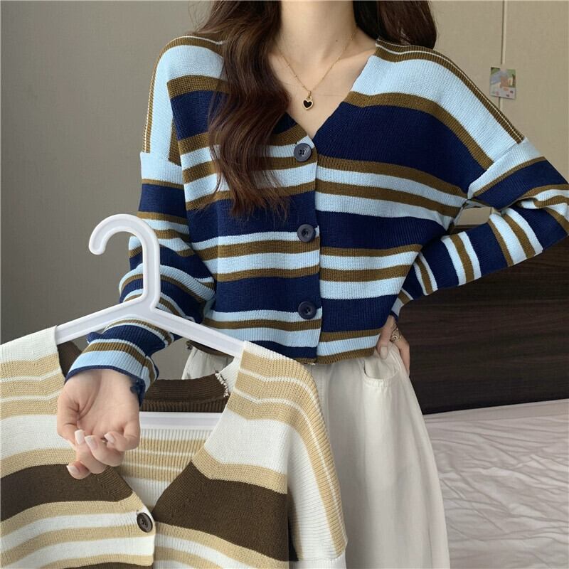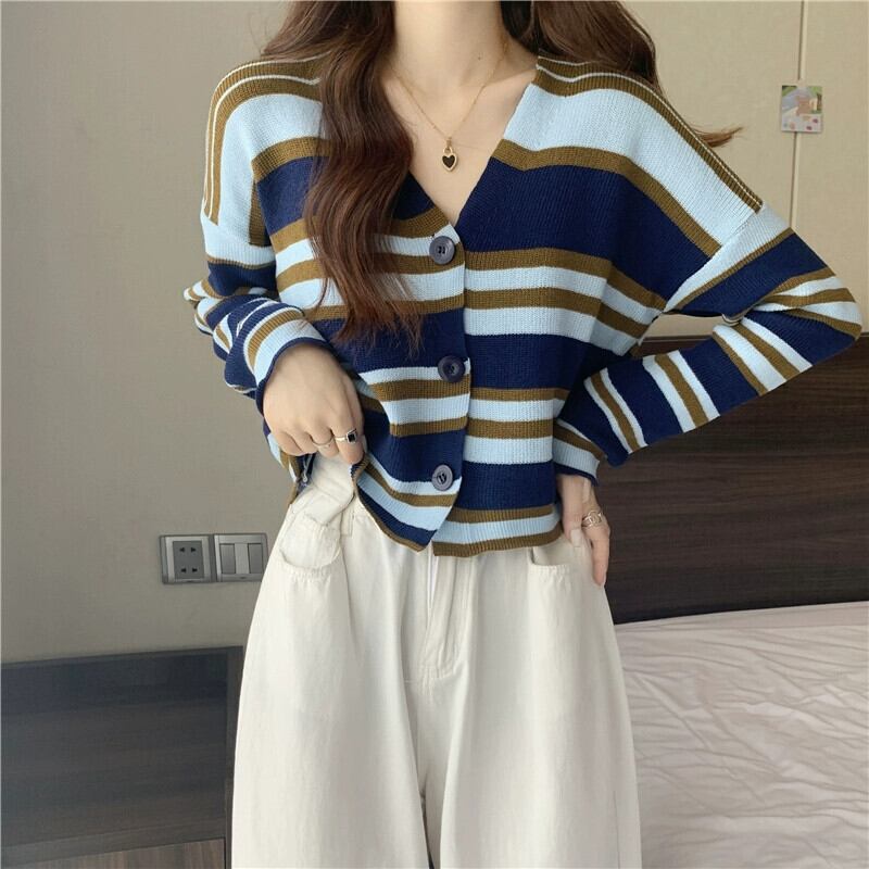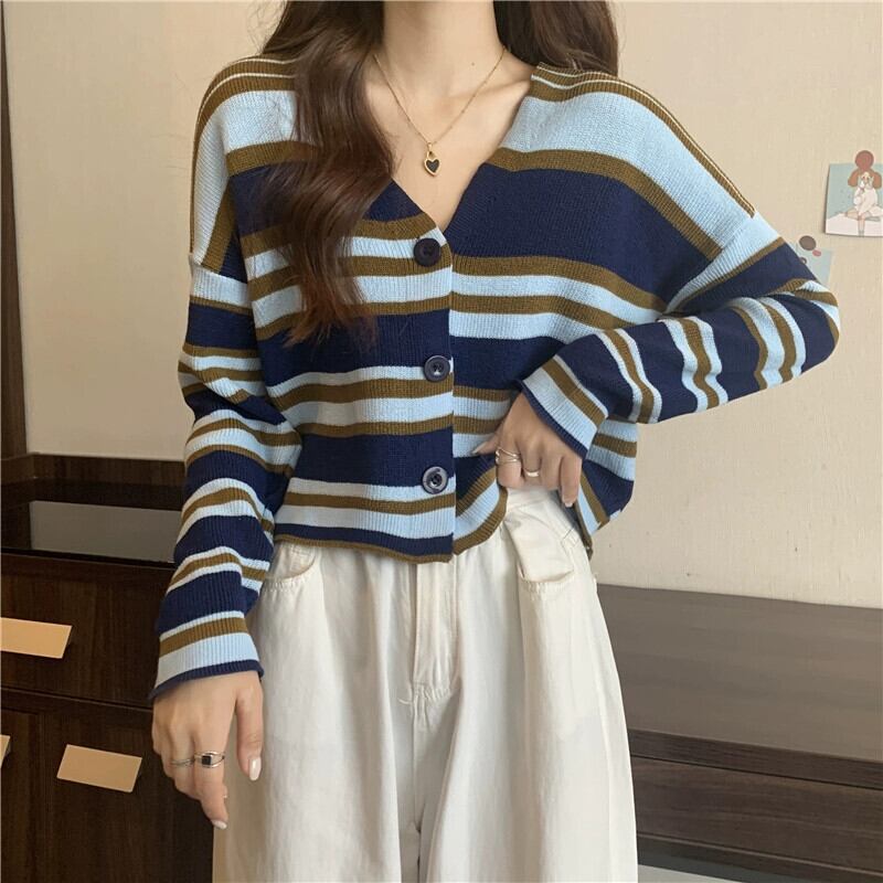 ストライプのショートニットカーディガンジャケット女性の秋と冬のフレンチスタイルのルーズでスリムなアウターウェアカラーブロックVネックセーター オータム 秋物 ウィンター 冬物 7460072609961466 | framboise21