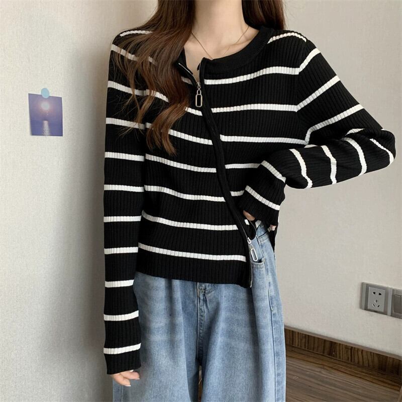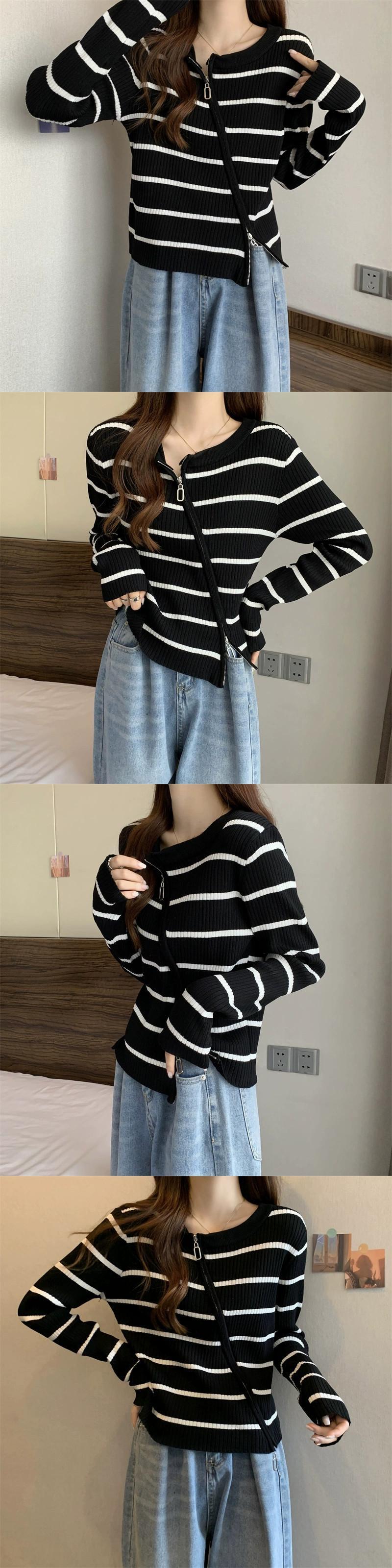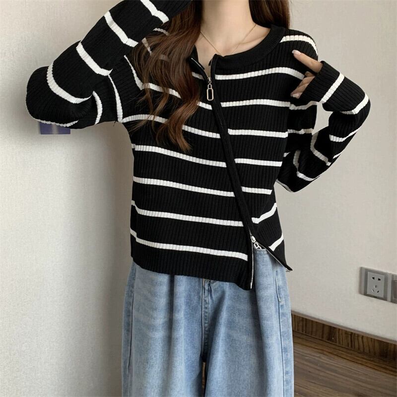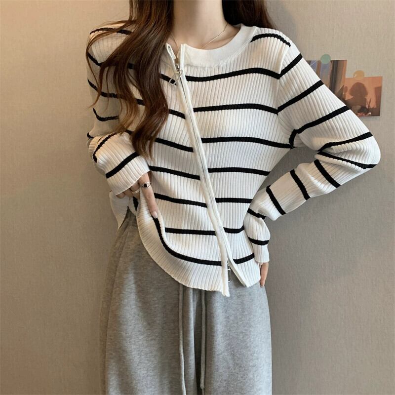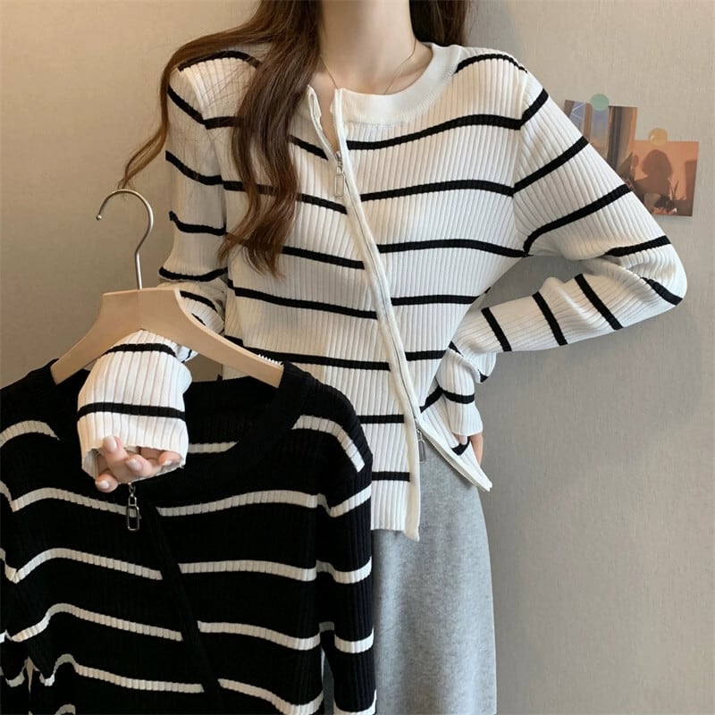 秋冬のダブルジッパーストライプニットカーディガン女性、ファッショナブル、ルーズでスリム、ラウンドネック長袖セータージャケット ロング オータム 秋物 ウィンター 冬物 Oネック 7460045602853161 | framboise21