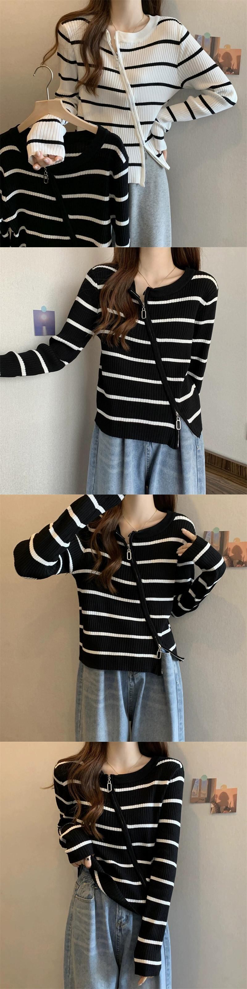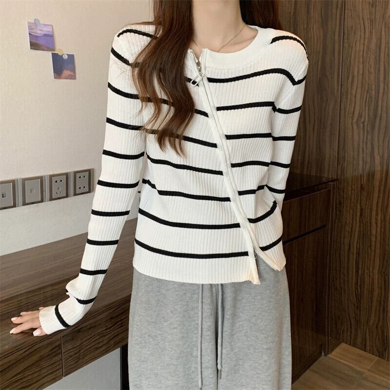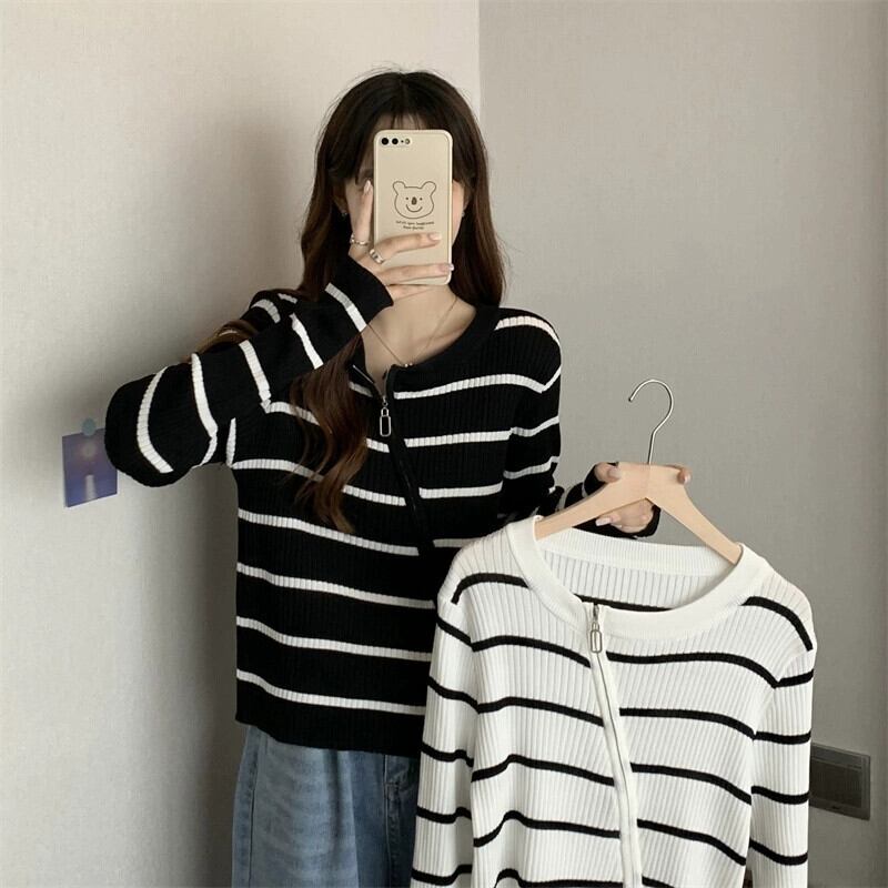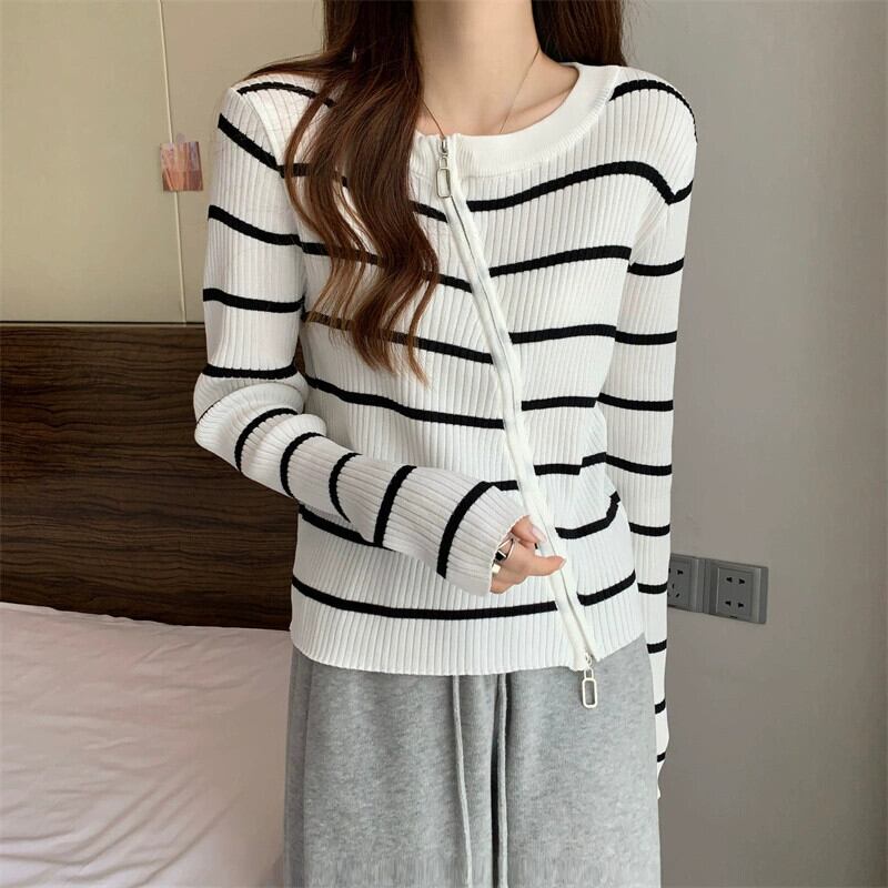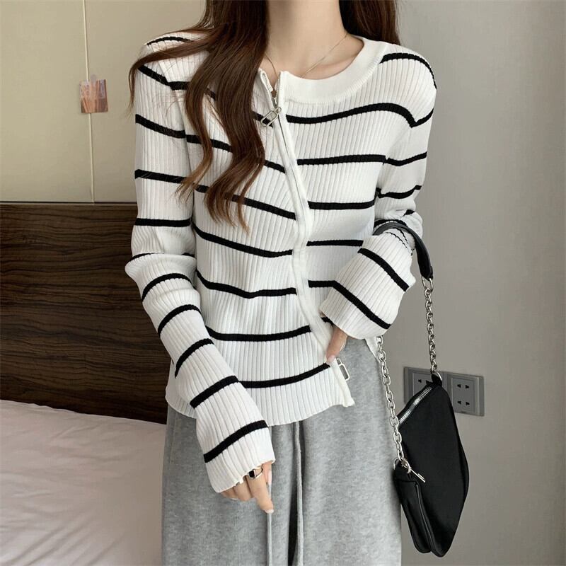 秋冬のダブルジッパーストライプニットカーディガン女性、ファッショナブル、ルーズでスリム、ラウンドネック長袖セータージャケット ロング オータム 秋物 ウィンター 冬物 Oネック 7460045602853161 | framboise21