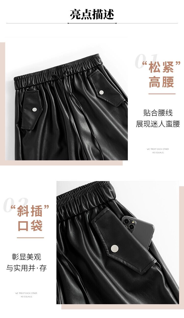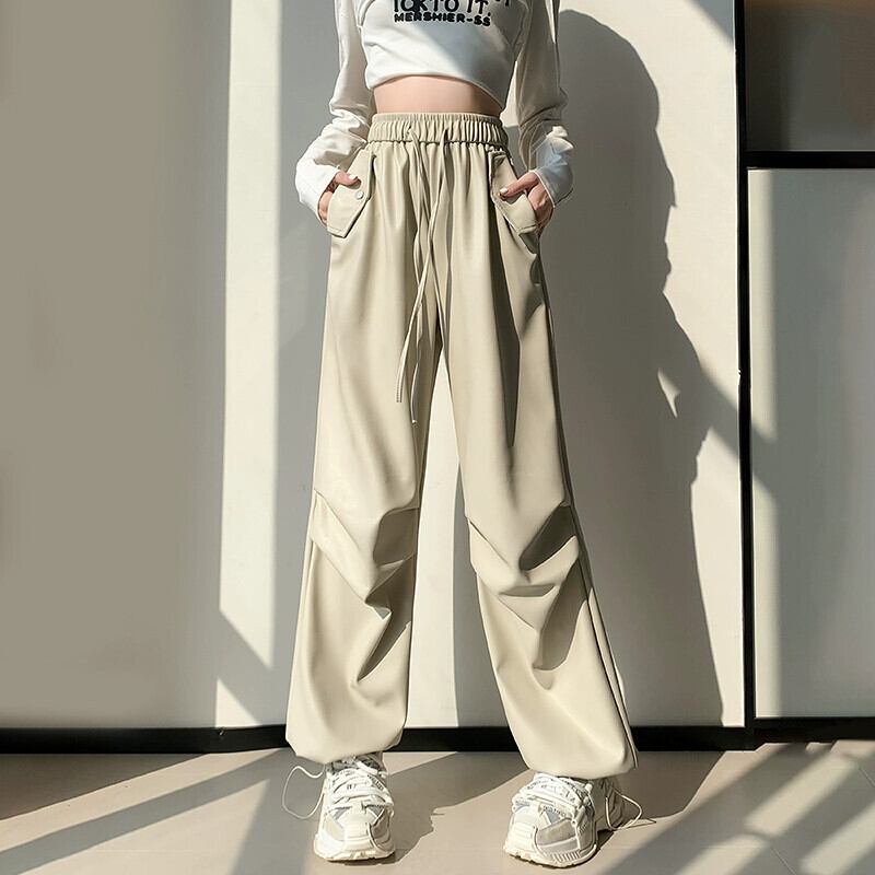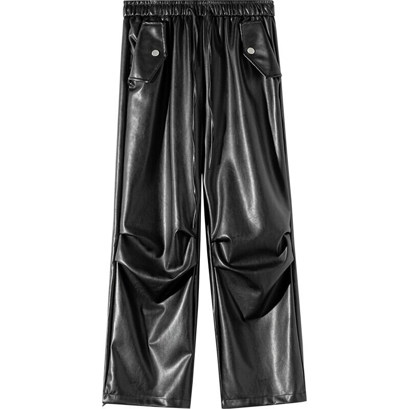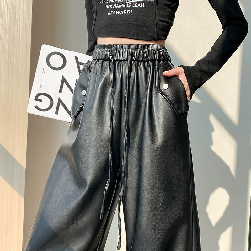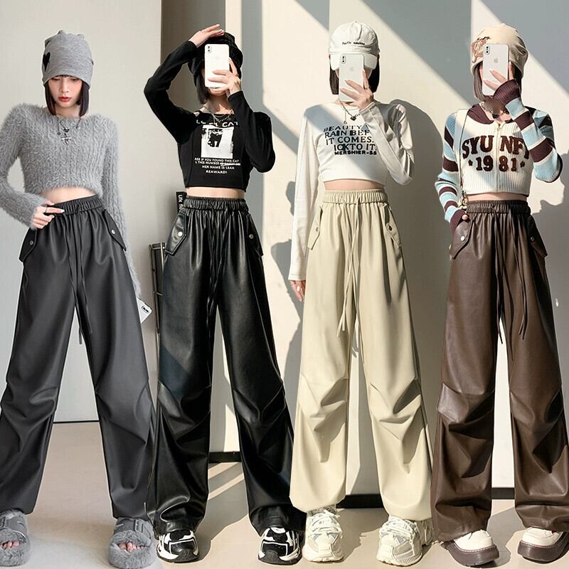 レッグタイオーバーオールレディース、2023年秋冬新作スーパーソフトPUレザーパンツ、ワイドレッグパンツ、ハイウエストストレートカジュアルパンツ オータム 秋物 ウィンター 冬物 7460033255646960 | framboise21