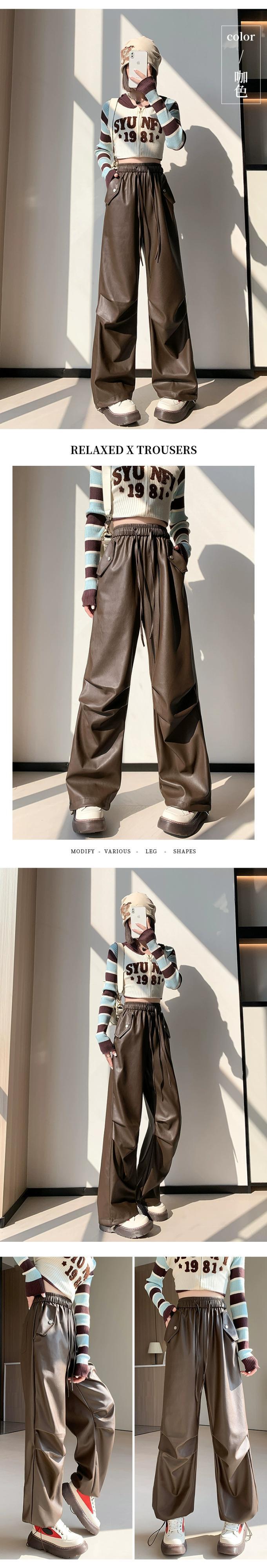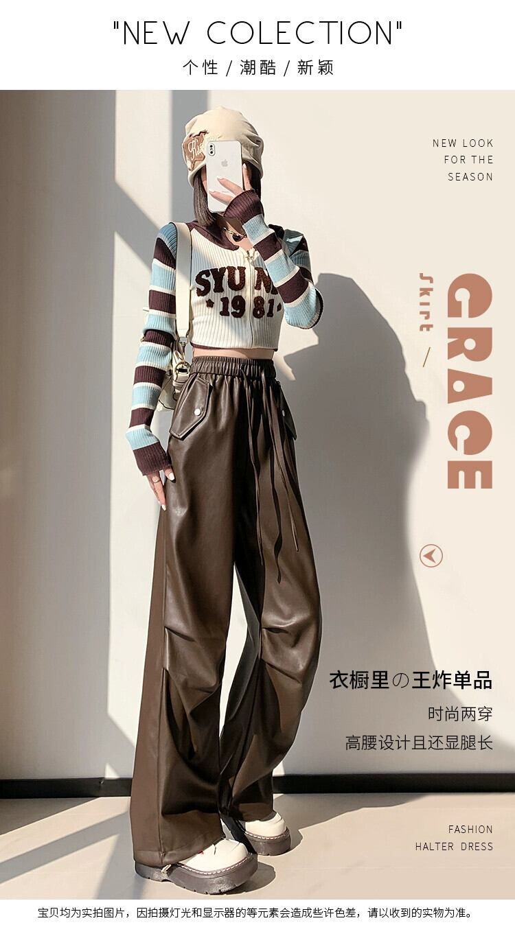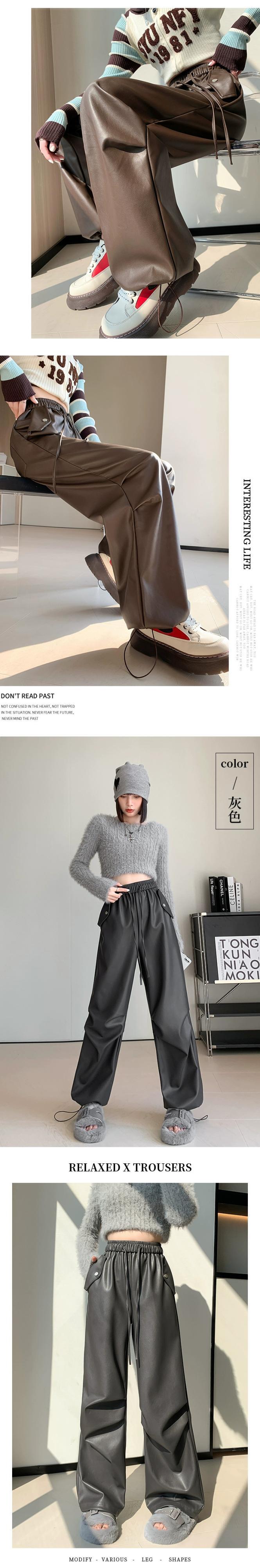 レッグタイオーバーオールレディース、2023年秋冬新作スーパーソフトPUレザーパンツ、ワイドレッグパンツ、ハイウエストストレートカジュアルパンツ オータム 秋物 ウィンター 冬物 7460033255646960 | framboise21
