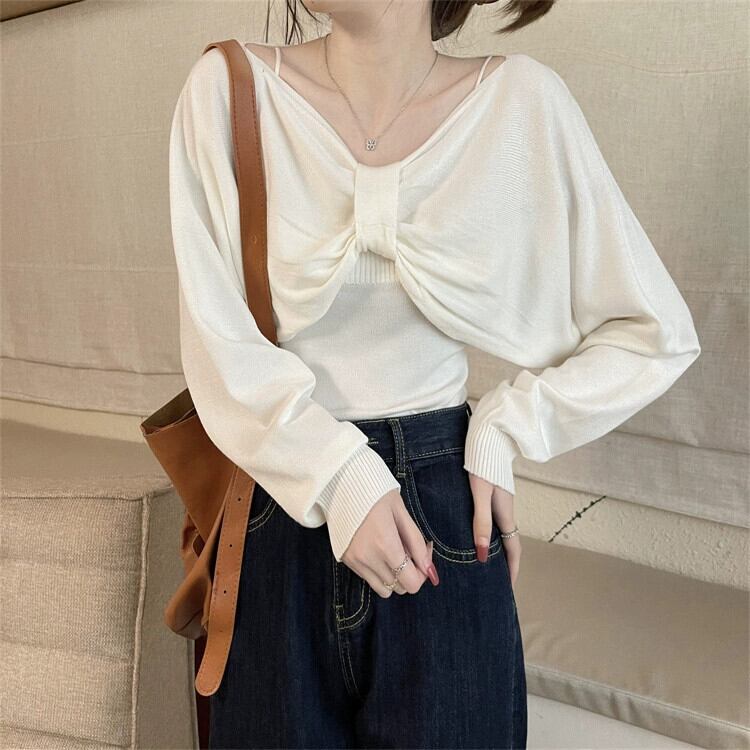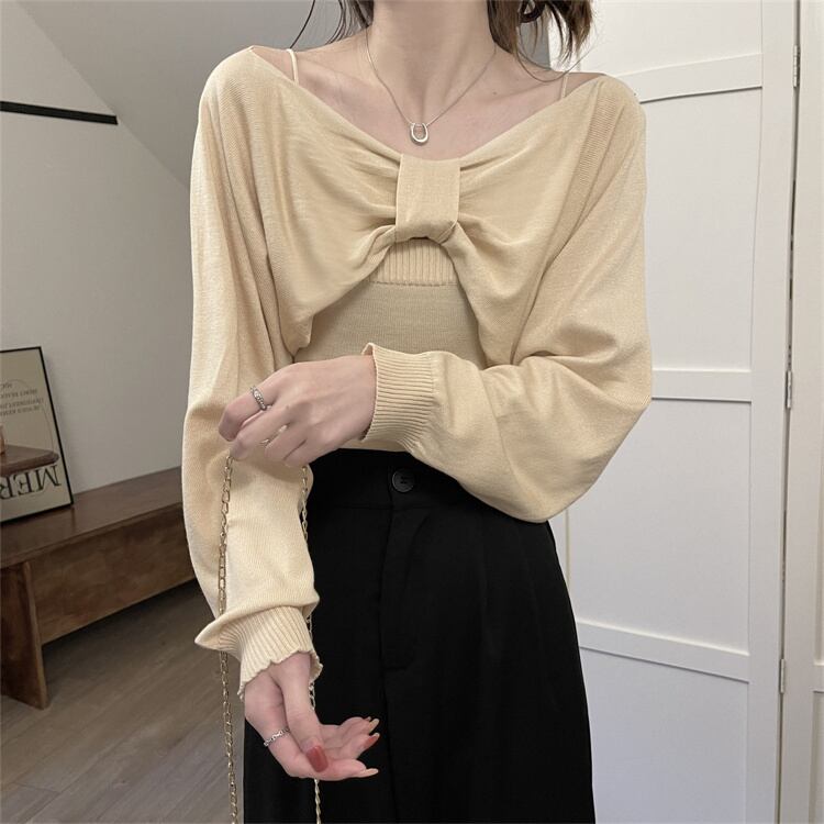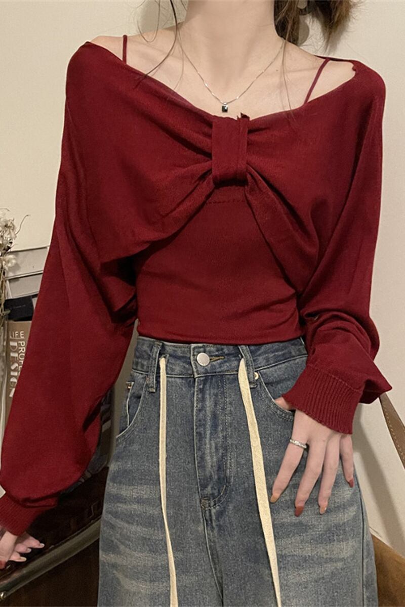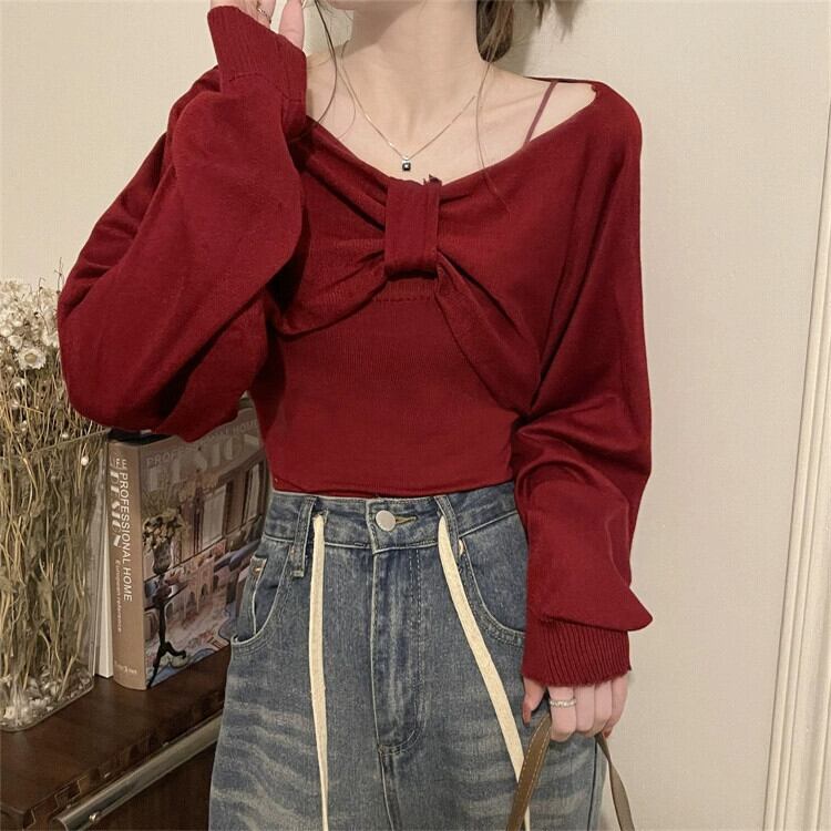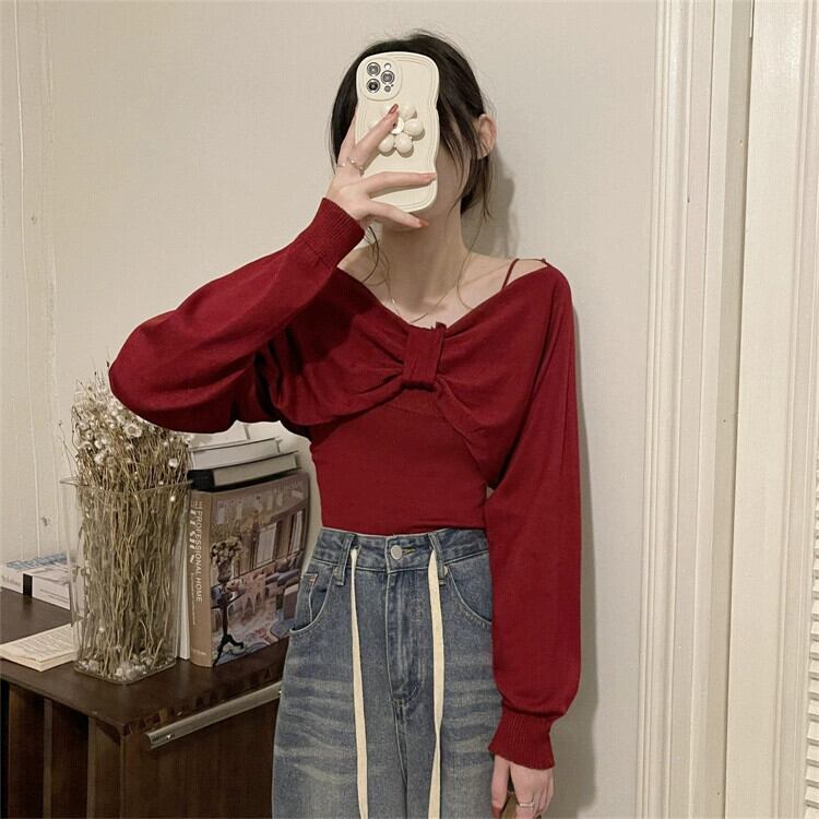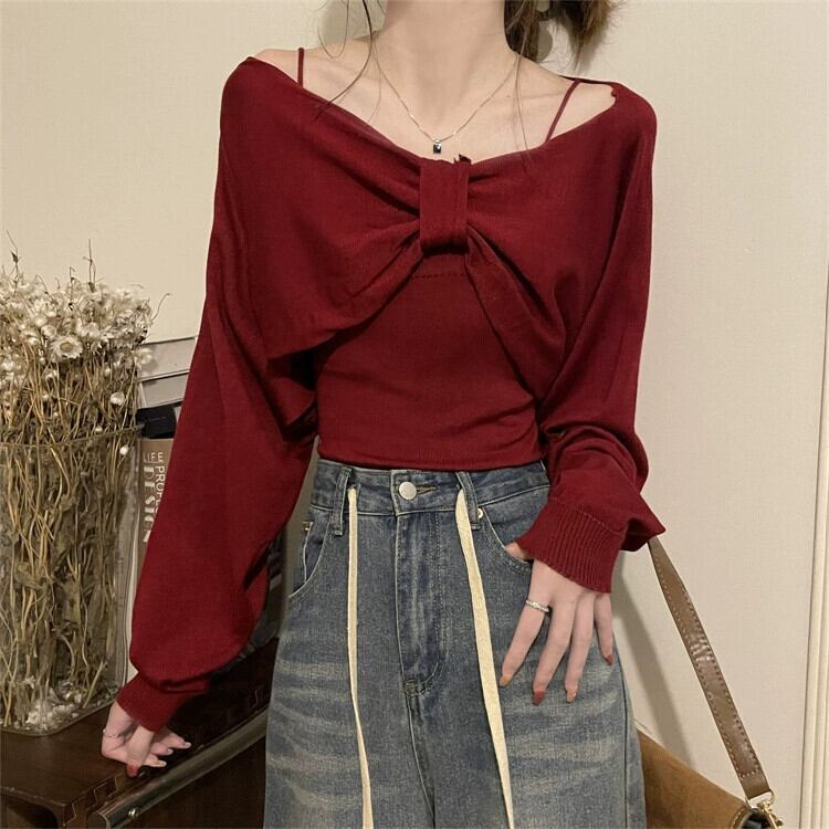 ブルゴーニュショートボトシャツ女性の秋と冬のハイエンドデザインスリムリボンセーターワンショルダーニットトップ オータム 秋物 ウィンター 冬物 7460068601283347 | framboise21