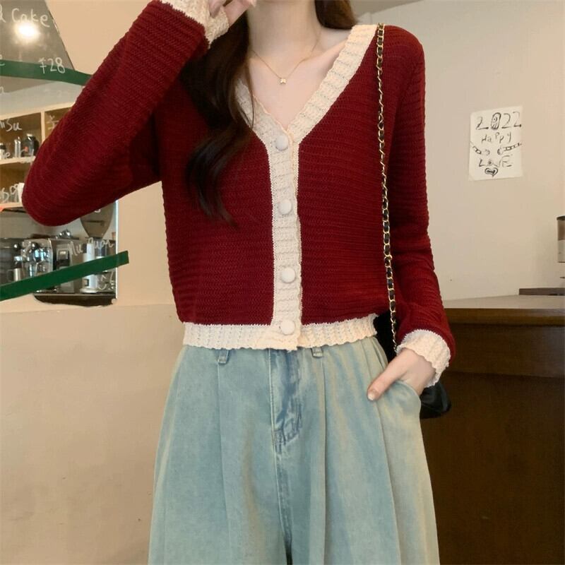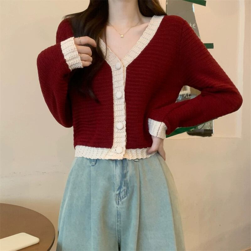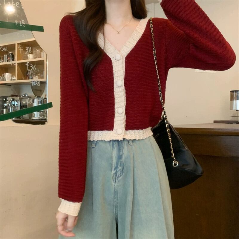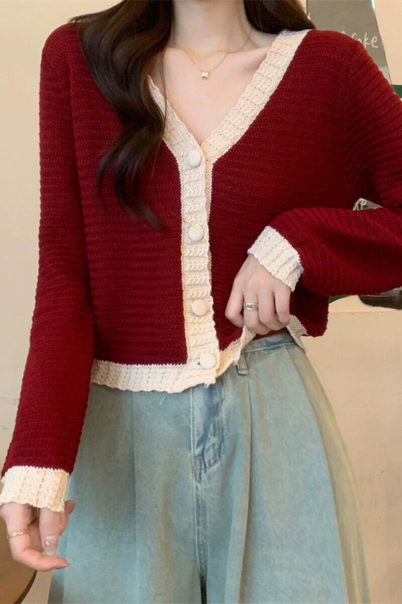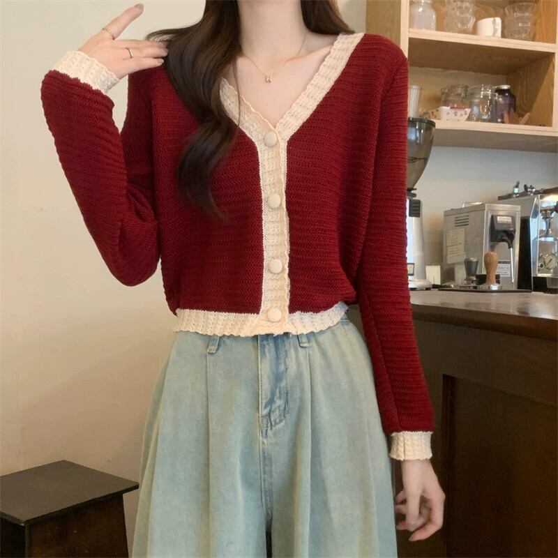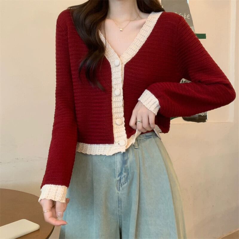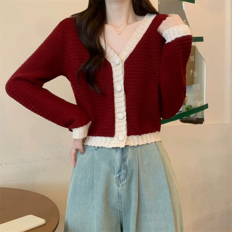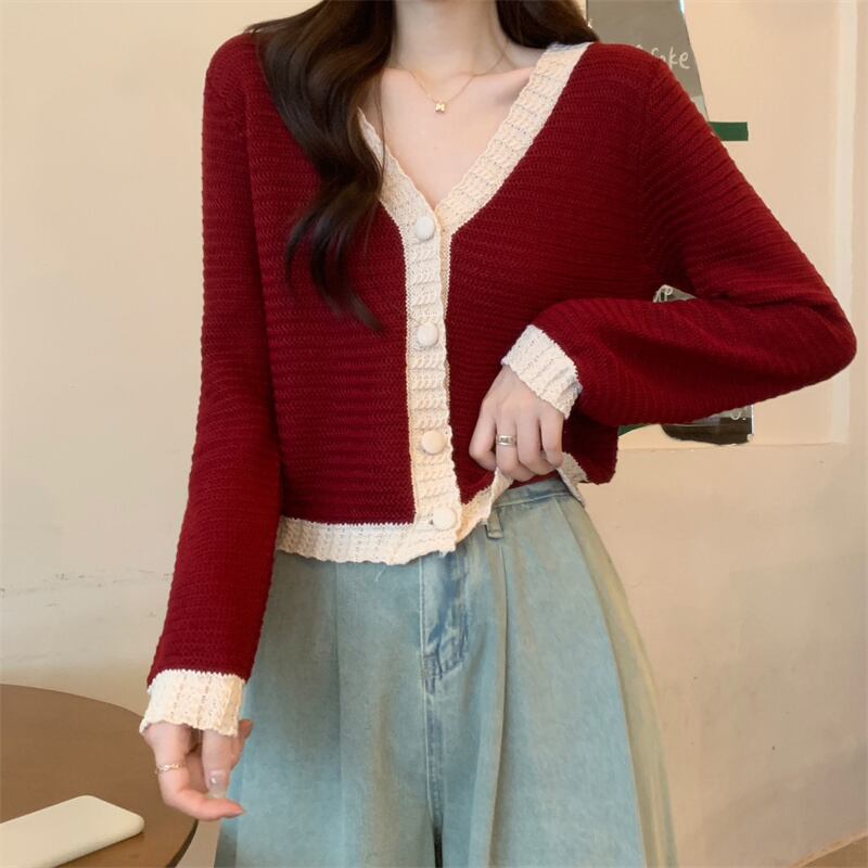 赤いショートセータージャケットの女性の秋と冬2023新デザインルーズアウターウェア対照的なvネックニットカーディガン レッド オータム 秋物 ウィンター 冬物 7460086008920741 | framboise21