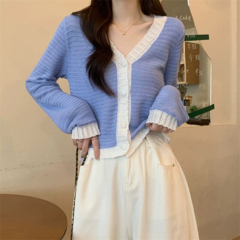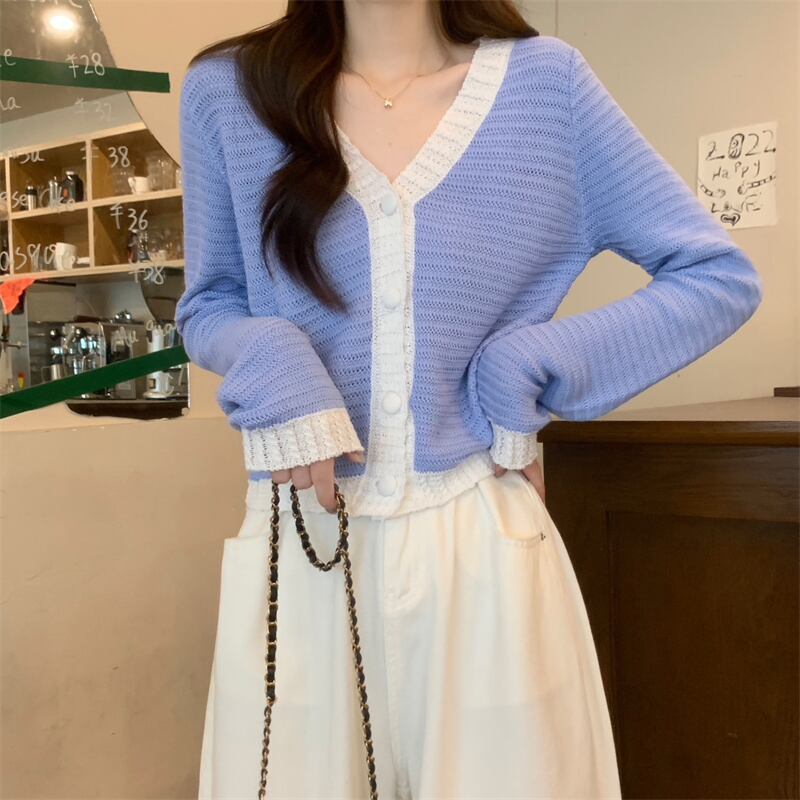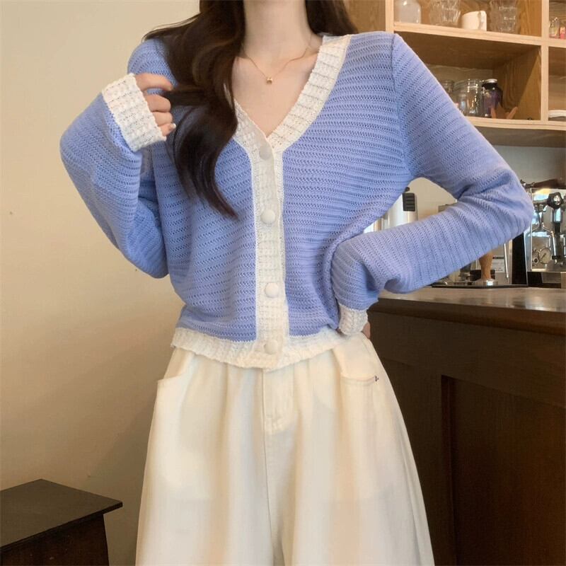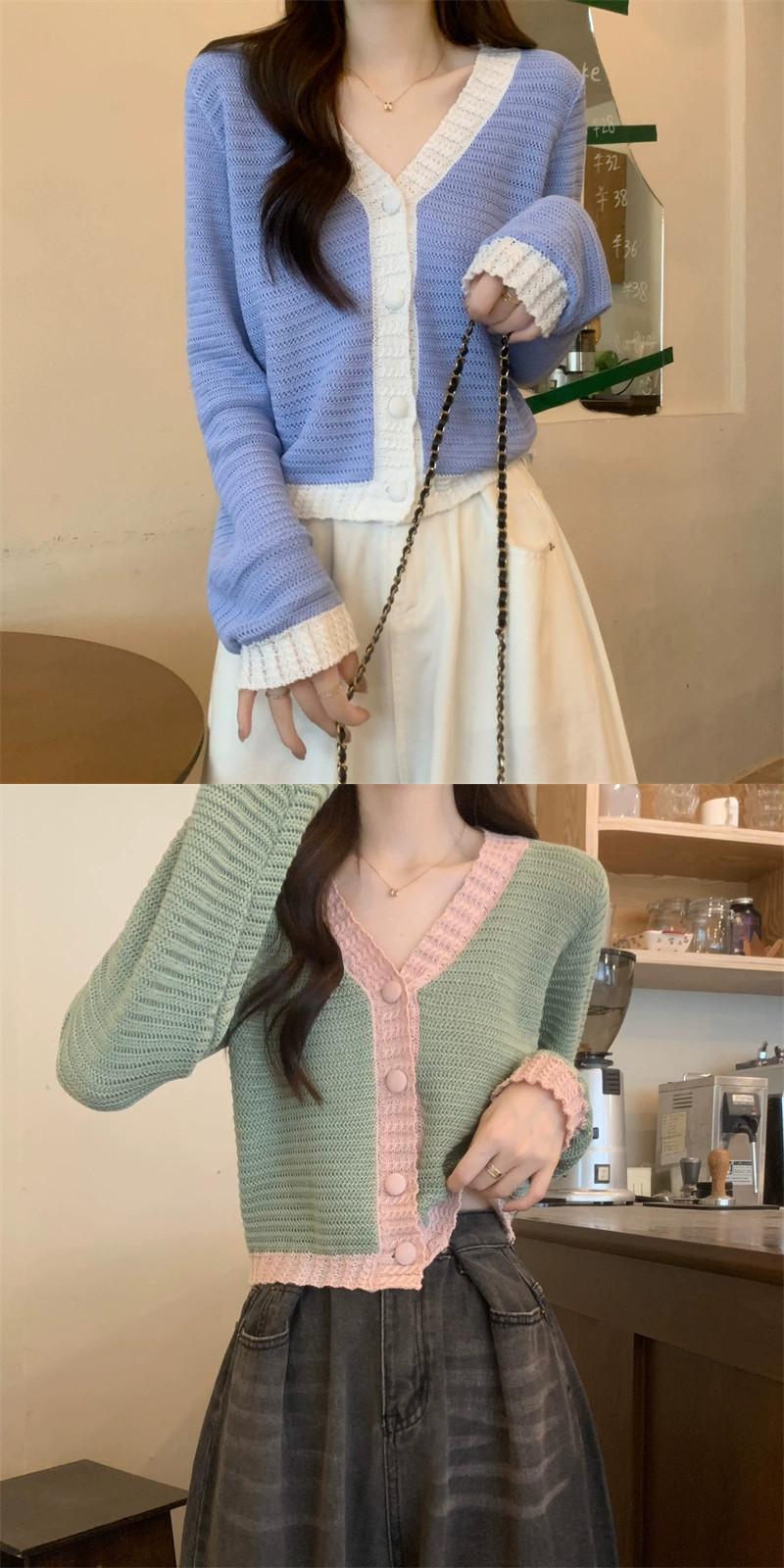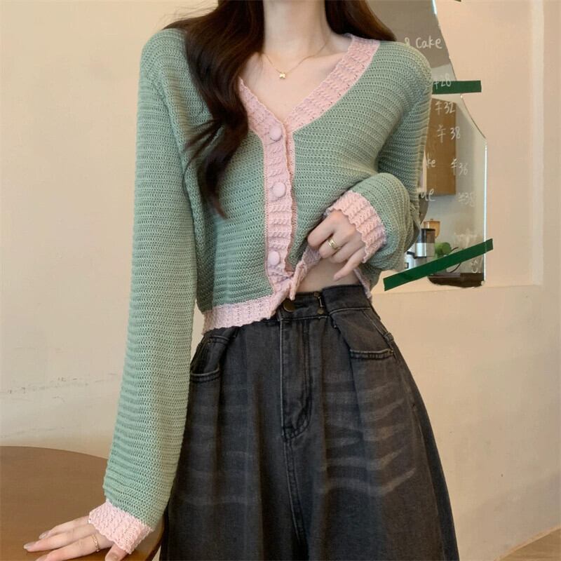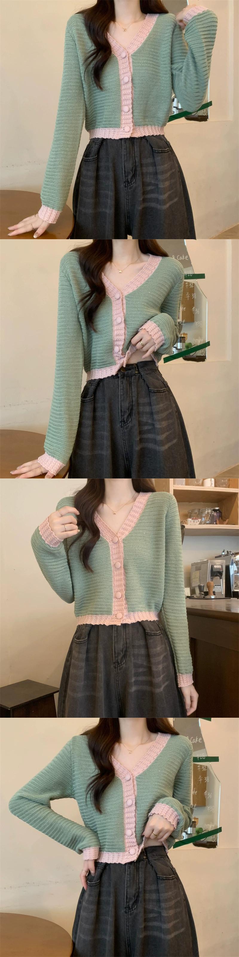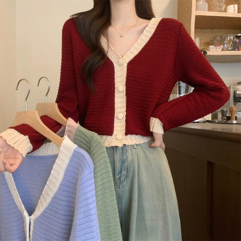 赤いショートセータージャケットの女性の秋と冬2023新デザインルーズアウターウェア対照的なvネックニットカーディガン レッド オータム 秋物 ウィンター 冬物 7460086008920741 | framboise21