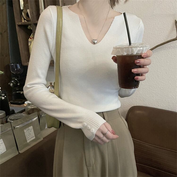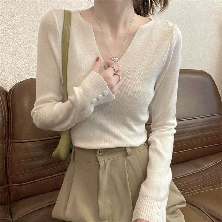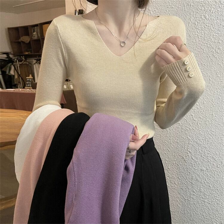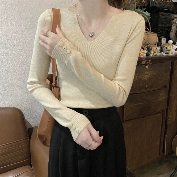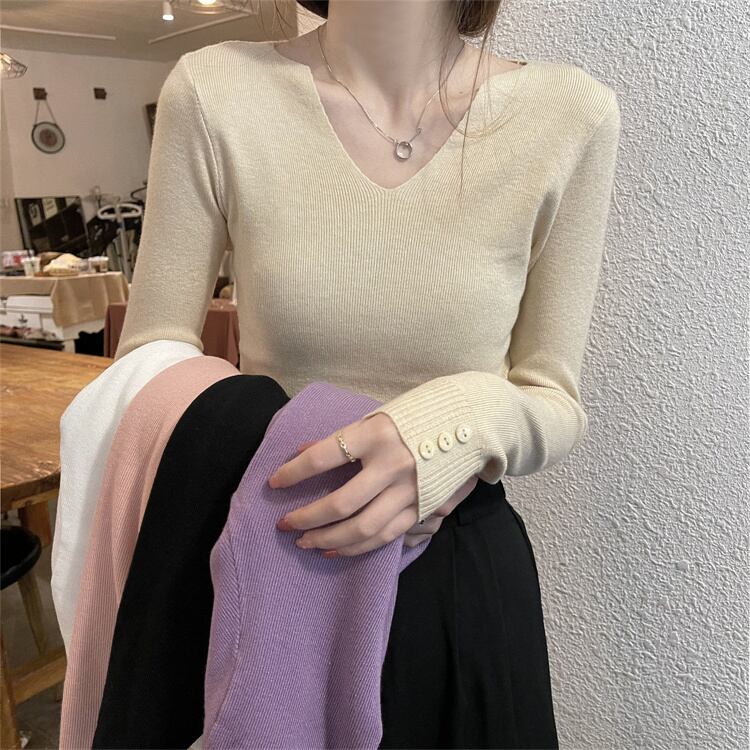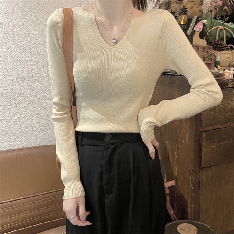 アプリコット V ネックボトリングシャツ 2023 新しい女性の秋と冬のファッショナブルなスタイルのインナー、スリムフィット長袖ニットセーター ロング オータム 秋物 ウィンター 冬物 Vネック 7460080064354224 | framboise21