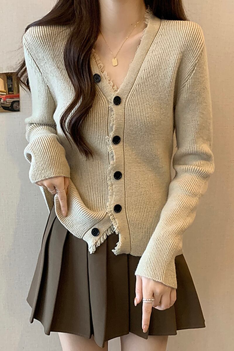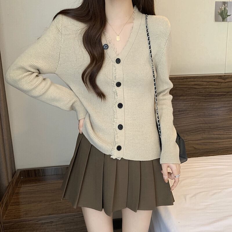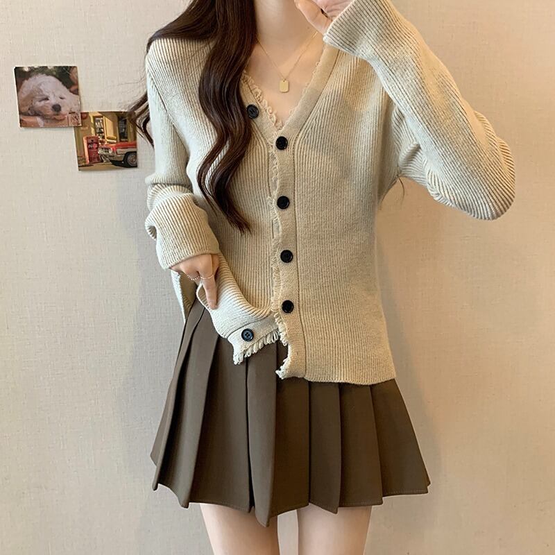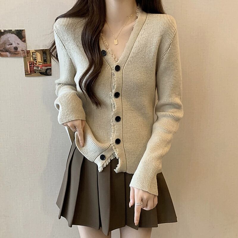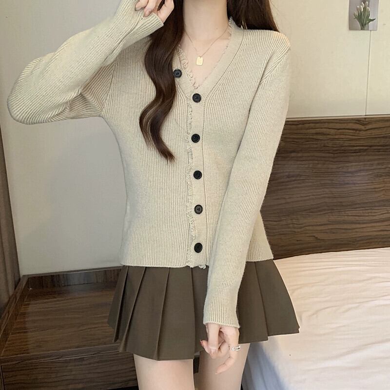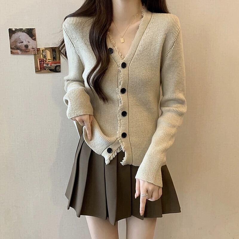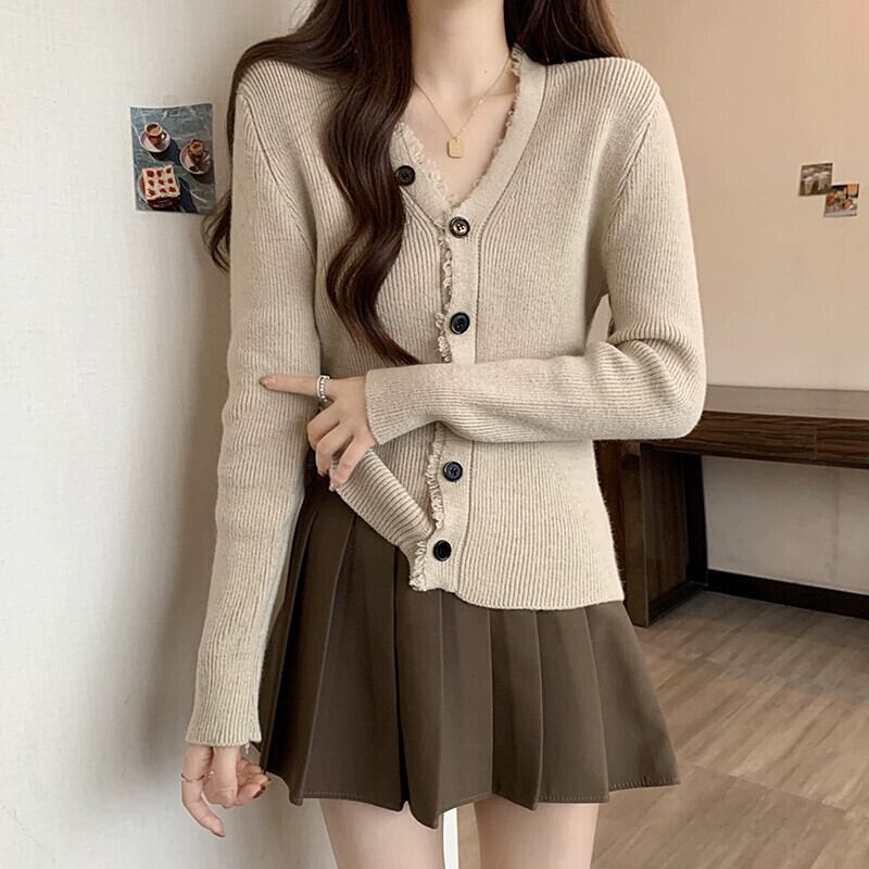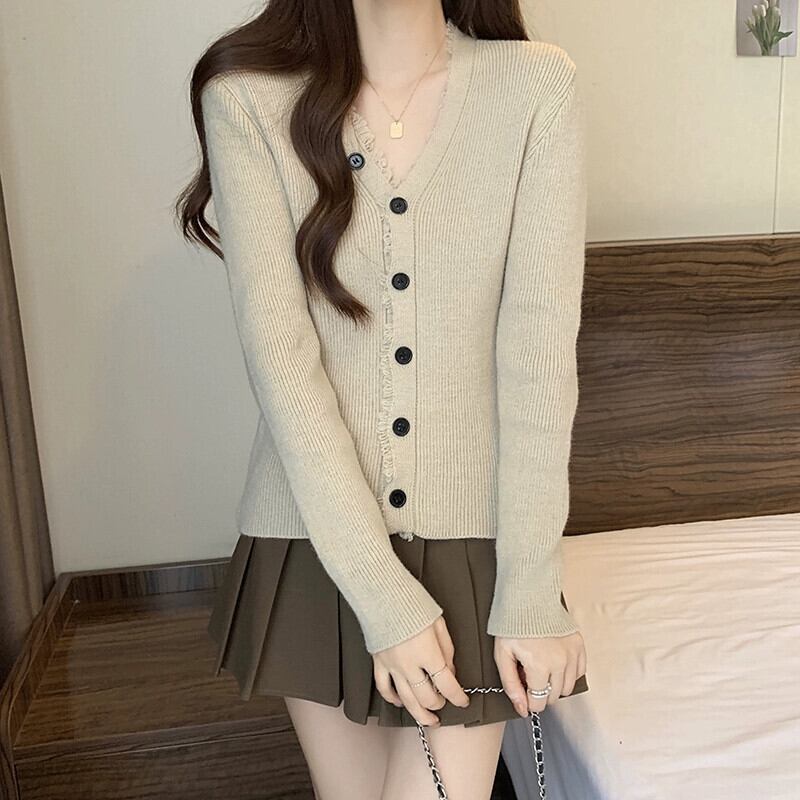 秋冬のテルショートニットカーディガンジャケットレディース。スリムでスリムになるためにed。万能な長袖Vネックセーター。 ロング オータム 秋物 ウィンター 冬物 7460077359701170 | framboise21