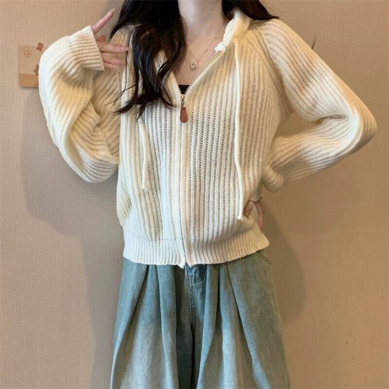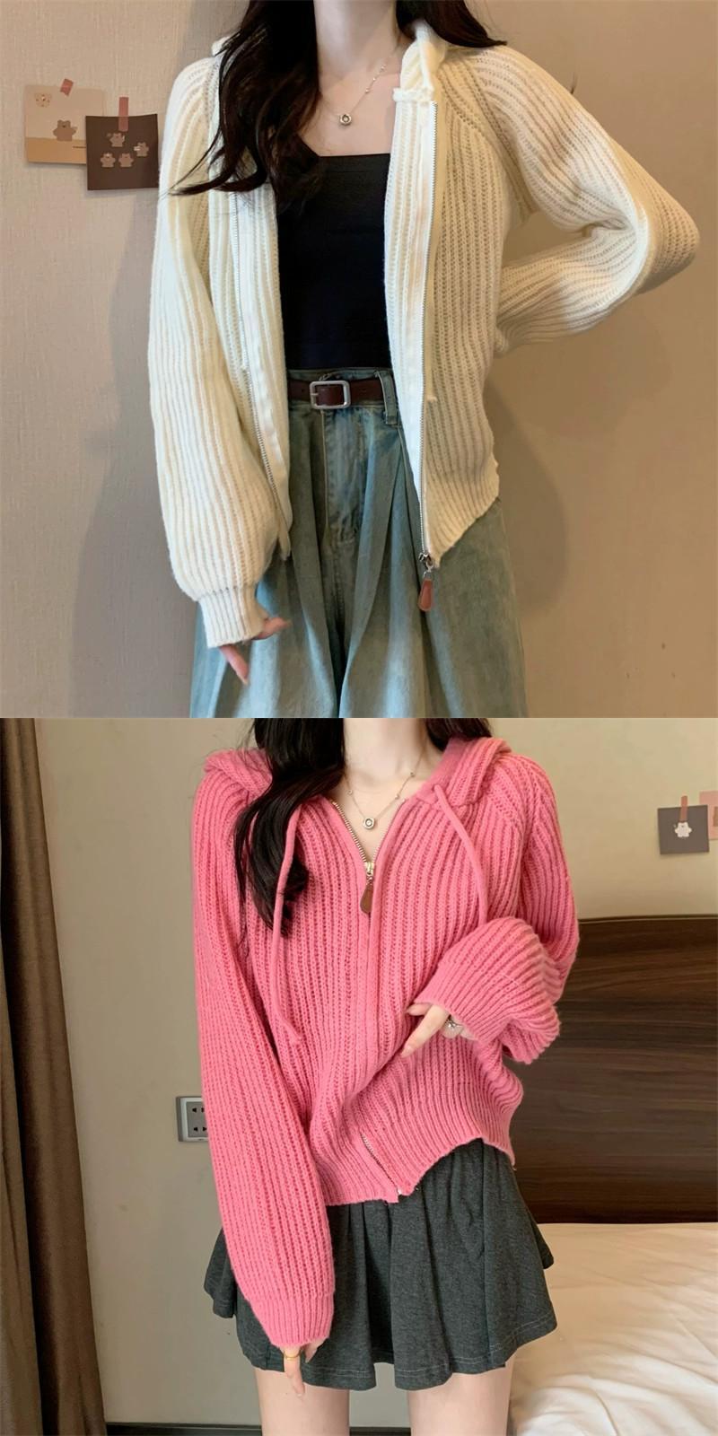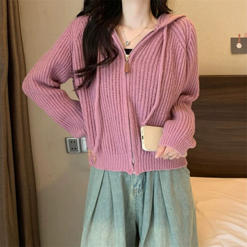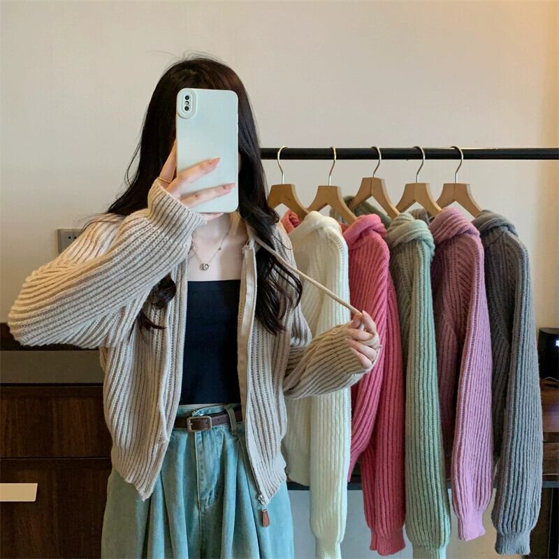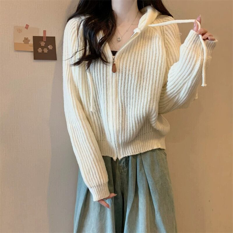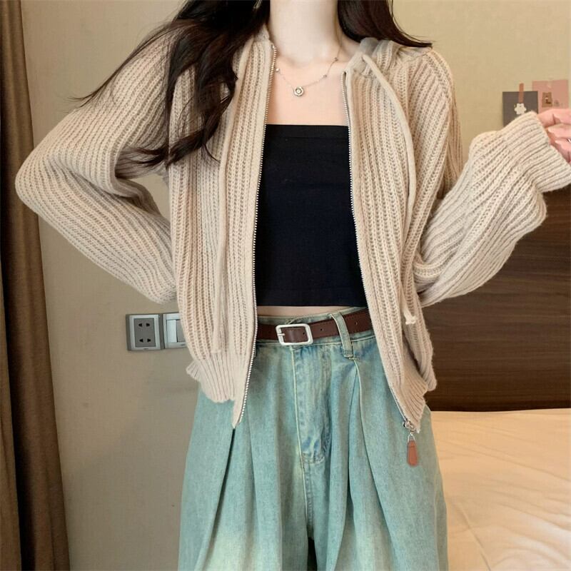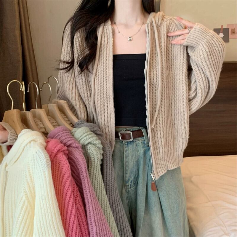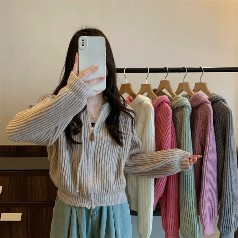 ジッパーショートフード付きカーディガンセーターコート女性の秋と冬のレトロなルーズアウターウェア太いライン暖かい長袖セーター ロング オータム 秋物 ウィンター 冬物 746007704240613 | framboise21