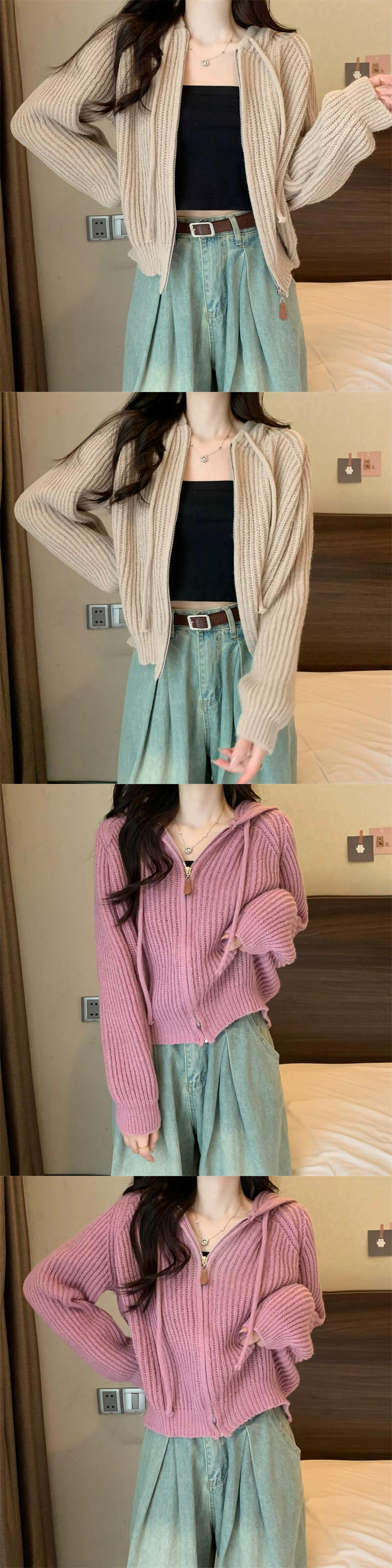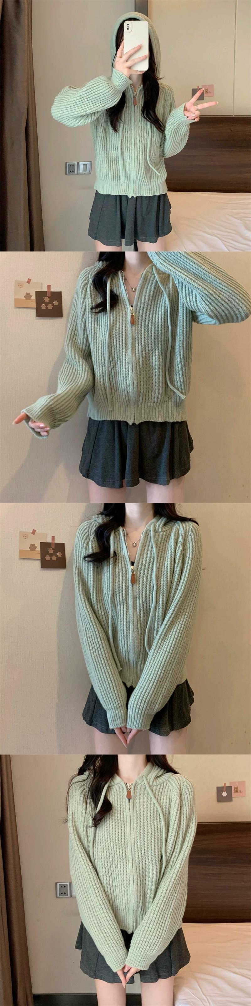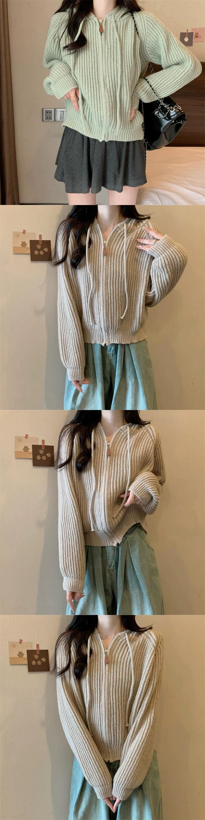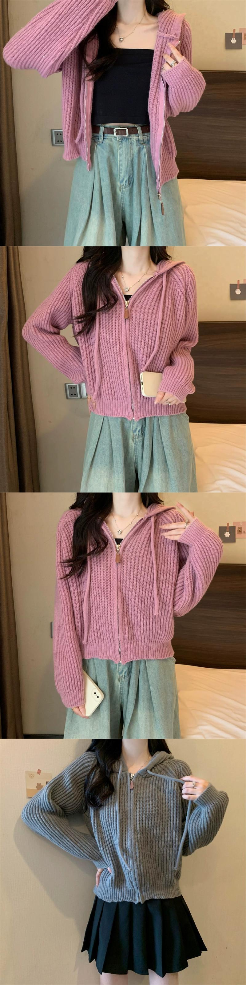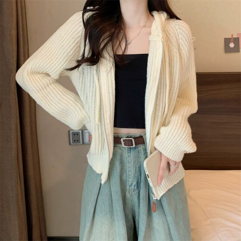 ジッパーショートフード付きカーディガンセーターコート女性の秋と冬のレトロなルーズアウターウェア太いライン暖かい長袖セーター ロング オータム 秋物 ウィンター 冬物 746007704240613 | framboise21