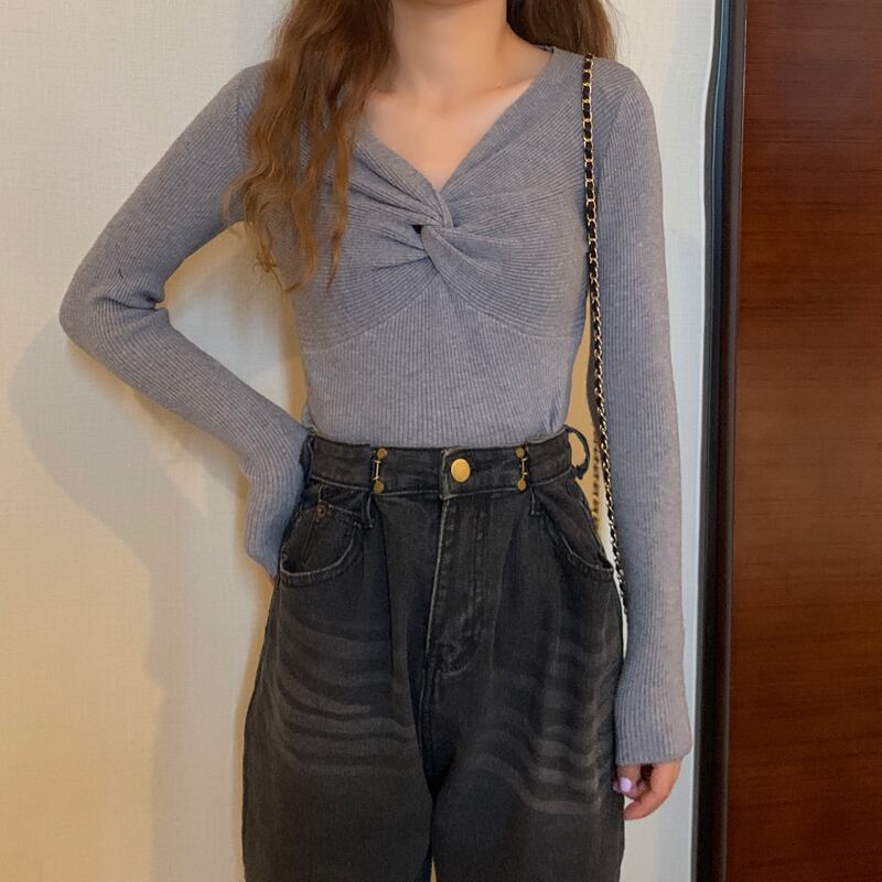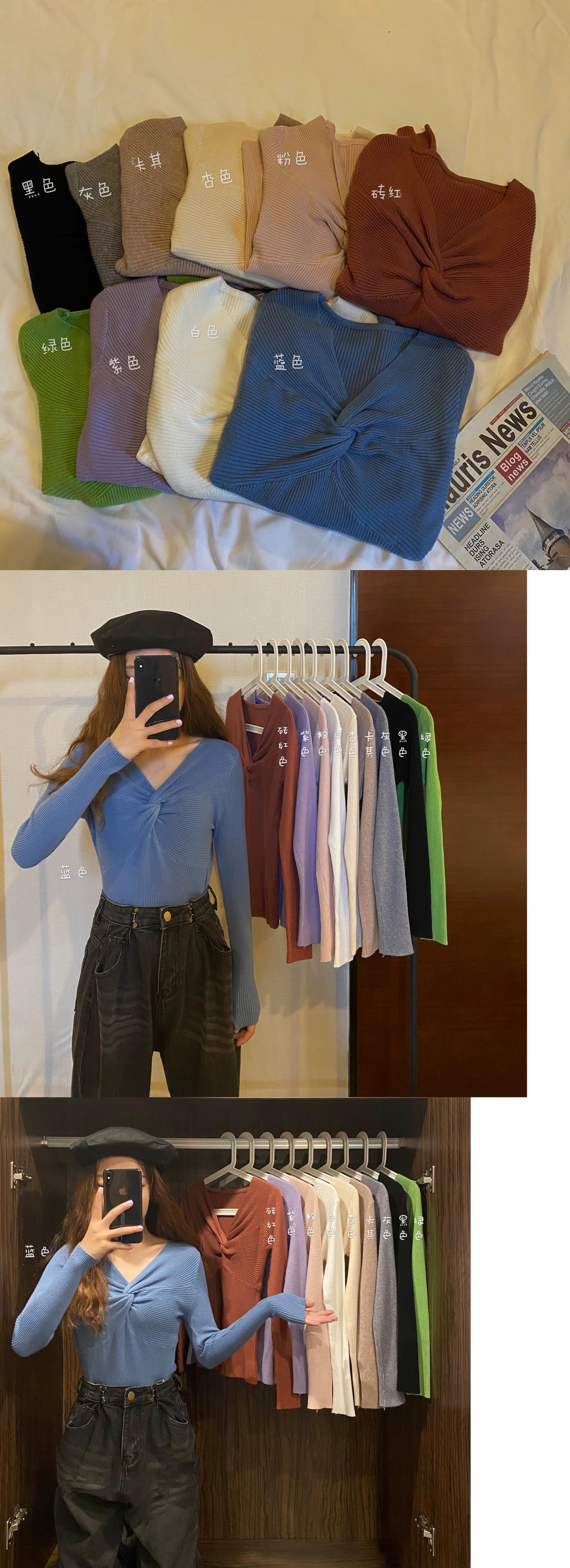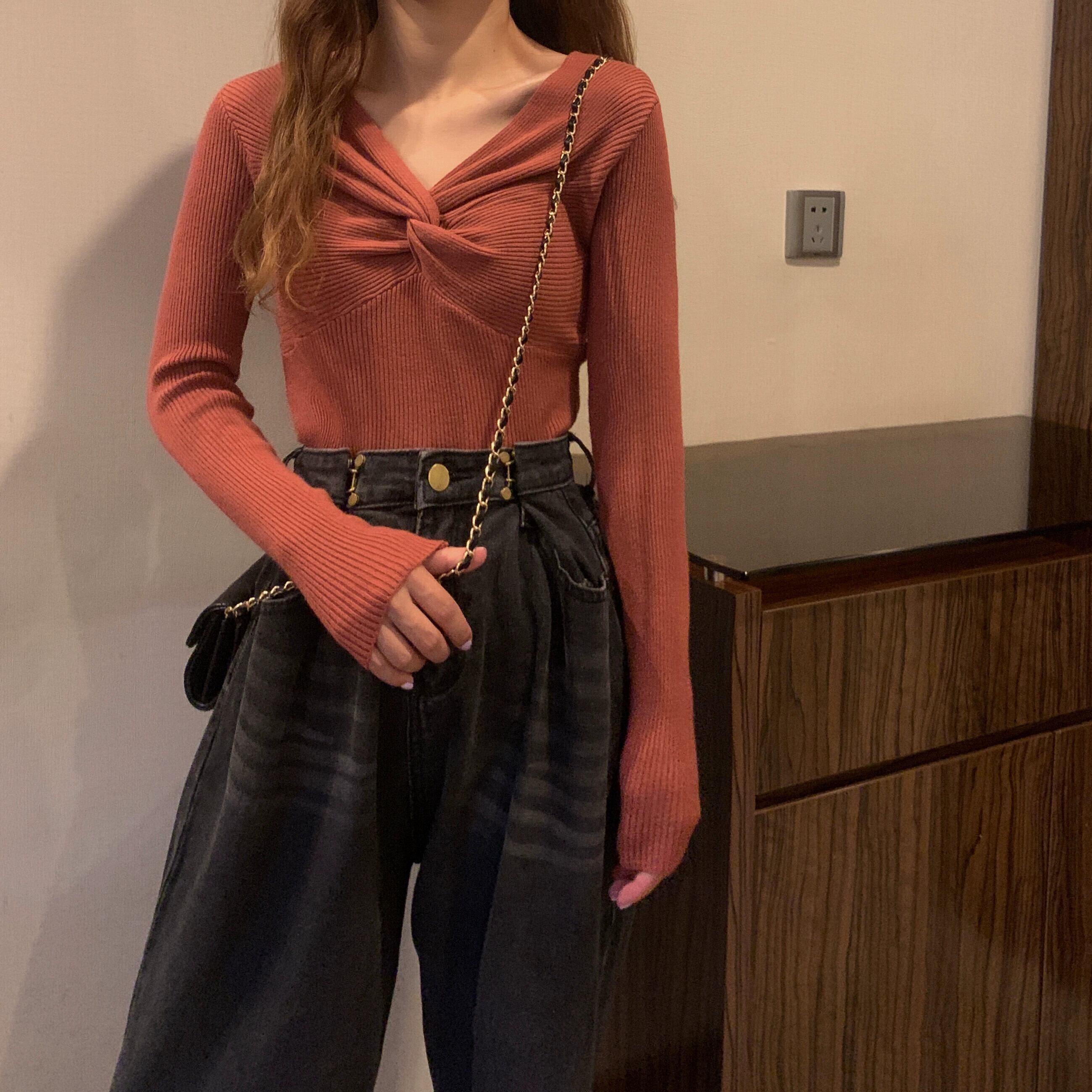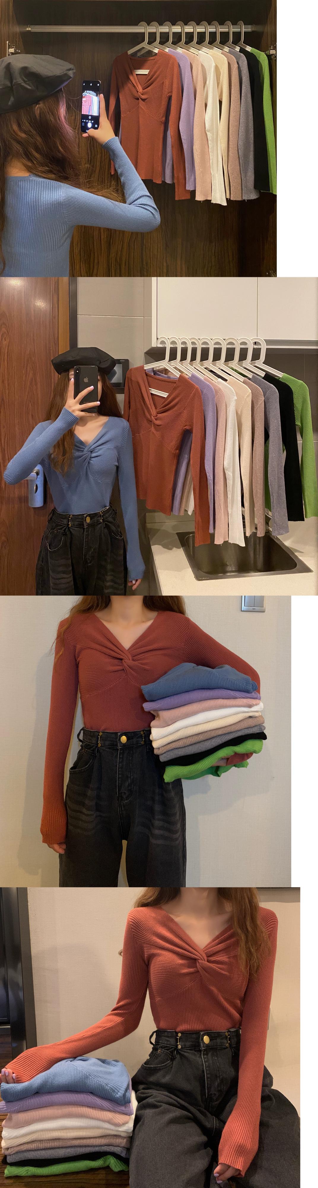 ニットボトムシャツレディース、秋冬スタイル、フレンチデザイン、スリムフィット、ショートツイストVネック長袖セーター ロング オータム 秋物 ウィンター 冬物 7460064353166371 | framboise21