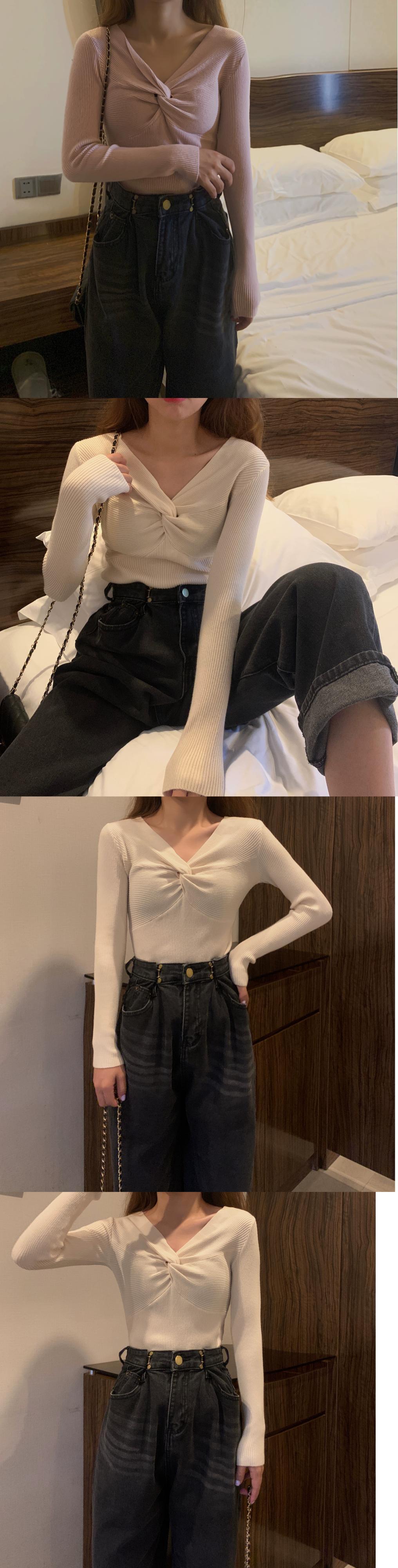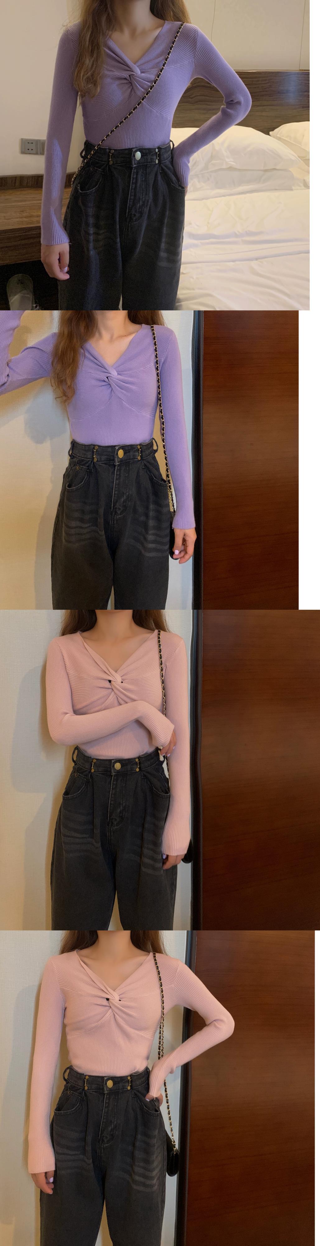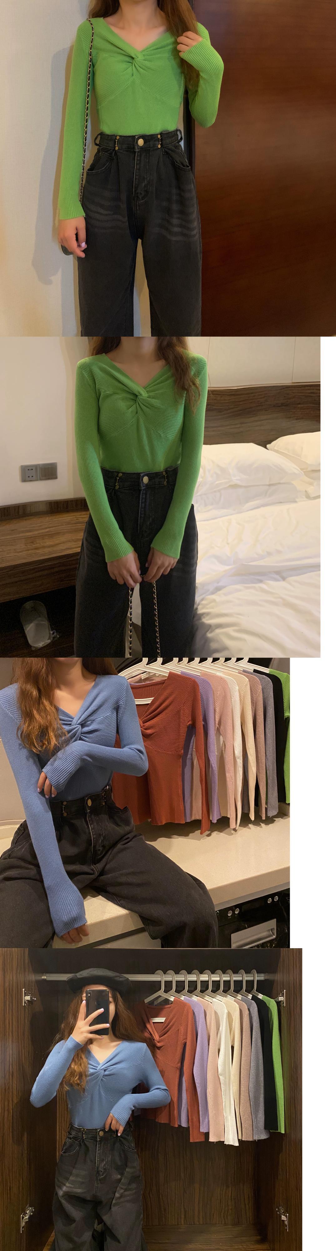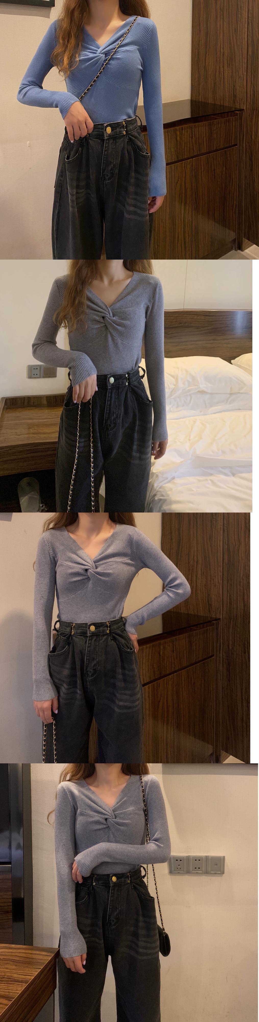 ニットボトムシャツレディース、秋冬スタイル、フレンチデザイン、スリムフィット、ショートツイストVネック長袖セーター ロング オータム 秋物 ウィンター 冬物 7460064353166371 | framboise21
