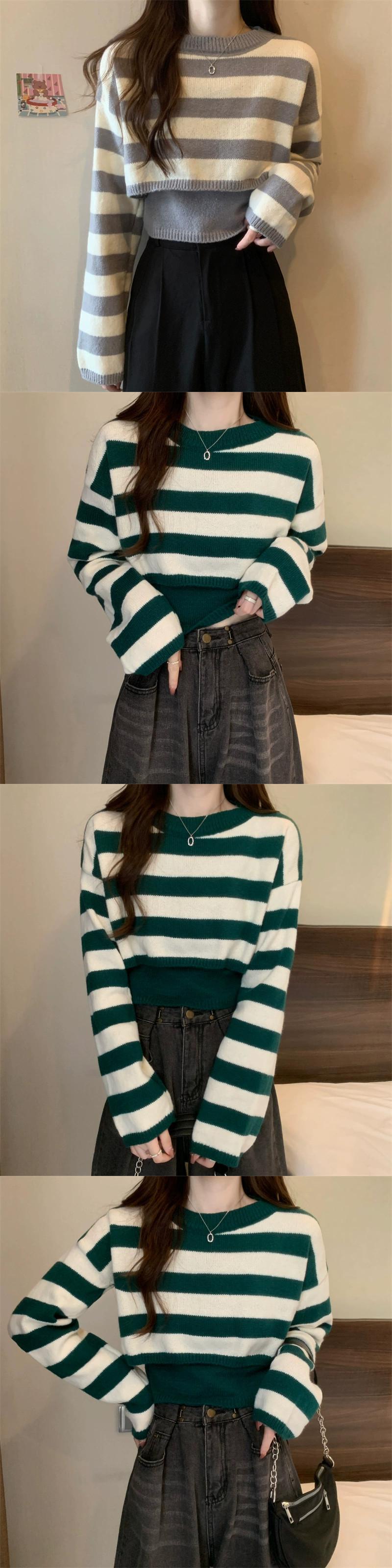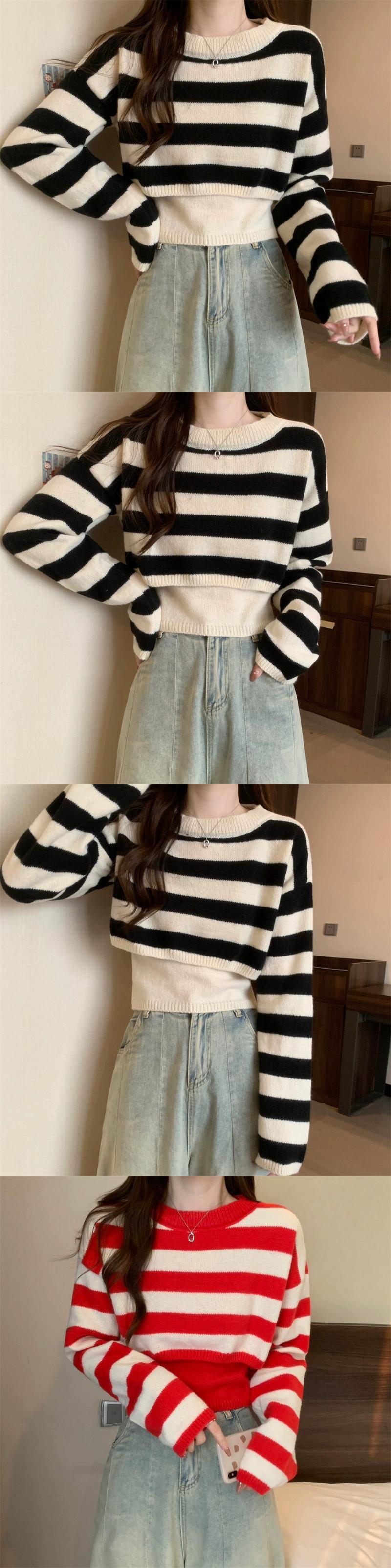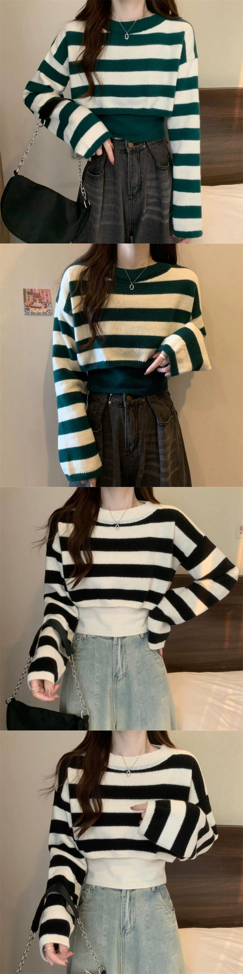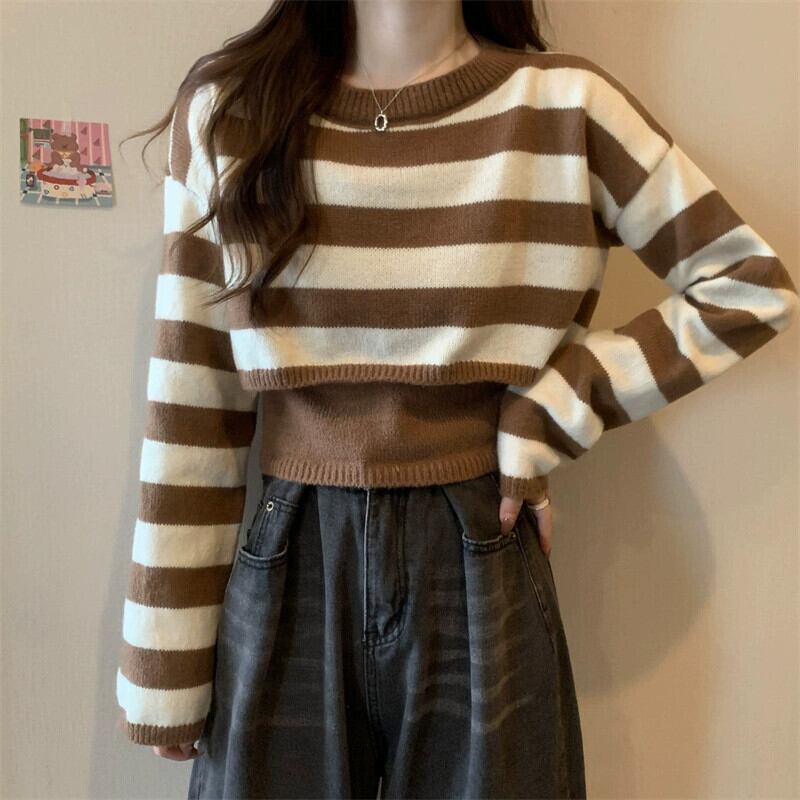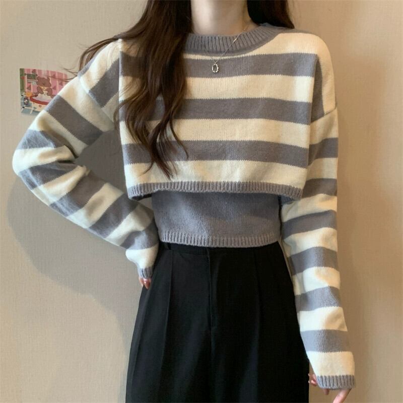 ストライプショートセーターレディース秋冬レトロデザインゆったりアウターショートニットサスペンダートップ2点セット オータム 秋物 ウィンター 冬物 7460078645139528 | framboise21