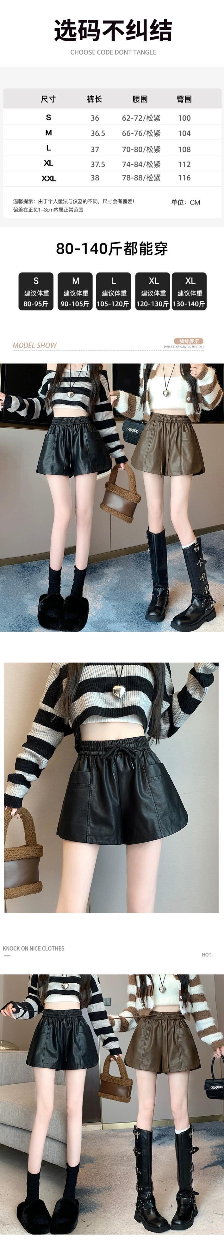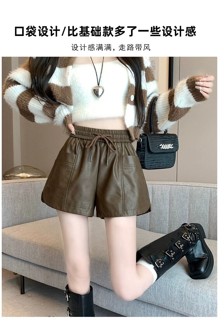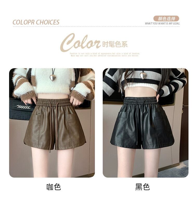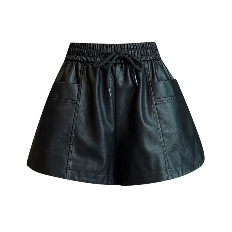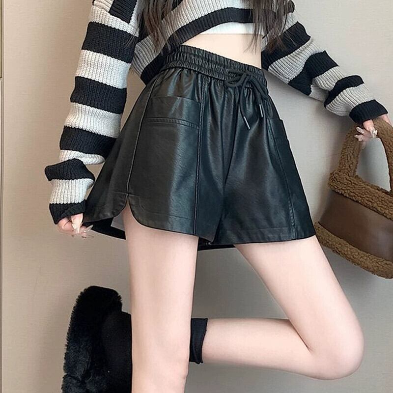 黒の pu レザー パンツ ショート パンツ女性の秋と冬のワイドレッグ パンツ小柄な人々 がカジュアルなルーズ痩身 A ライン ブーツ パンツを着用します。 ブラック オータム 秋物 ウィンター 冬物 ショーツ ブルマー Aライン 7460096062524693 | framboise21