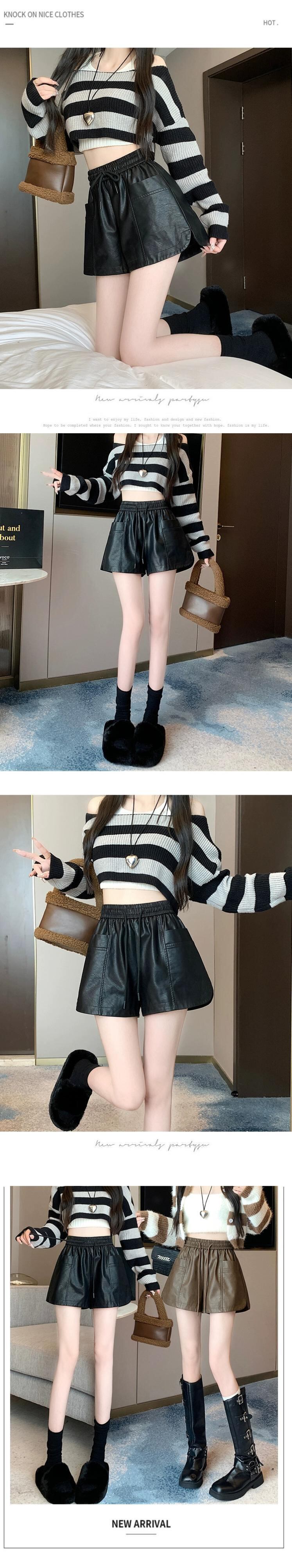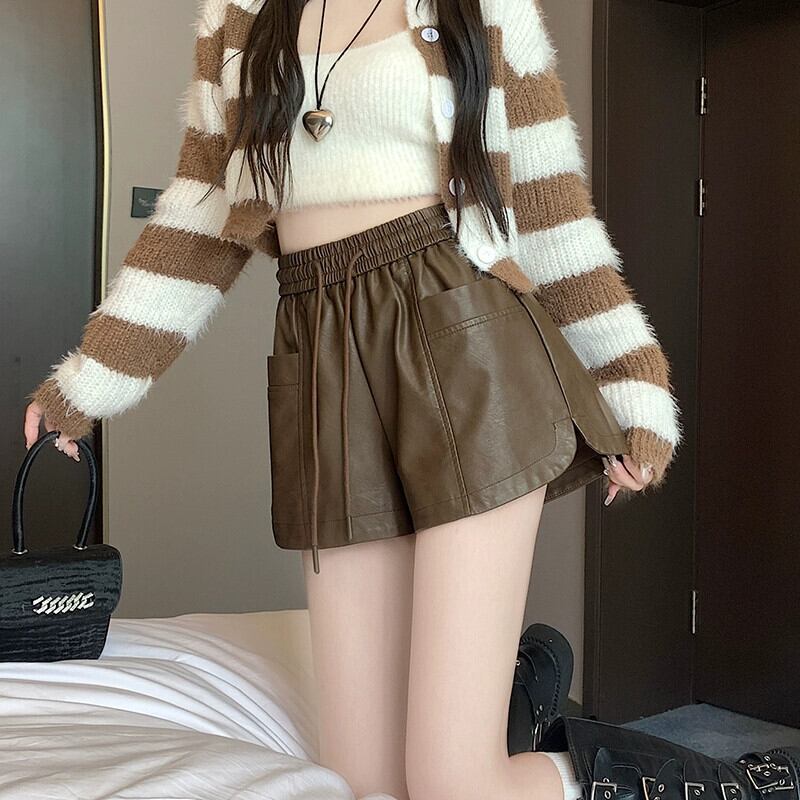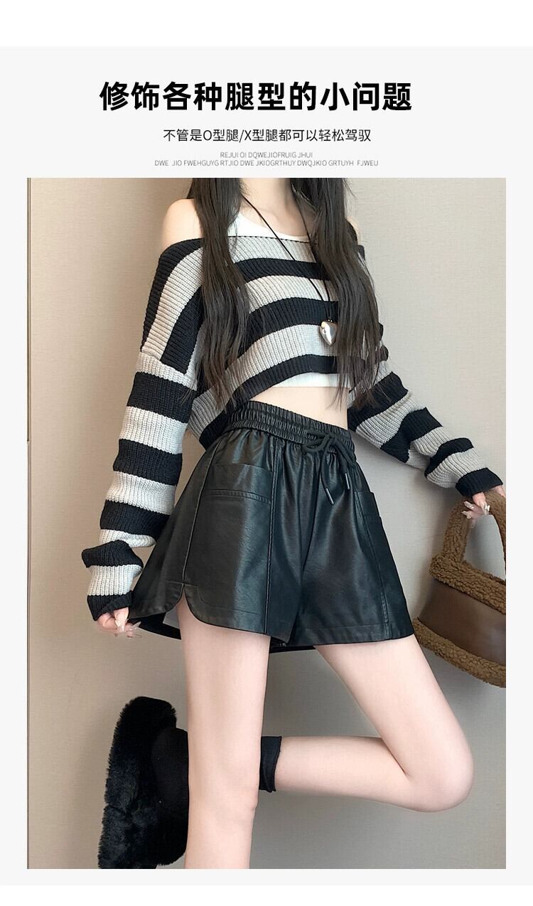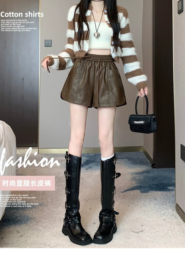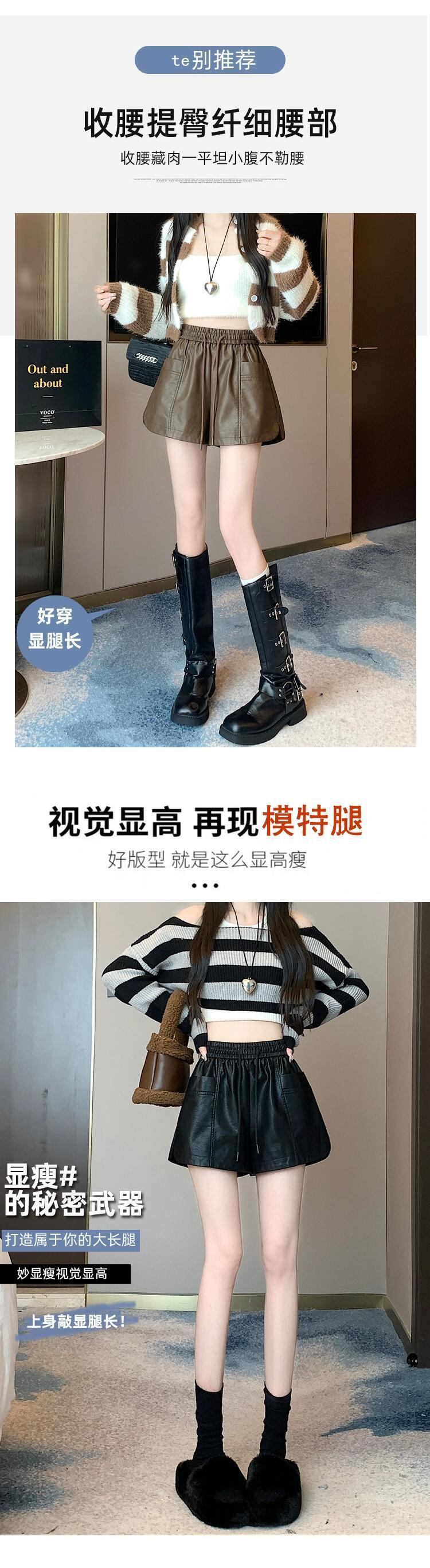 黒の pu レザー パンツ ショート パンツ女性の秋と冬のワイドレッグ パンツ小柄な人々 がカジュアルなルーズ痩身 A ライン ブーツ パンツを着用します。 ブラック オータム 秋物 ウィンター 冬物 ショーツ ブルマー Aライン 7460096062524693 | framboise21