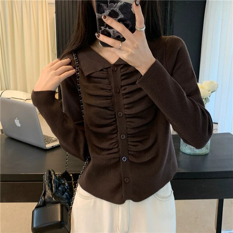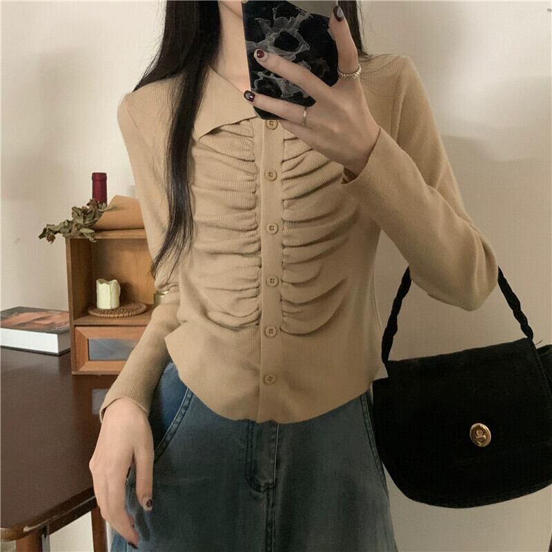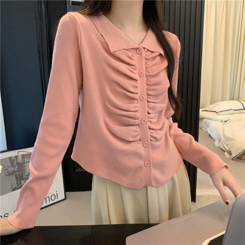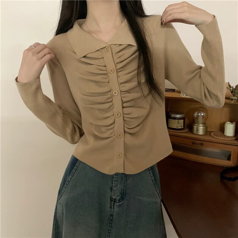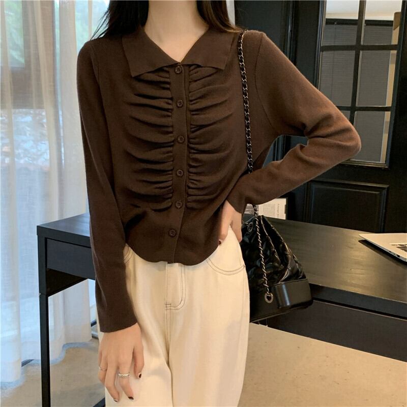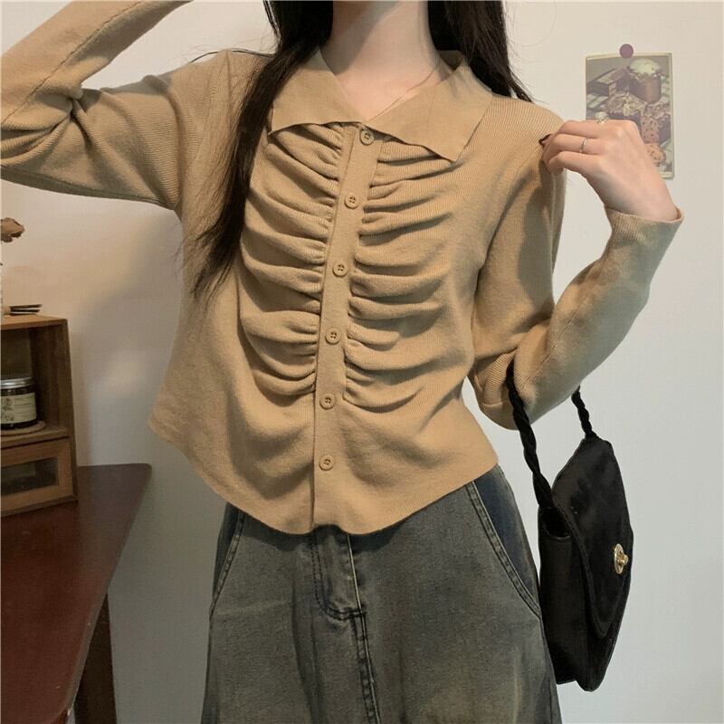不規則なショートニットカーディガンジャケットの女性の秋と冬の西洋スタイルと緩いアウターウェアのプリーツポロカラーセーター オータム 秋物 ウィンター 冬物 7460028129089129 | framboise21