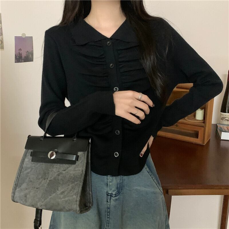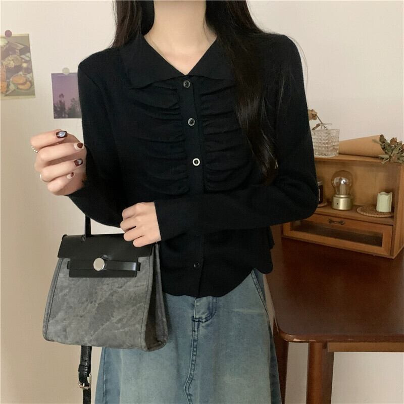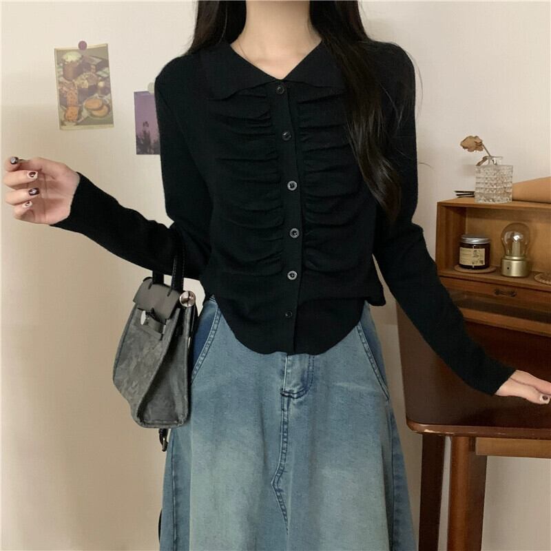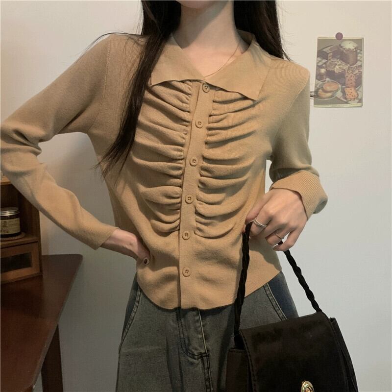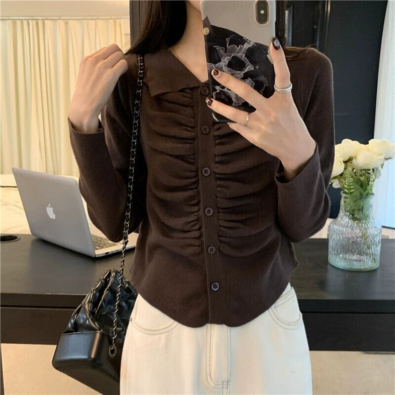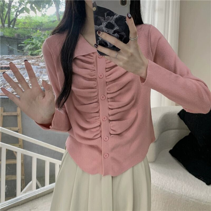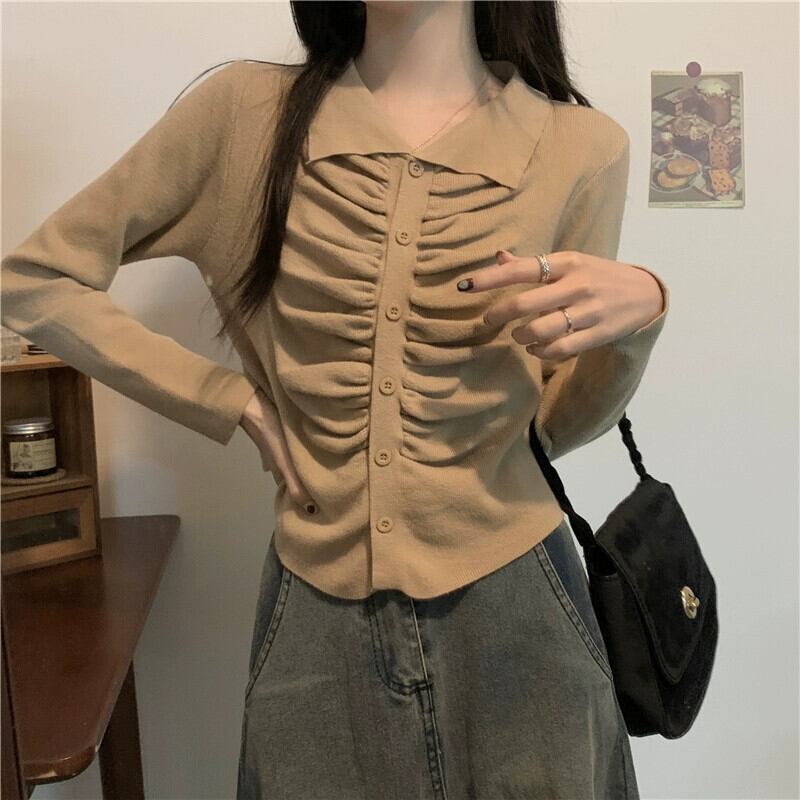 不規則なショートニットカーディガンジャケットの女性の秋と冬の西洋スタイルと緩いアウターウェアのプリーツポロカラーセーター オータム 秋物 ウィンター 冬物 7460028129089129 | framboise21