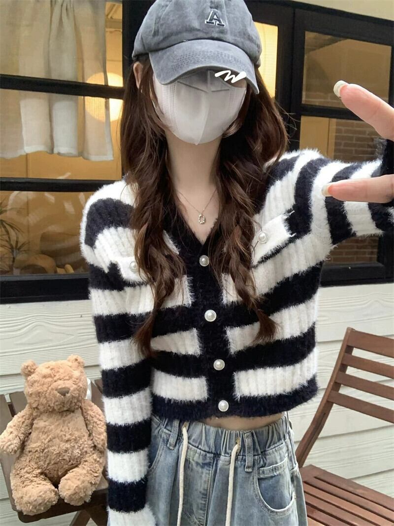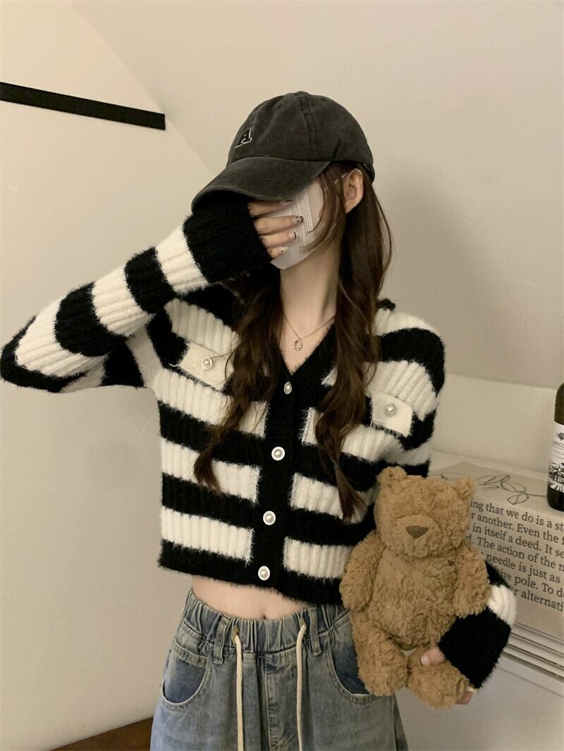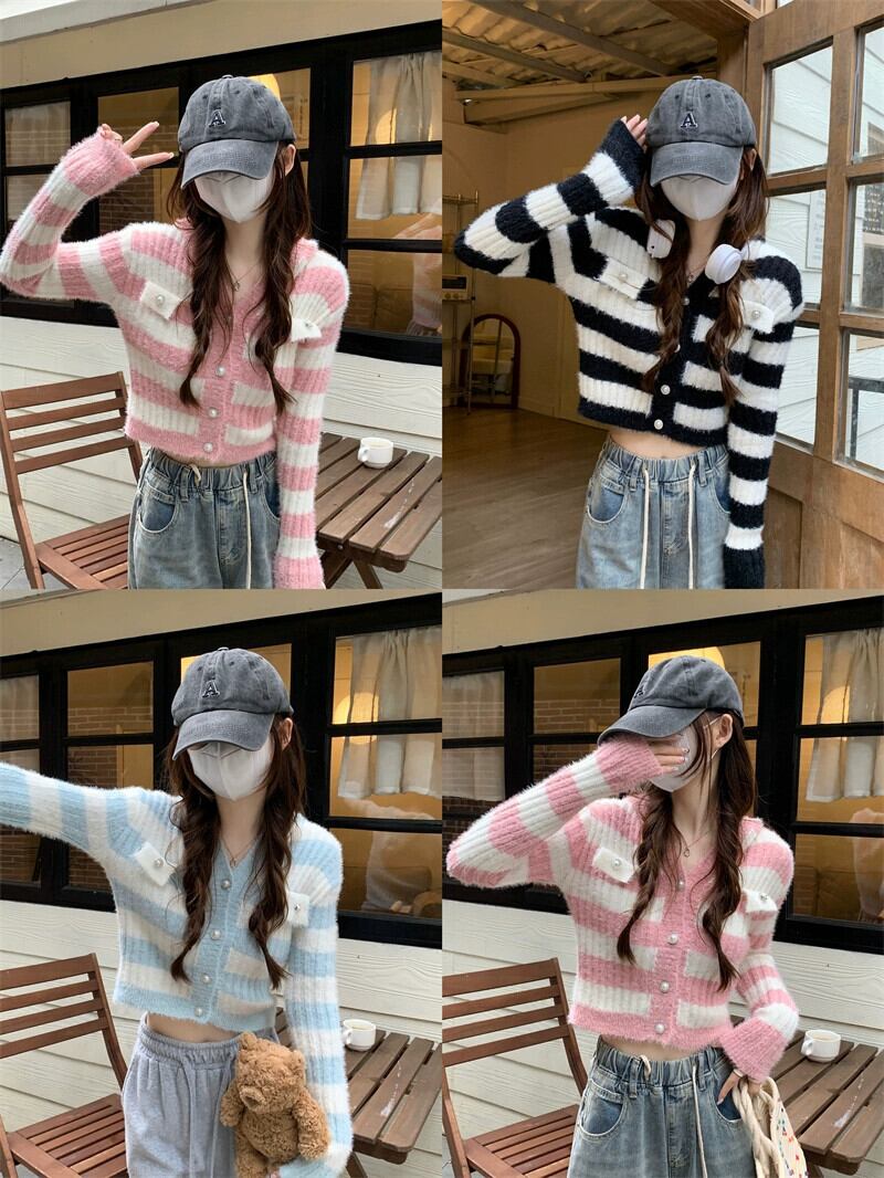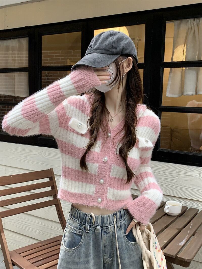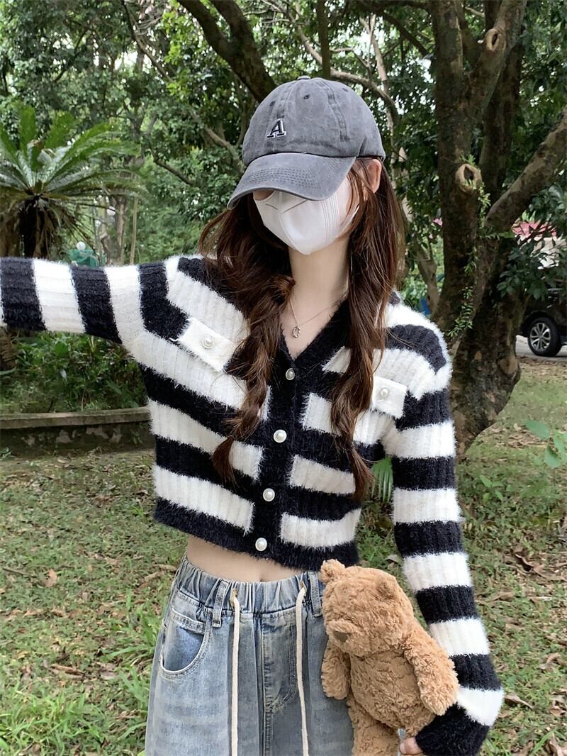 ストライプのフード付きショートカーディガンセータージャケット女性秋と冬の小人は厚く柔らかいワックス状のVネックセーターを着ます オータム 秋物 ウィンター 冬物 7460070328390522 | framboise21